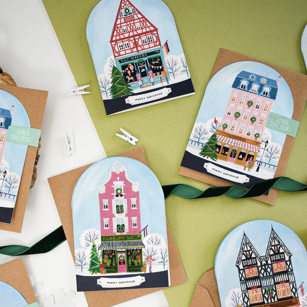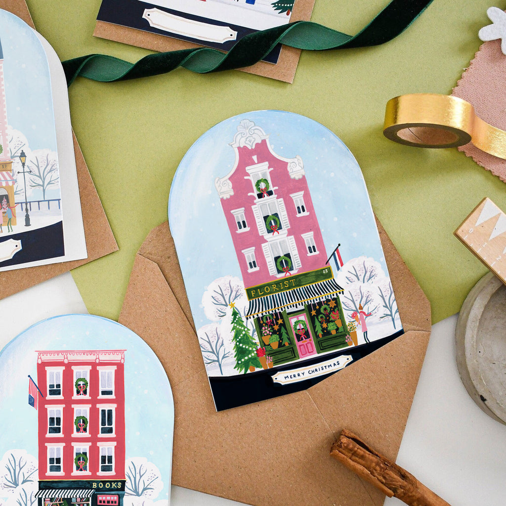 A vibrant illustrated design featuring a Dutch Florist at Christmas. Created from an original Acrylic painting by Amber Davenport.