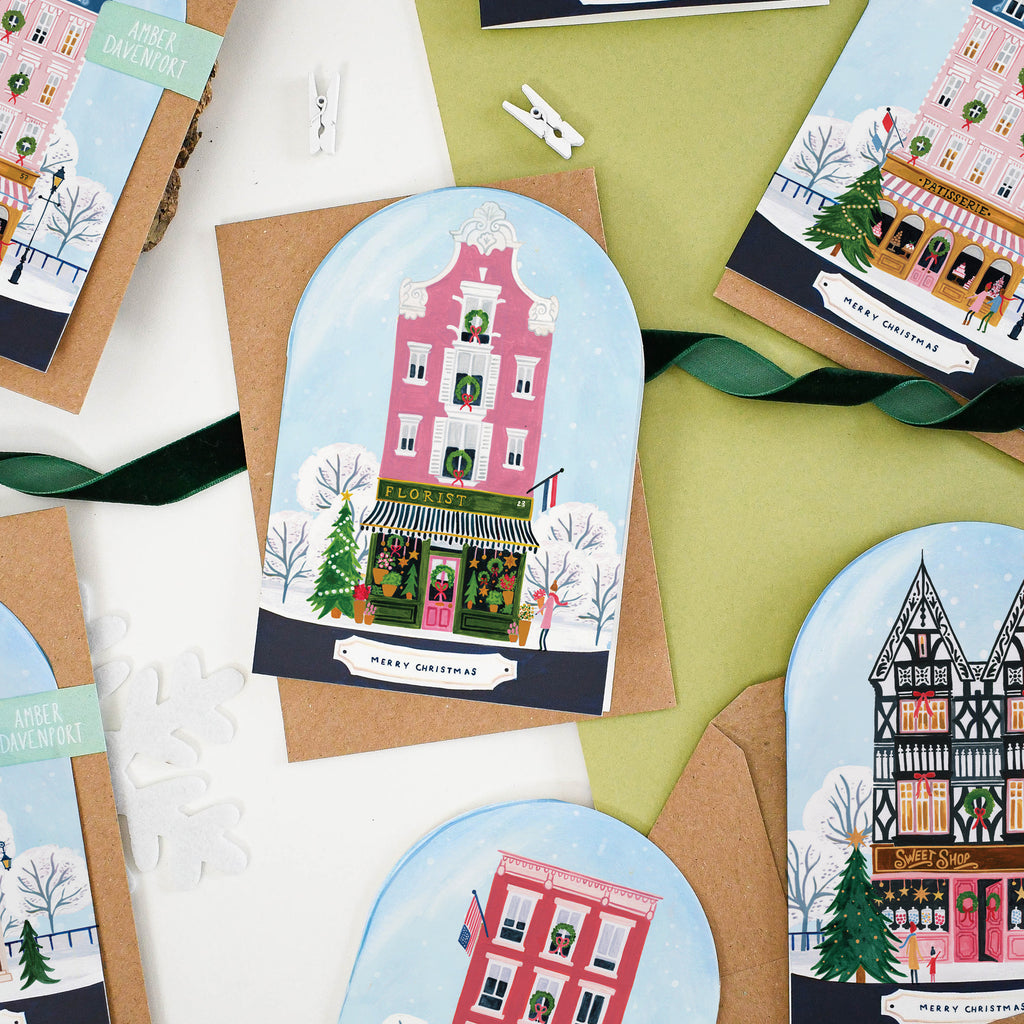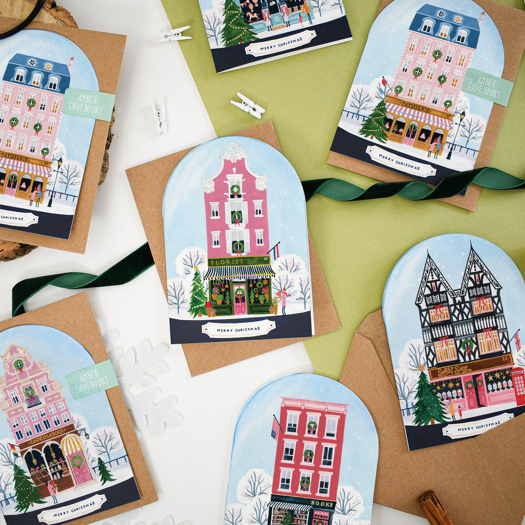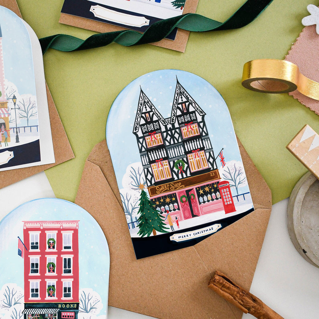 A vibrant illustrated design featuring a London Sweetshop at Christmas. Created from an original Acrylic painting by Amber Davenport.