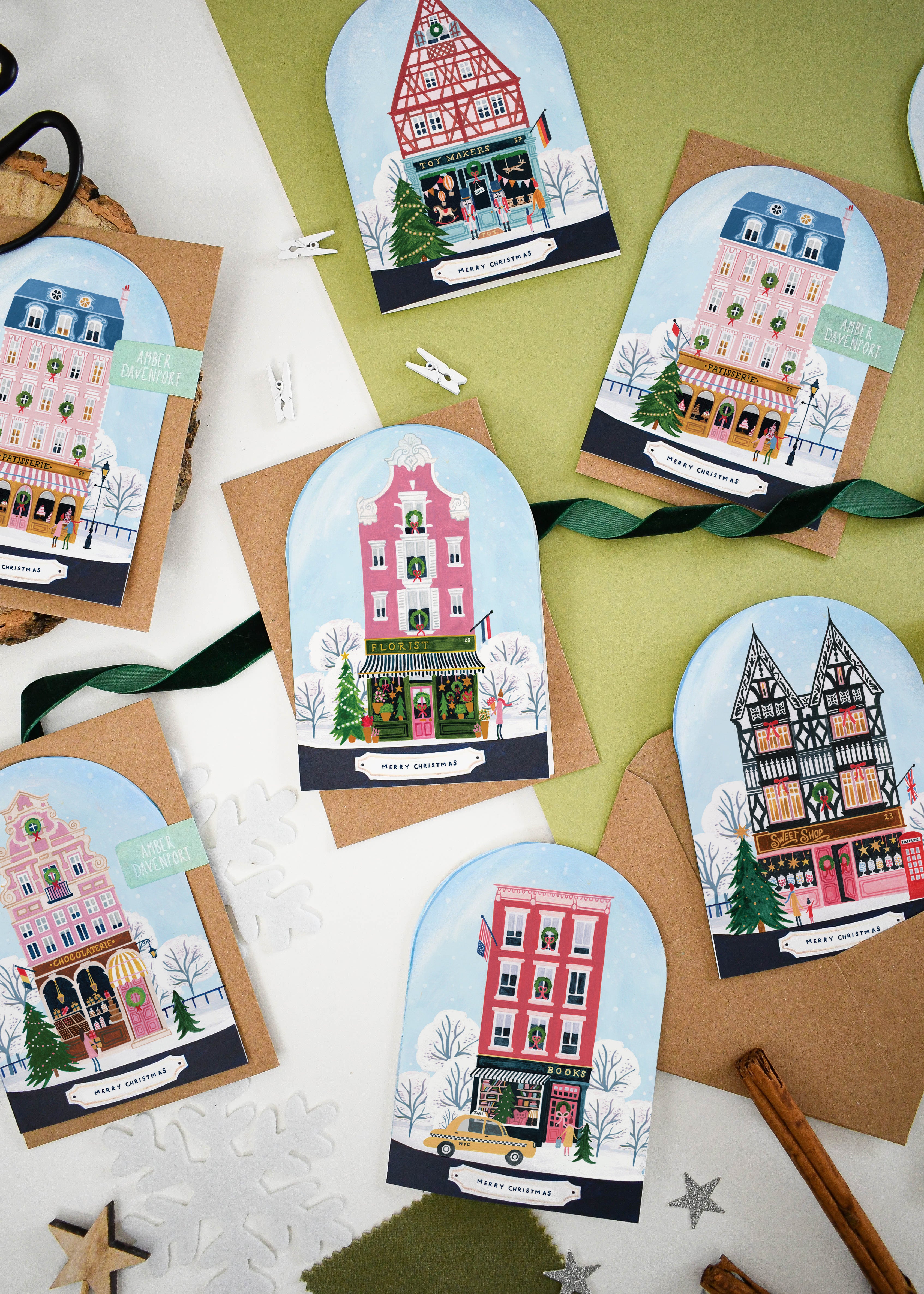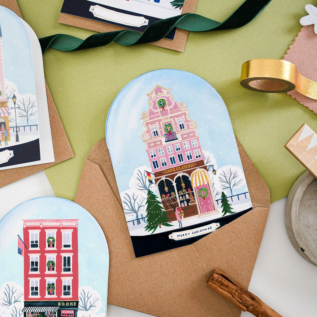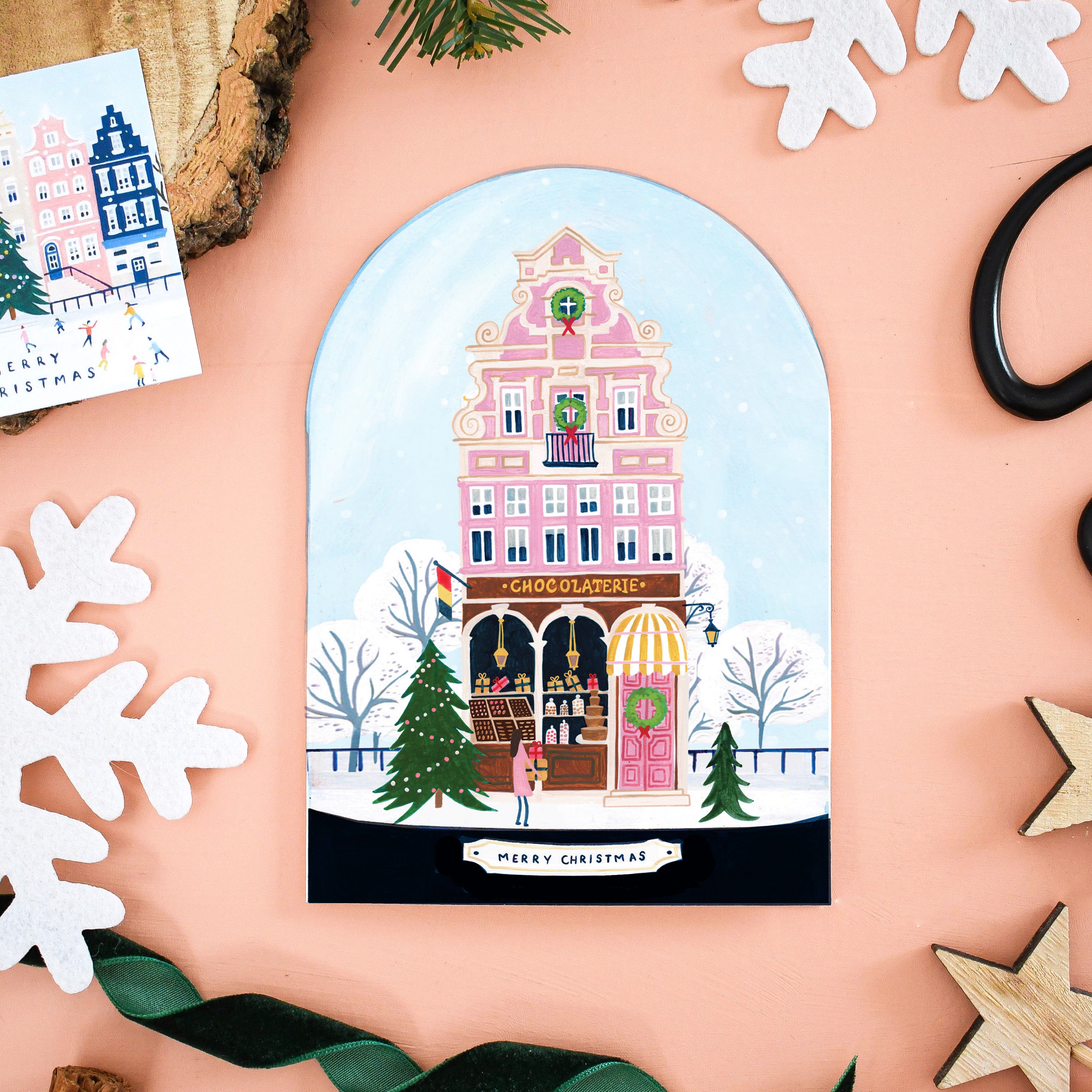 A vibrant illustrated design featuring a Belgian Chocolatier at Christmas. Created from an original Acrylic painting by Amber Davenport.