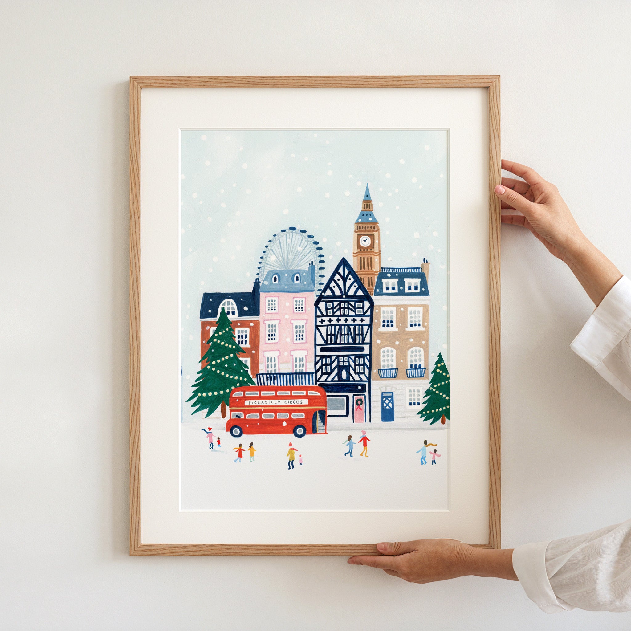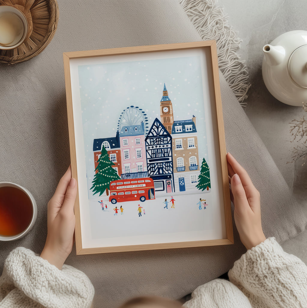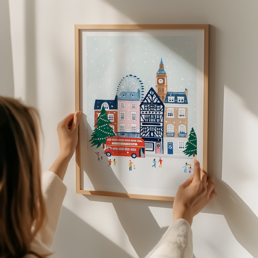 Celebrate the magic of the season with this London Christmas print, a festive Christmas wall art piece featuring a snowy London street, Big Ben, a classic red bus, and people Christmas shopping beneath twinkling lights. This cosy England poster brings the charm of the city to life, making it perfect for apartment or kitchen wall art, or as part of a winter gallery wall. A lovely travel poster for anyone who adores London at Christmas.