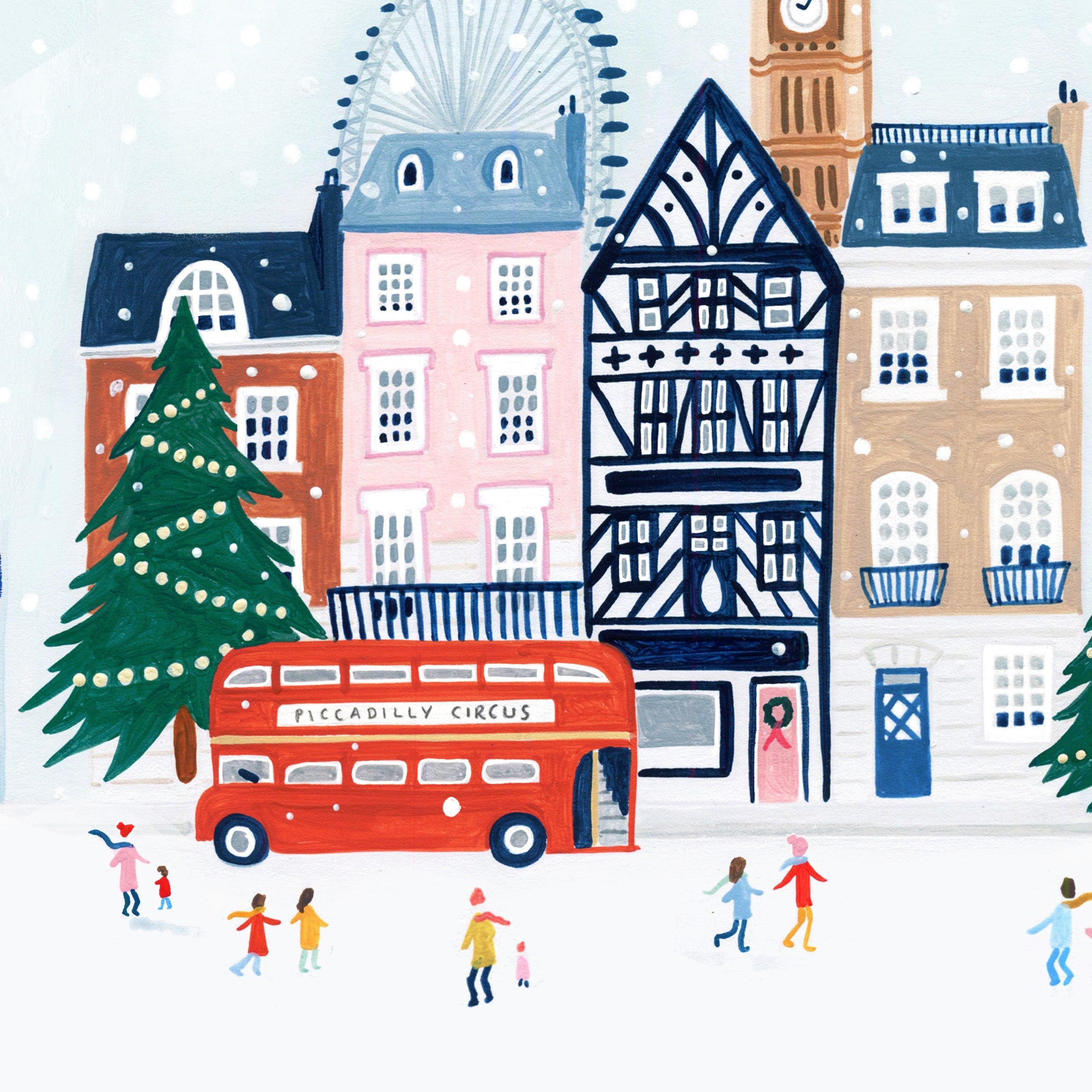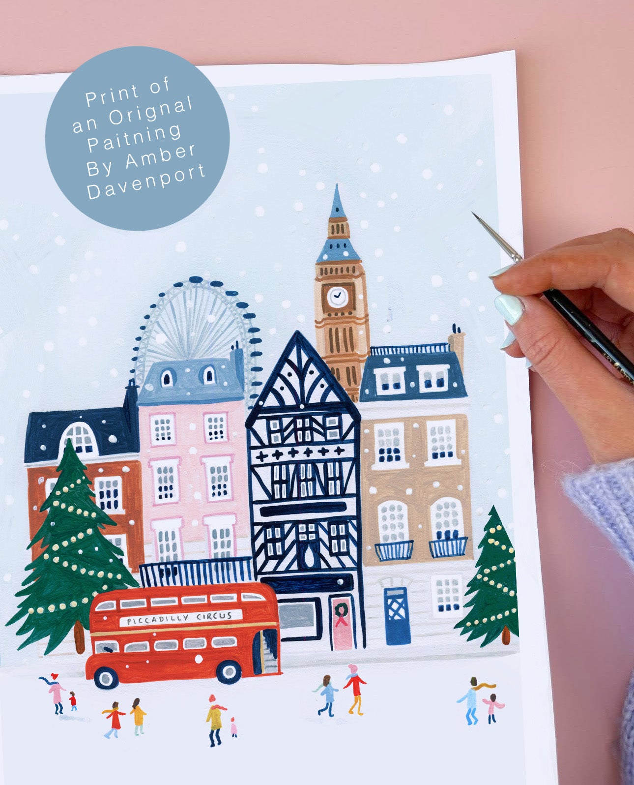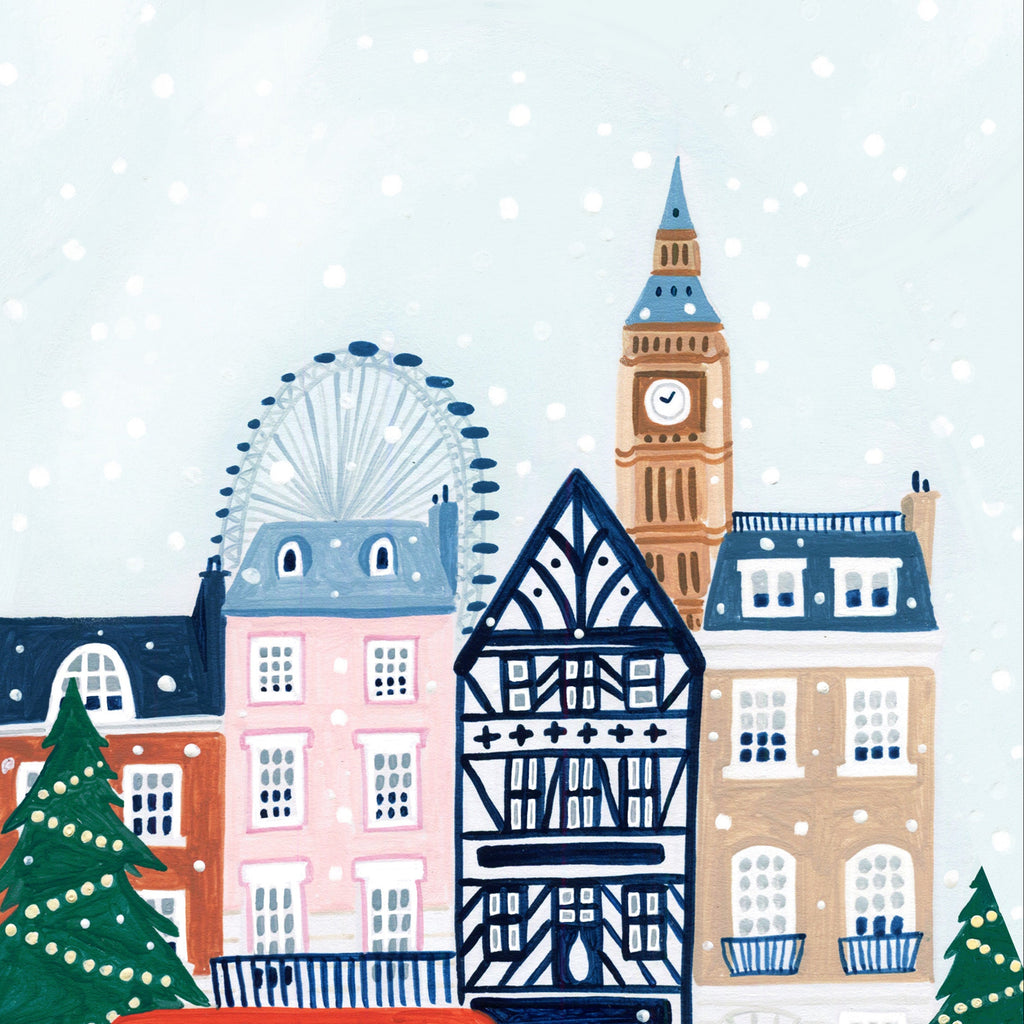 Celebrate the magic of the season with this London Christmas print, a festive Christmas wall art piece featuring a snowy London street, Big Ben, a classic red bus, and people Christmas shopping beneath twinkling lights. This cosy England poster brings the charm of the city to life, making it perfect for apartment or kitchen wall art, or as part of a winter gallery wall. A lovely travel poster for anyone who adores London at Christmas.
