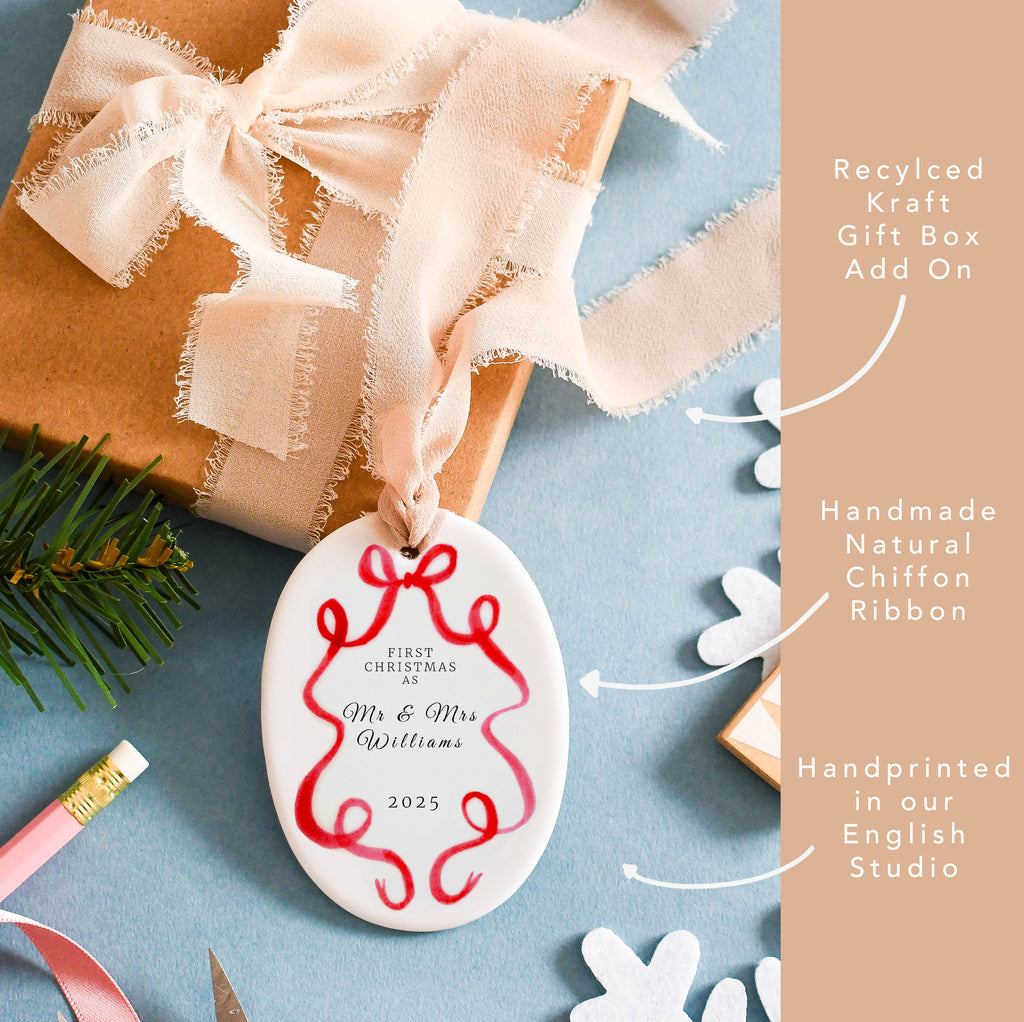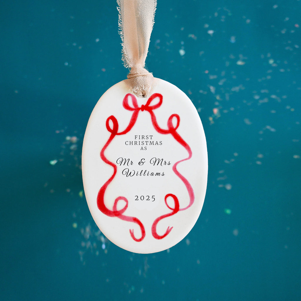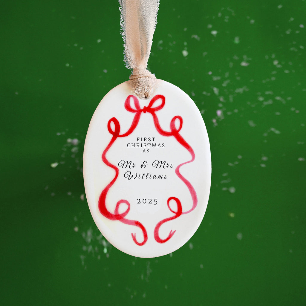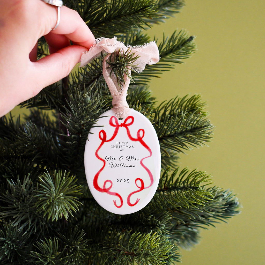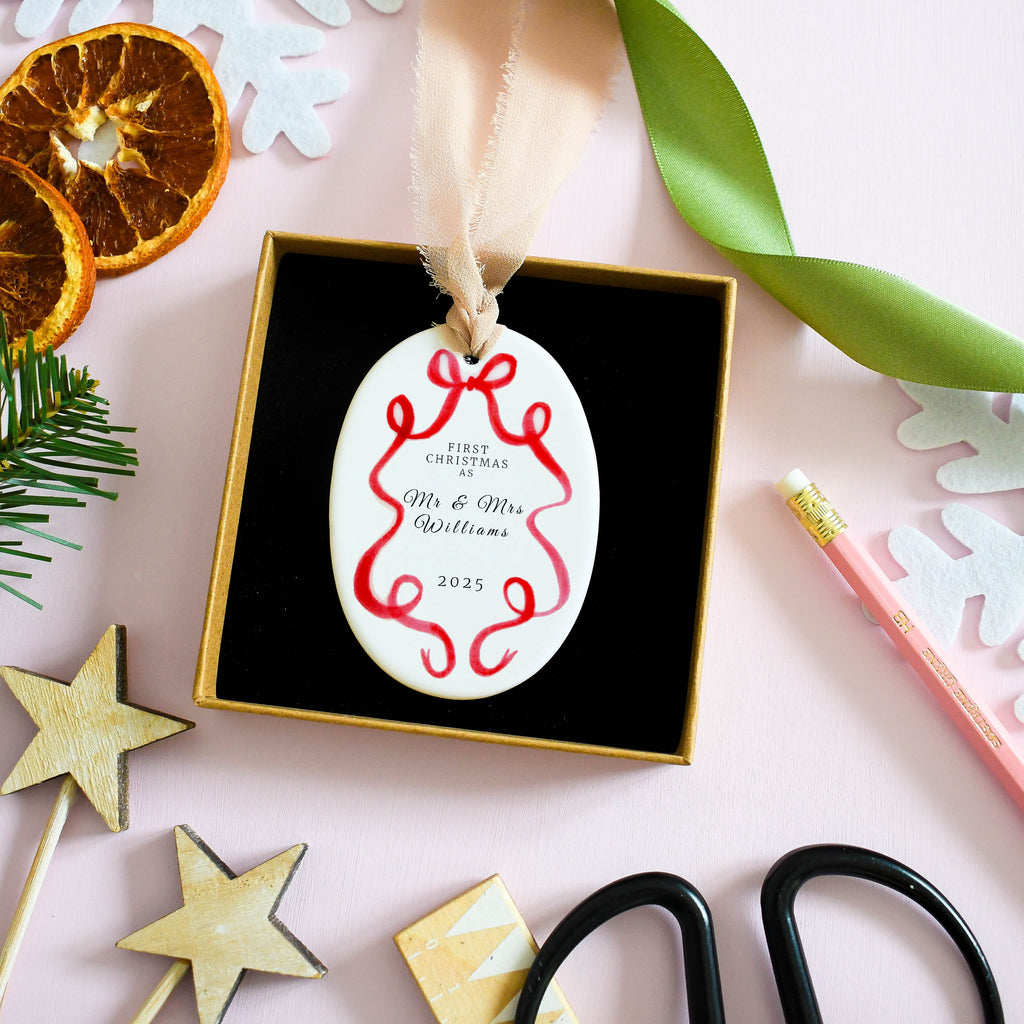 Commemorate a beautiful milestone with this personalized First Christmas as Mr & Mrs ornament – a heartfelt custom bauble designed to celebrate your first holiday season as a married couple. Perfect as a wedding tree decoration, this charming just married keepsake adds a personal touch to your festive decor. A thoughtful and timeless newlyweds couple gift, made to be treasured for years to come.