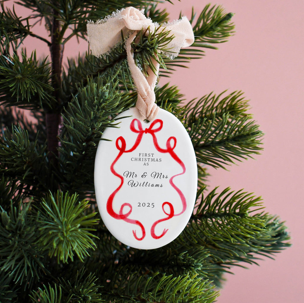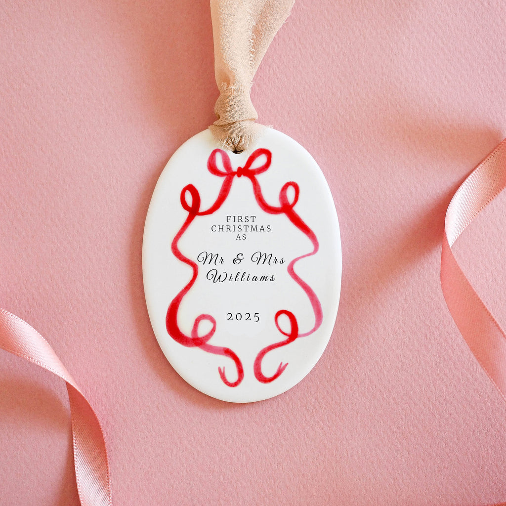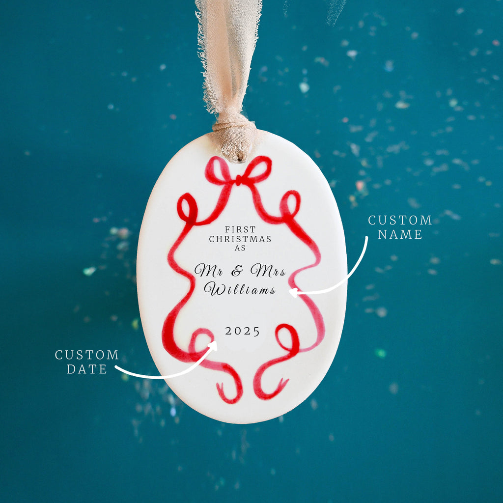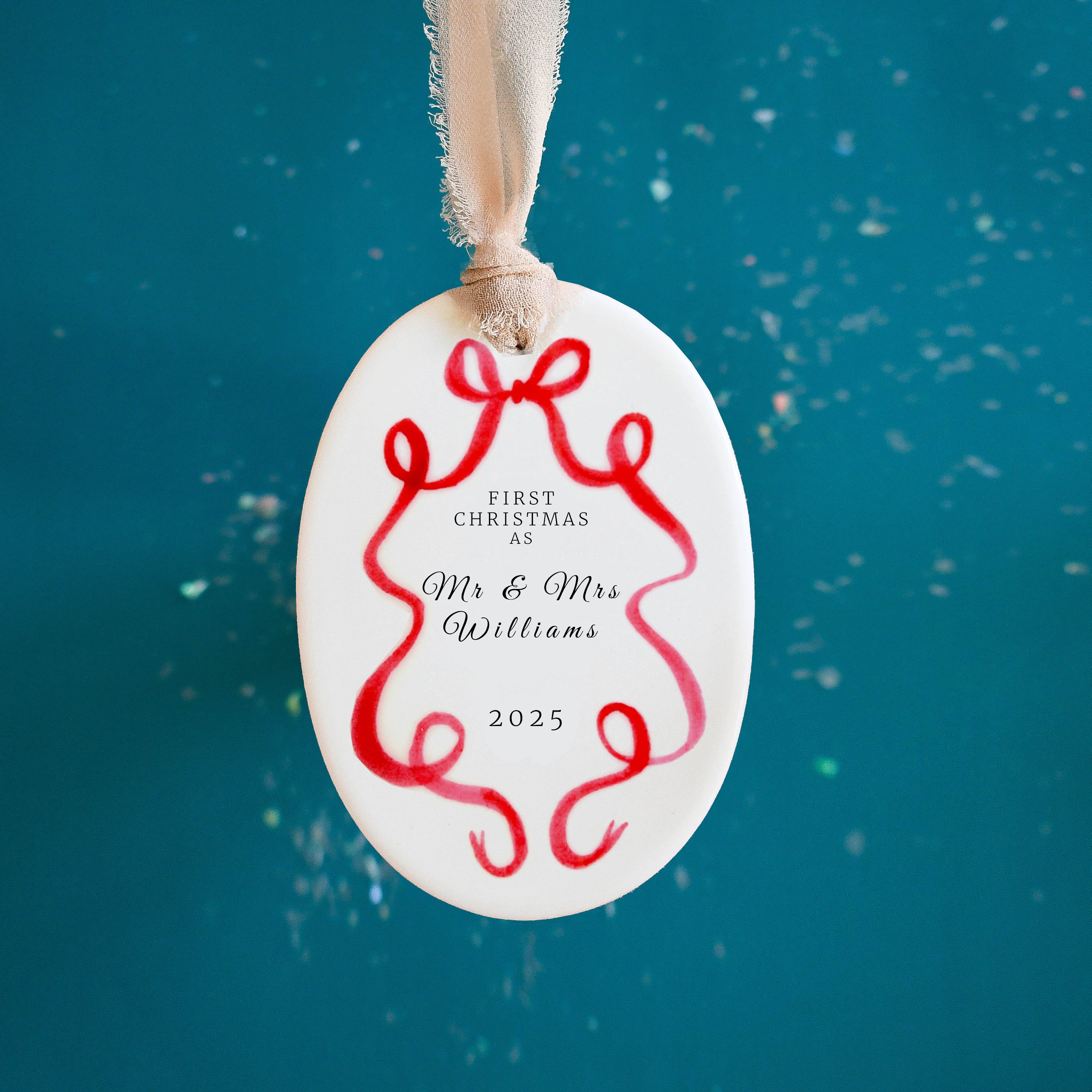 Commemorate a beautiful milestone with this personalized First Christmas as Mr & Mrs ornament – a heartfelt custom bauble designed to celebrate your first holiday season as a married couple. Perfect as a wedding tree decoration, this charming just married keepsake adds a personal touch to your festive decor. A thoughtful and timeless newlyweds couple gift, made to be treasured for years to come.