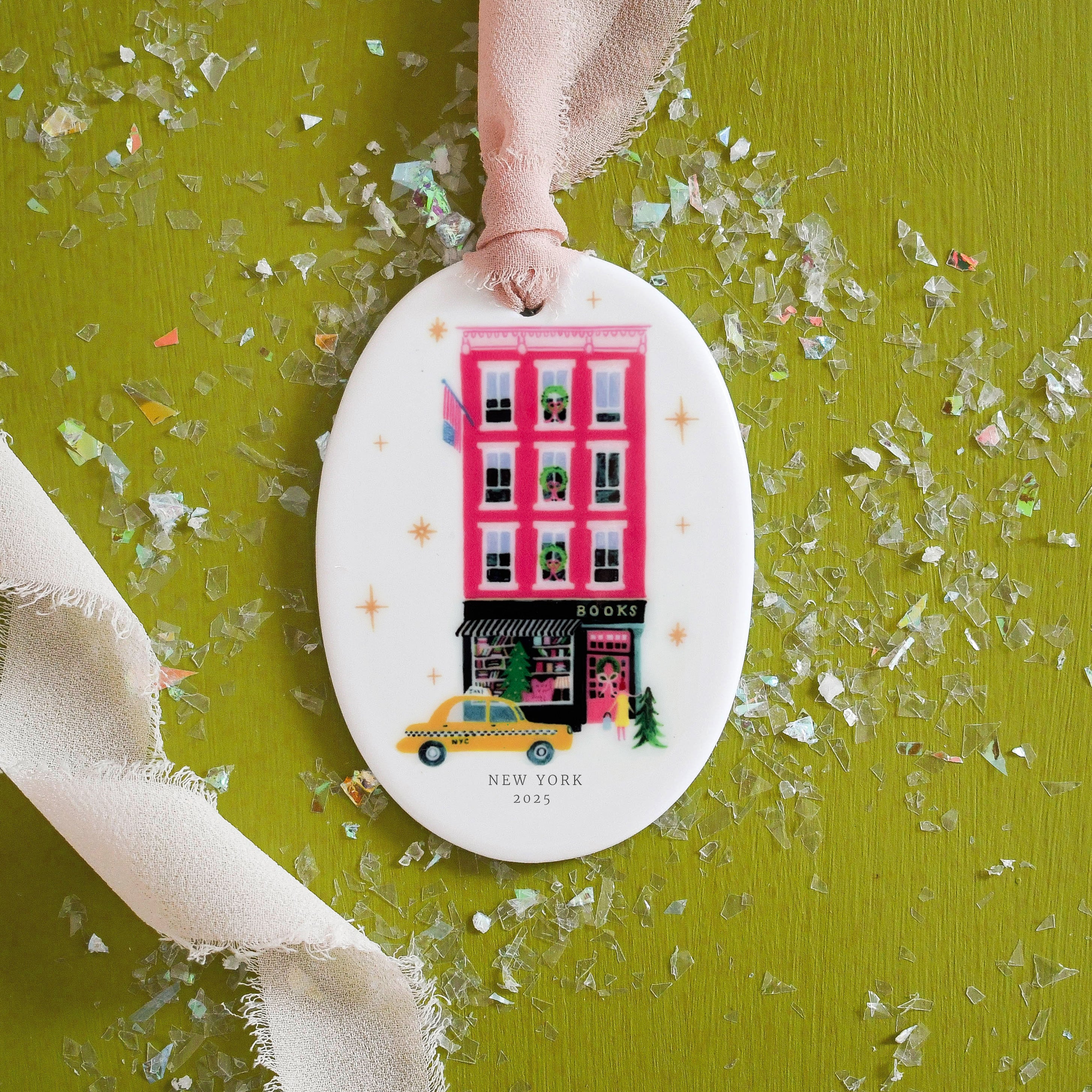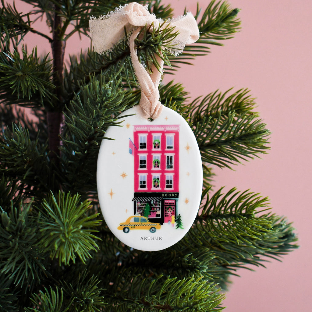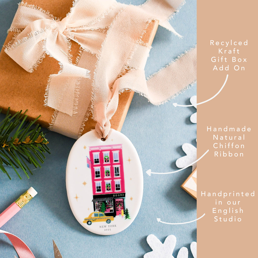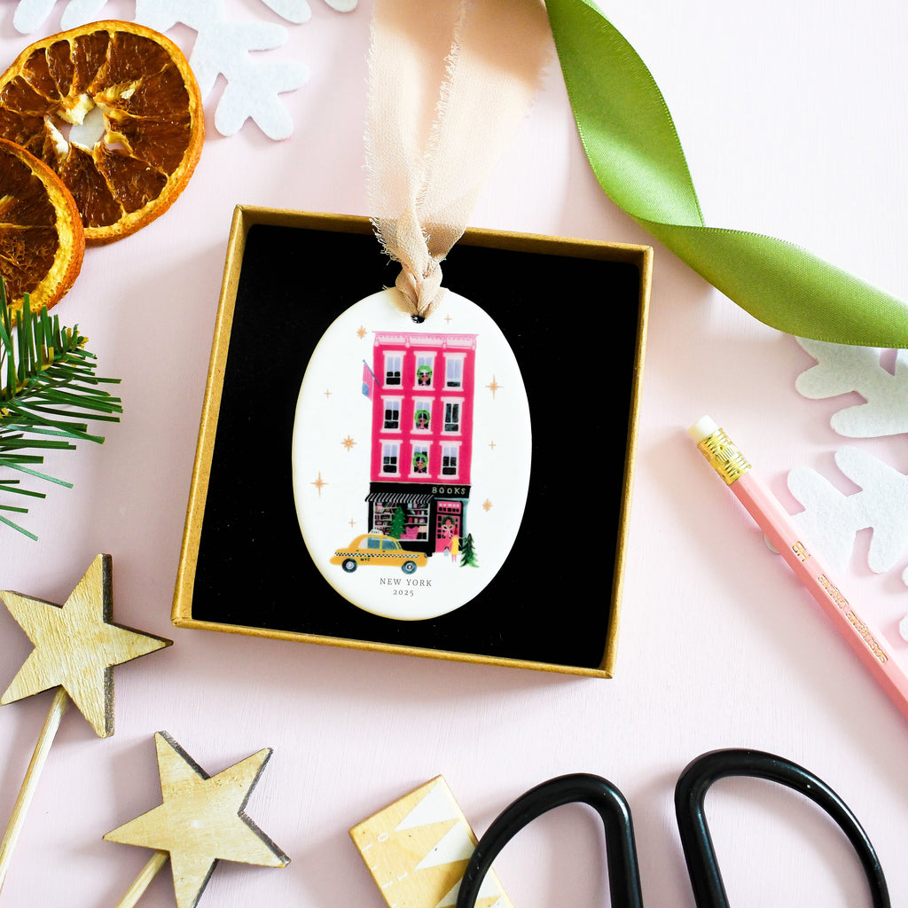 Celebrate the magic of the city that never sleeps with this personalized New York bookstore Christmas ornament – a charming Christmas bauble inspired by classic village houses and the cosy charm of an NYC bookshop in winter. Whether it’s a custom Christmas gift, a couple’s keepsake, or a nostalgic NYC travel ornament, this piece is perfect for book lovers, city dreamers, and holiday romantics. A timeless decoration to treasure year after year.