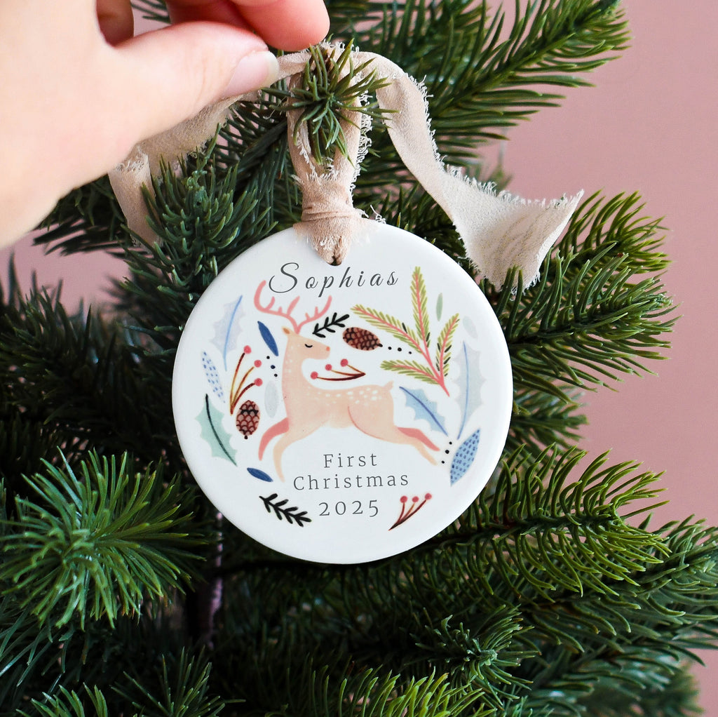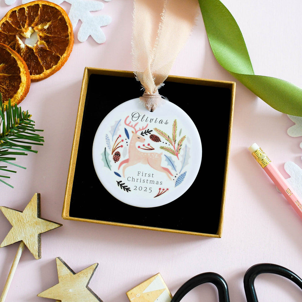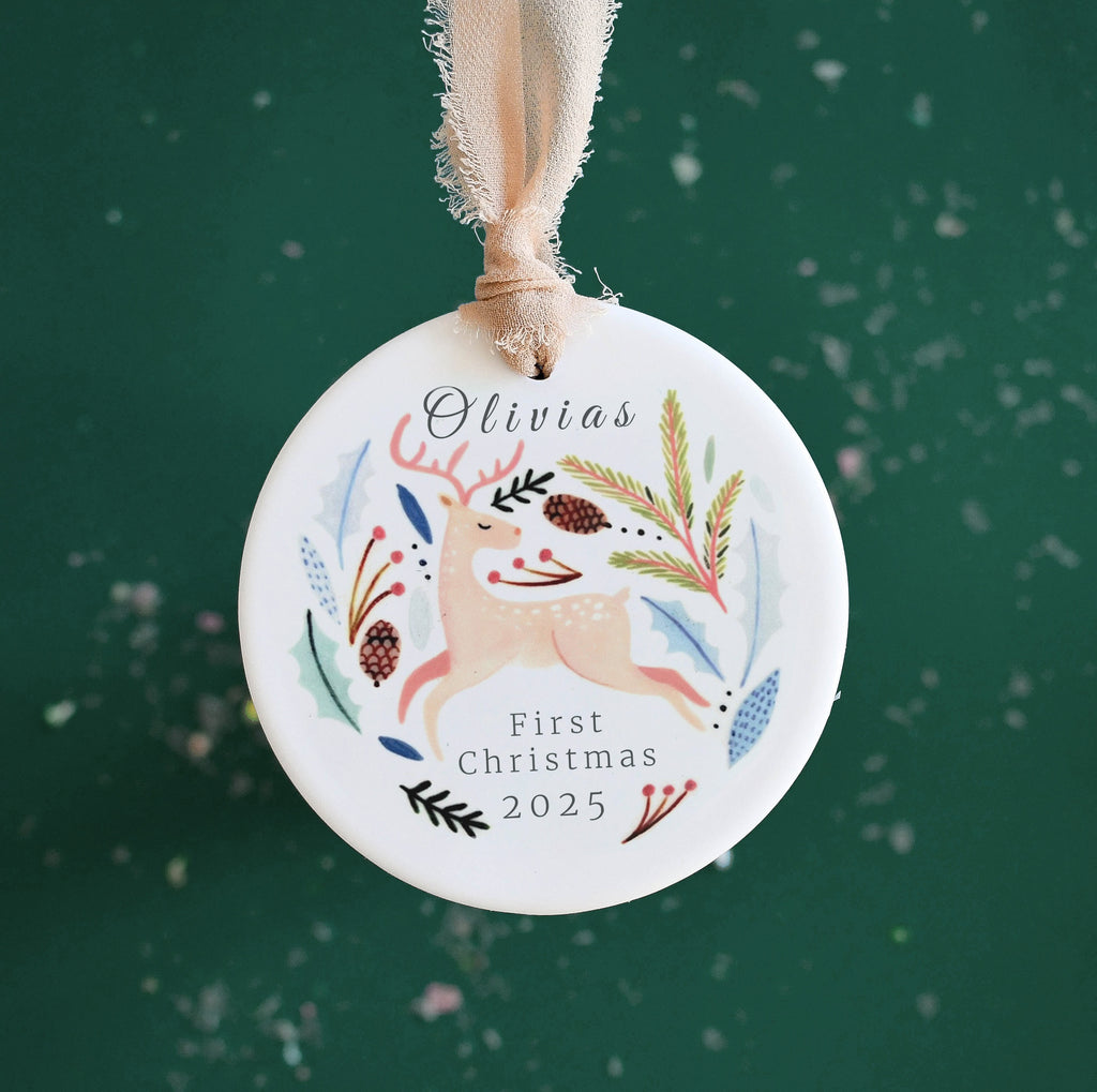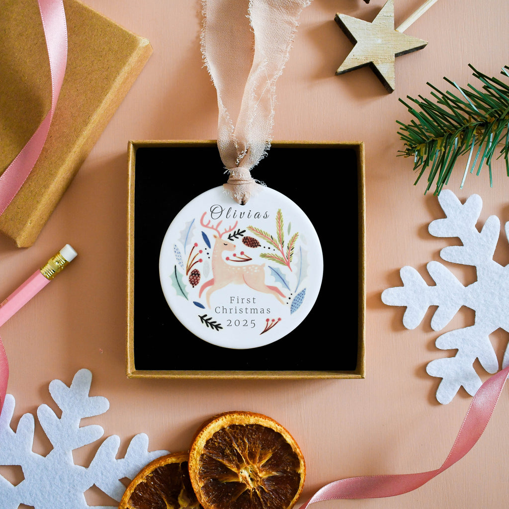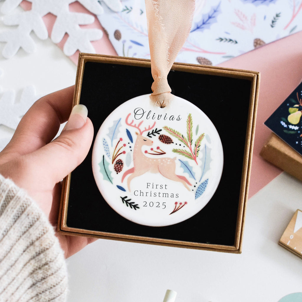 Celebrate your little one’s first festive season with this personalised reindeer Baby’s First Christmas ornament – a sweet and timeless keepsake gift to treasure for years to come. Featuring an adorable reindeer design, this custom baby’s 1st Christmas bauble makes a perfect new baby decoration for the tree. A thoughtful present for new parents, full of festive charm and joyful memories.