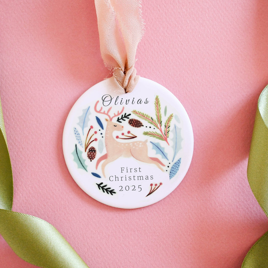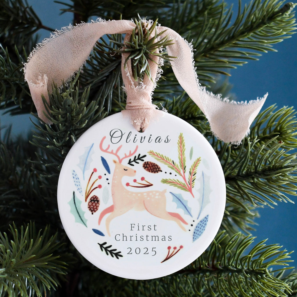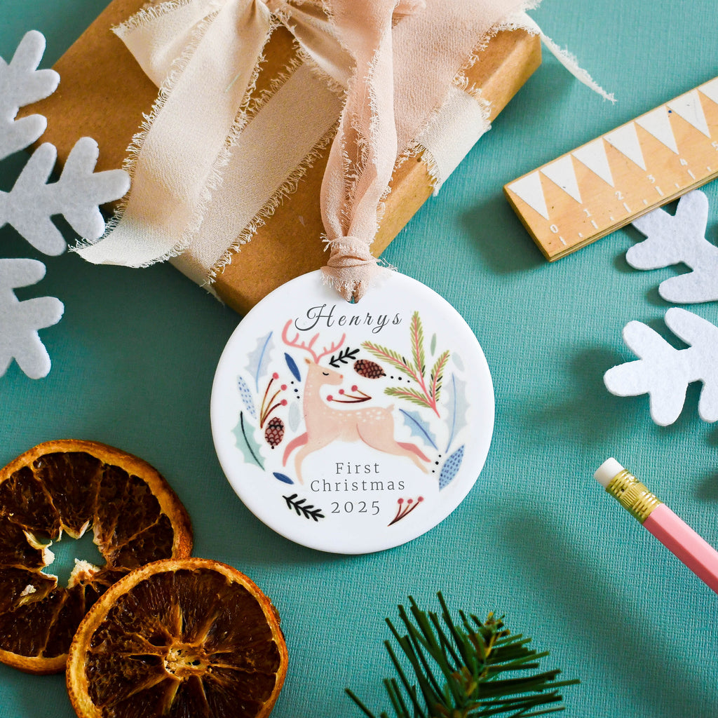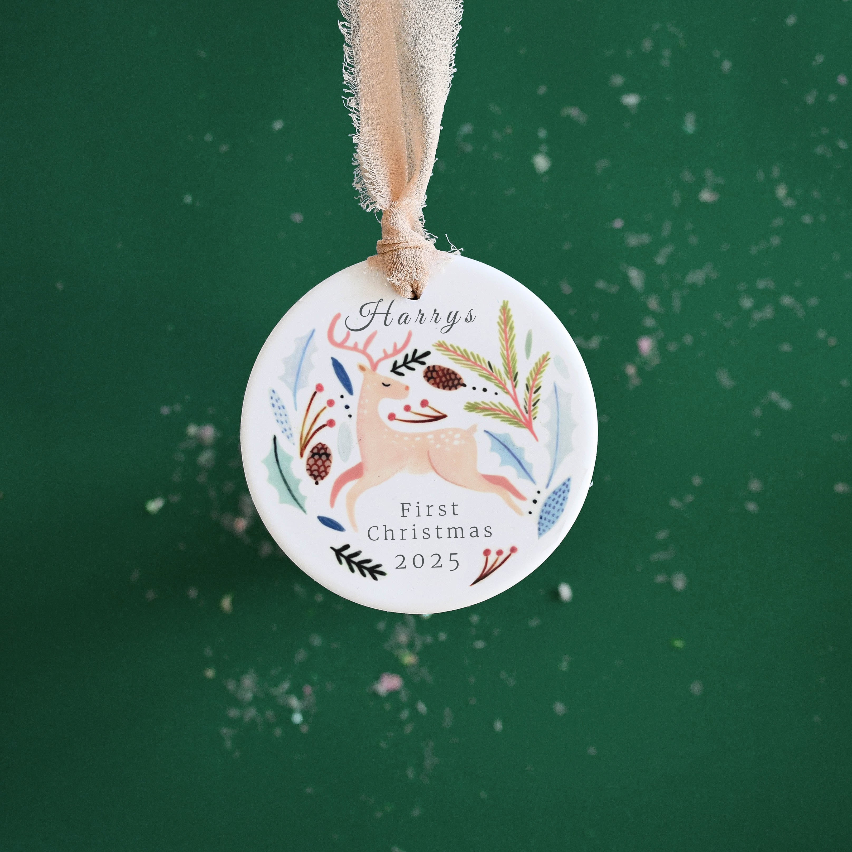 Celebrate your little one’s first festive season with this personalised reindeer Baby’s First Christmas ornament – a sweet and timeless keepsake gift to treasure for years to come. Featuring an adorable reindeer design, this custom baby’s 1st Christmas bauble makes a perfect new baby decoration for the tree. A thoughtful present for new parents, full of festive charm and joyful memories.