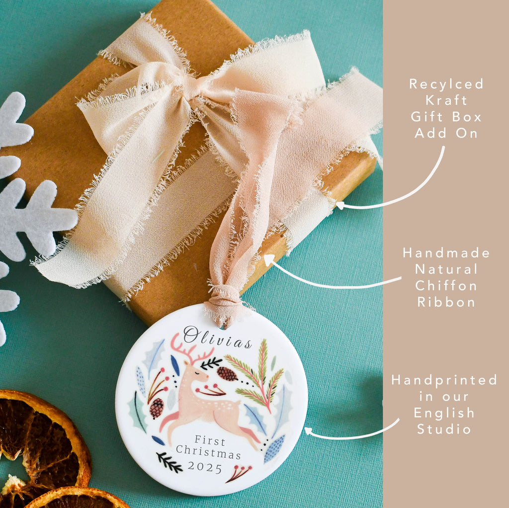 Add an extra touch of Christmas magic by selecting our luxury gift box add on. Your ornament will be placed in a kraft gift box, wrapped in a Natural Chiffon Ribbon and will be finished with an illustrated gift tag with a message of your choice.