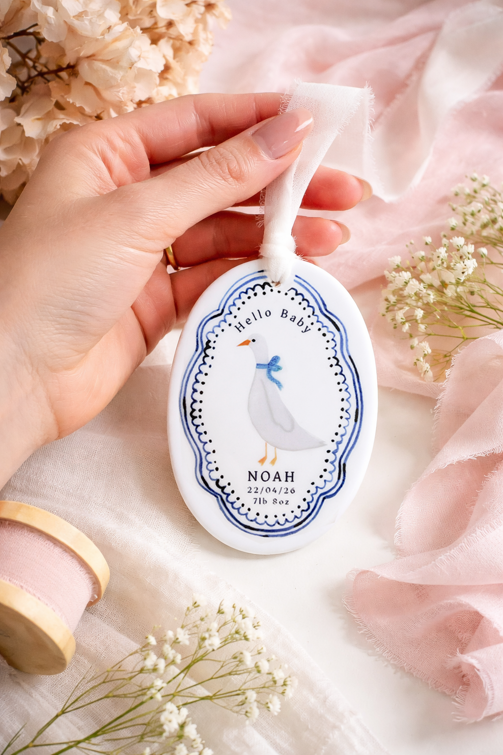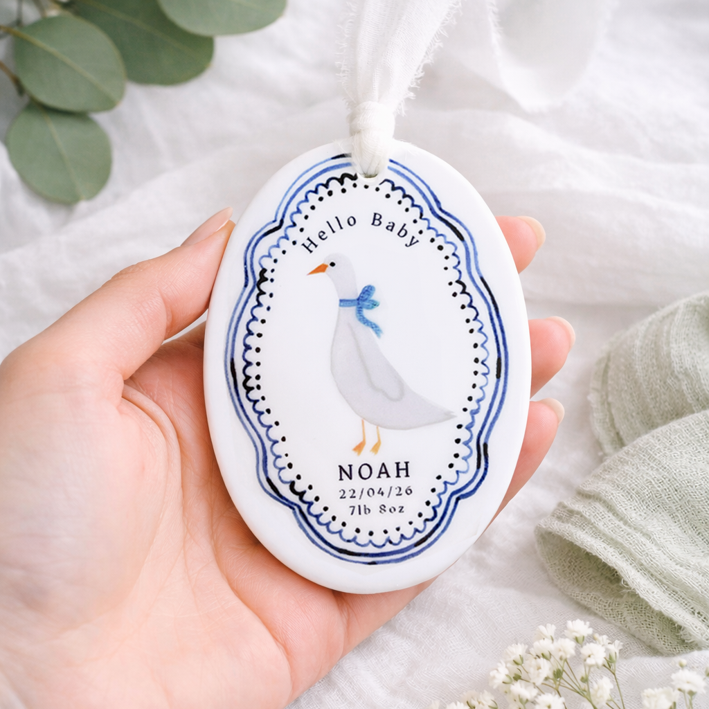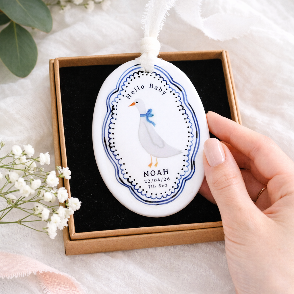 Celebrate the arrival of a precious little one with this charming personalised baby ornament. Featuring a sweet goose illustration framed by a delicate blue decorative border, each ornament is customised with the baby’s name, birth date and birth weight to create a meaningful keepsake. Finished with a soft hanging ribbon, it makes a thoughtful gift for new parents and a beautiful way to remember such a special day.