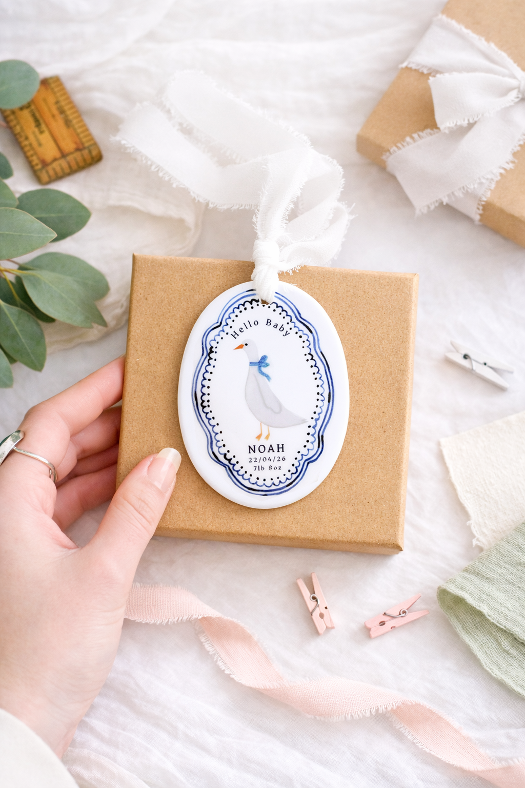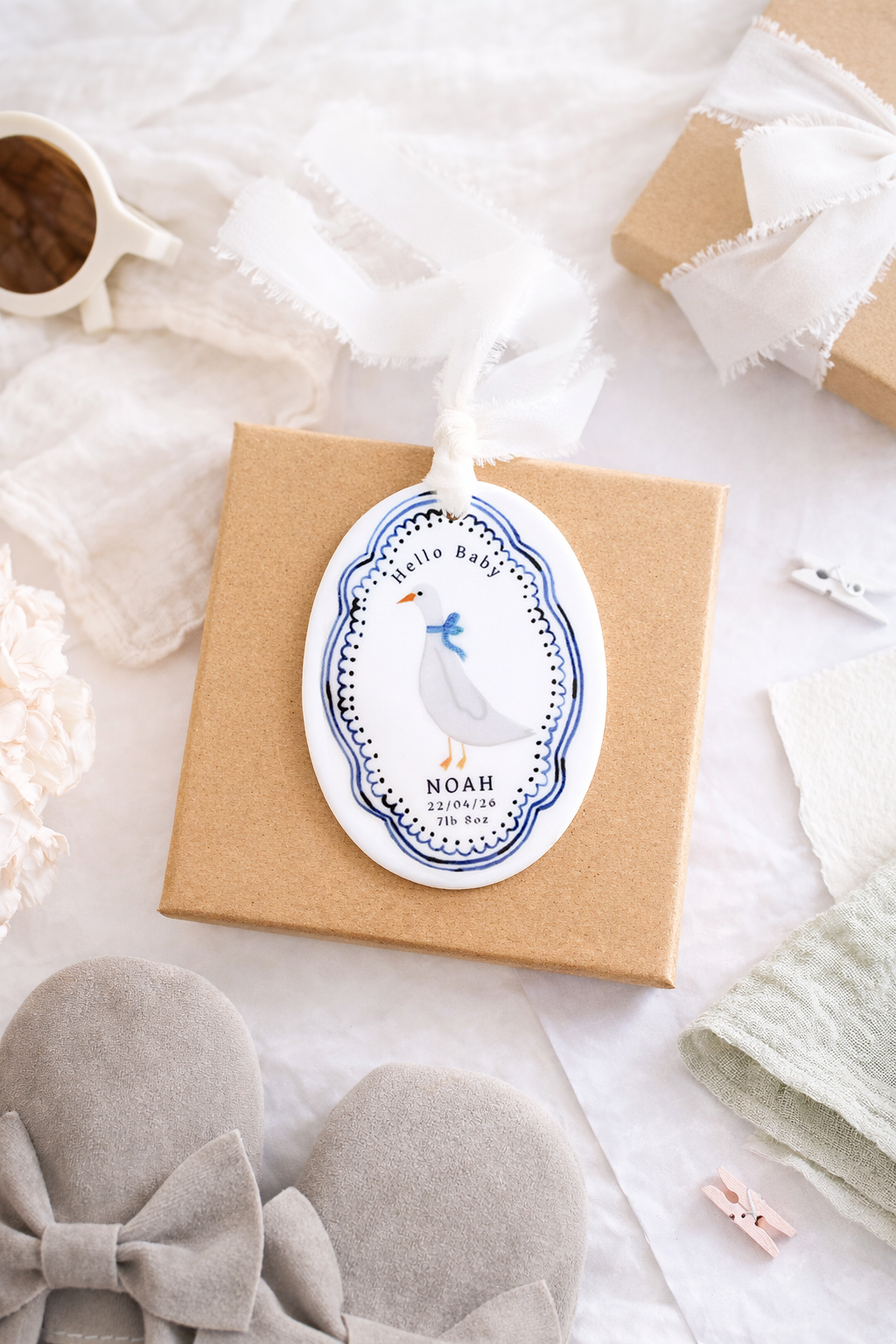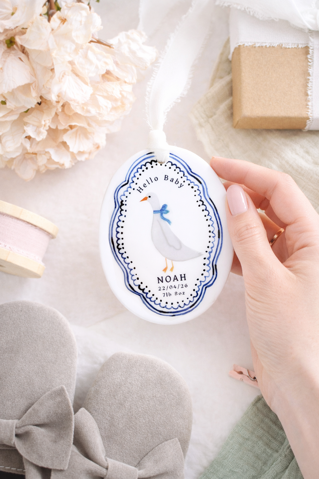 Celebrate the arrival of a precious little one with this charming personalised baby ornament. Featuring a sweet goose illustration framed by a delicate blue decorative border, each ornament is customised with the baby’s name, birth date and birth weight to create a meaningful keepsake. Finished with a soft hanging ribbon, it makes a thoughtful gift for new parents and a beautiful way to remember such a special day.