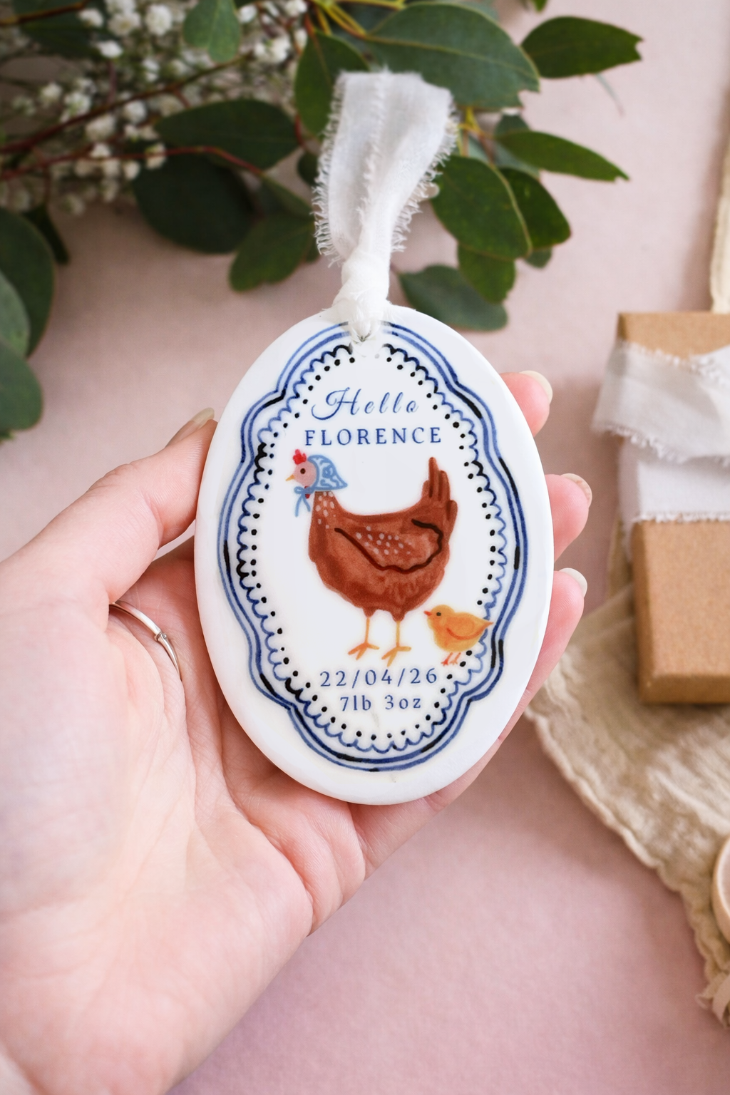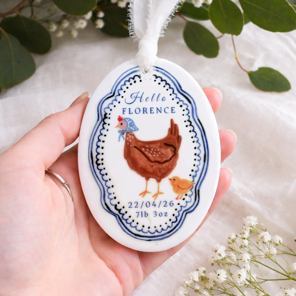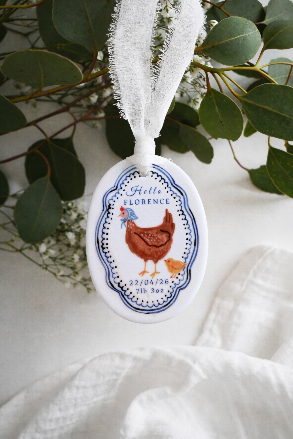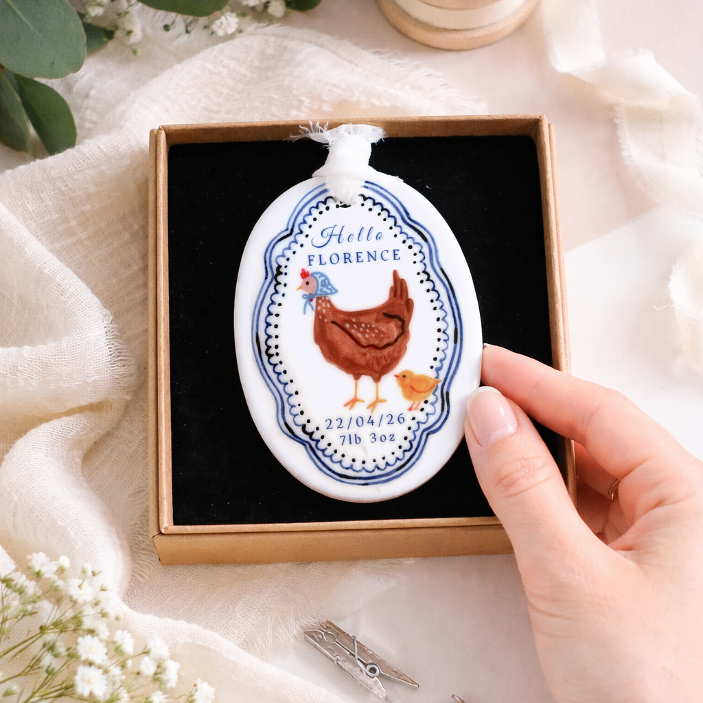 Celebrate the arrival of a precious little one with this charming personalised baby ornament. Featuring a sweet hen and chick illustration framed by a delicate blue decorative border, each ornament is customised with the baby’s name, birth date and birth weight to create a meaningful keepsake. Finished with a soft hanging ribbon, it makes a thoughtful gift for new parents and a lovely way to remember such a special day.