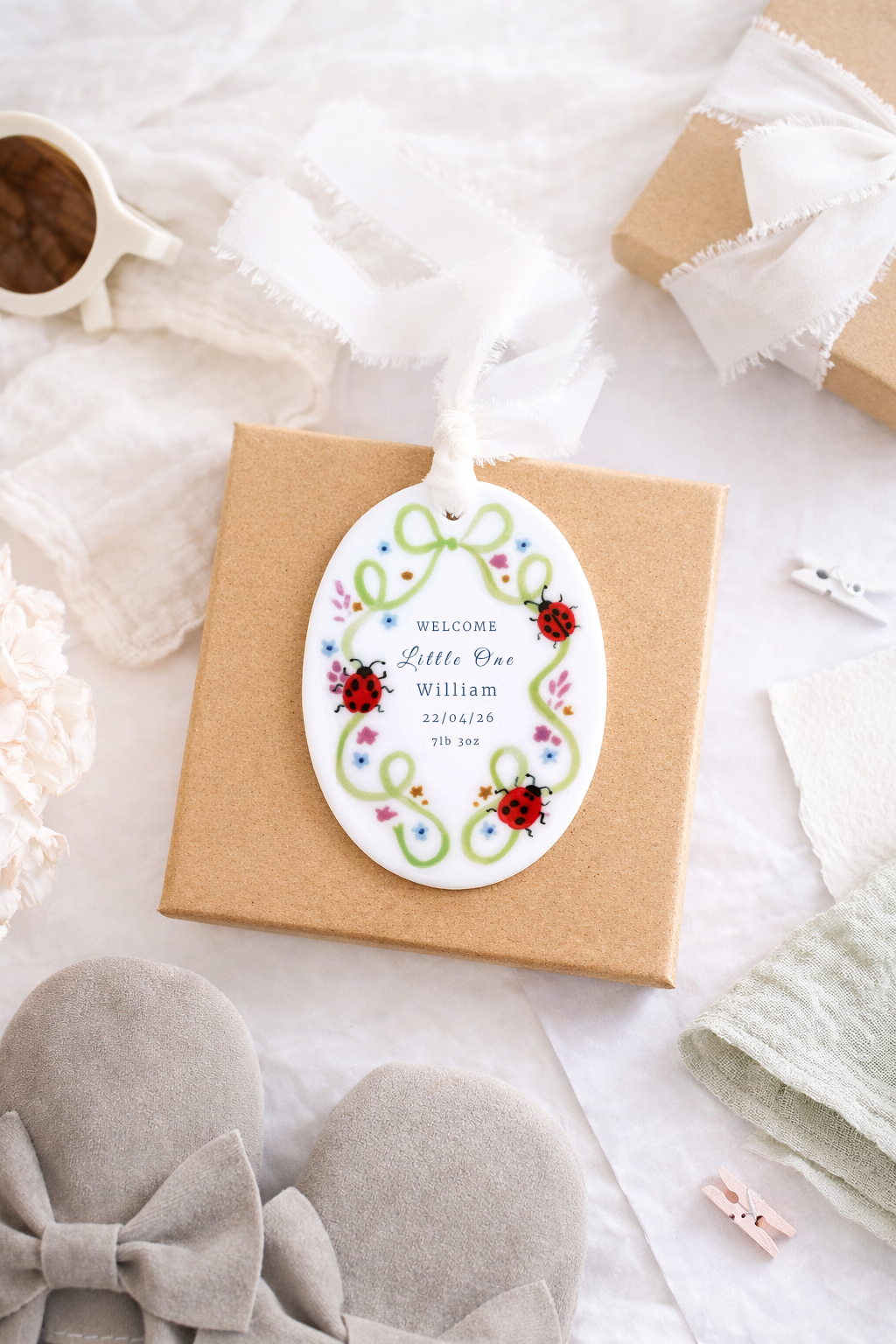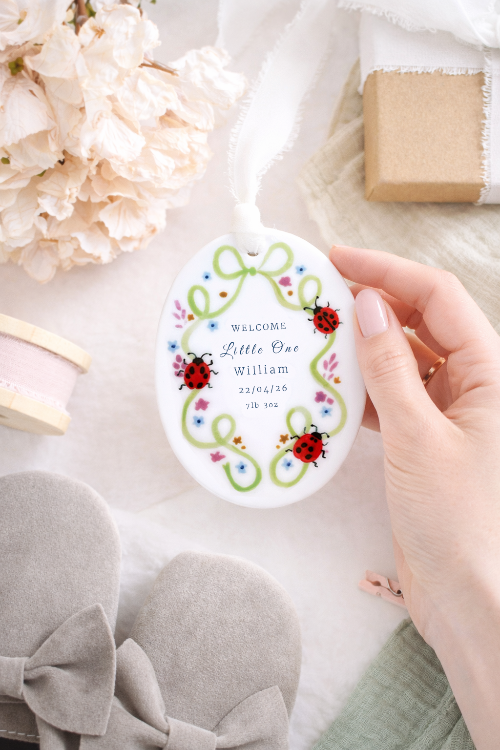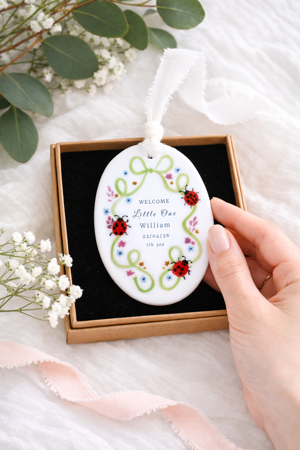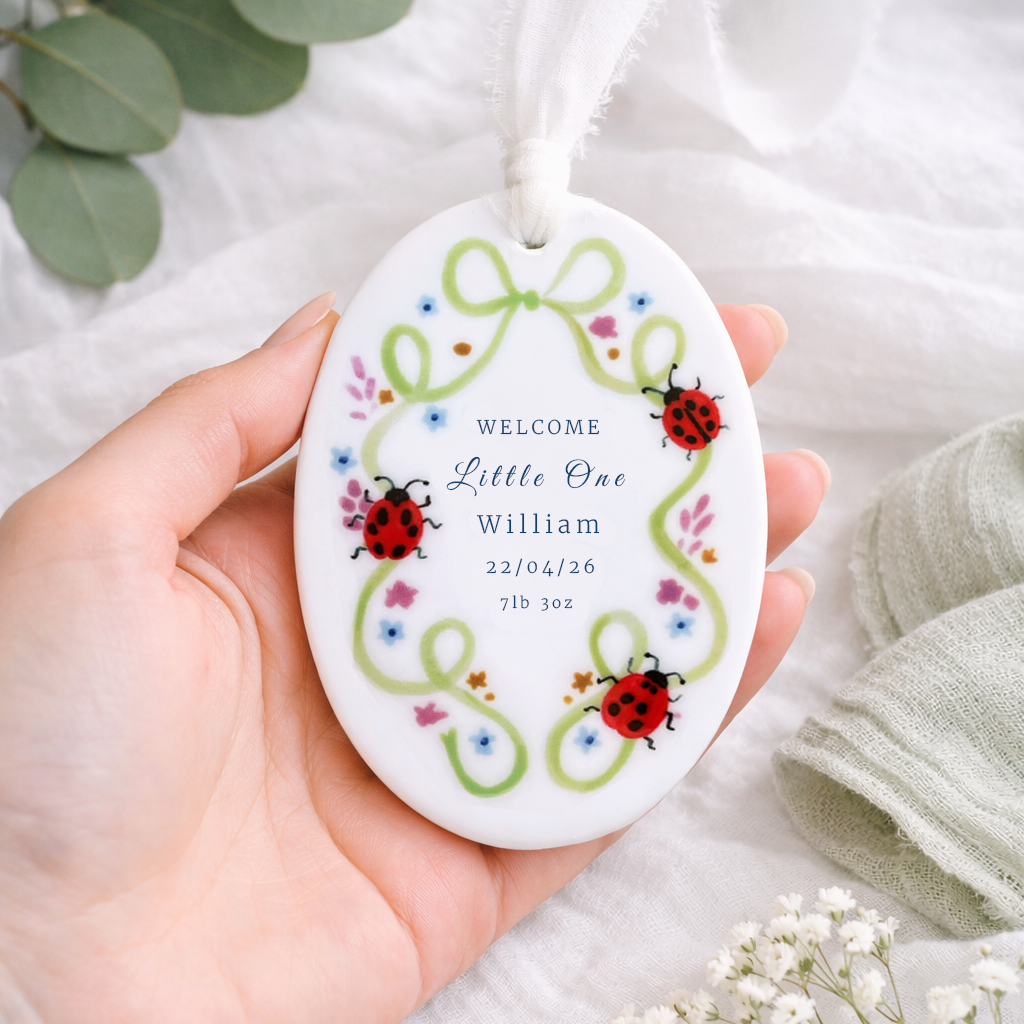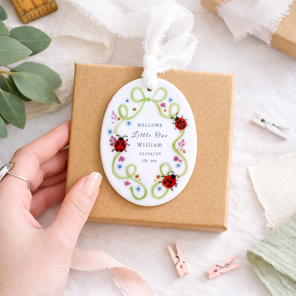 Celebrate the arrival of a little one with this charming personalised baby ornament. Featuring a delicate green ribbon frame adorned with colourful flowers and sweet ladybird illustrations, each ornament is customised with the baby’s name, birth date and birth weight to create a special keepsake. Finished with a soft hanging ribbon, it makes a thoughtful gift for new parents and a beautiful way to remember such a joyful moment.