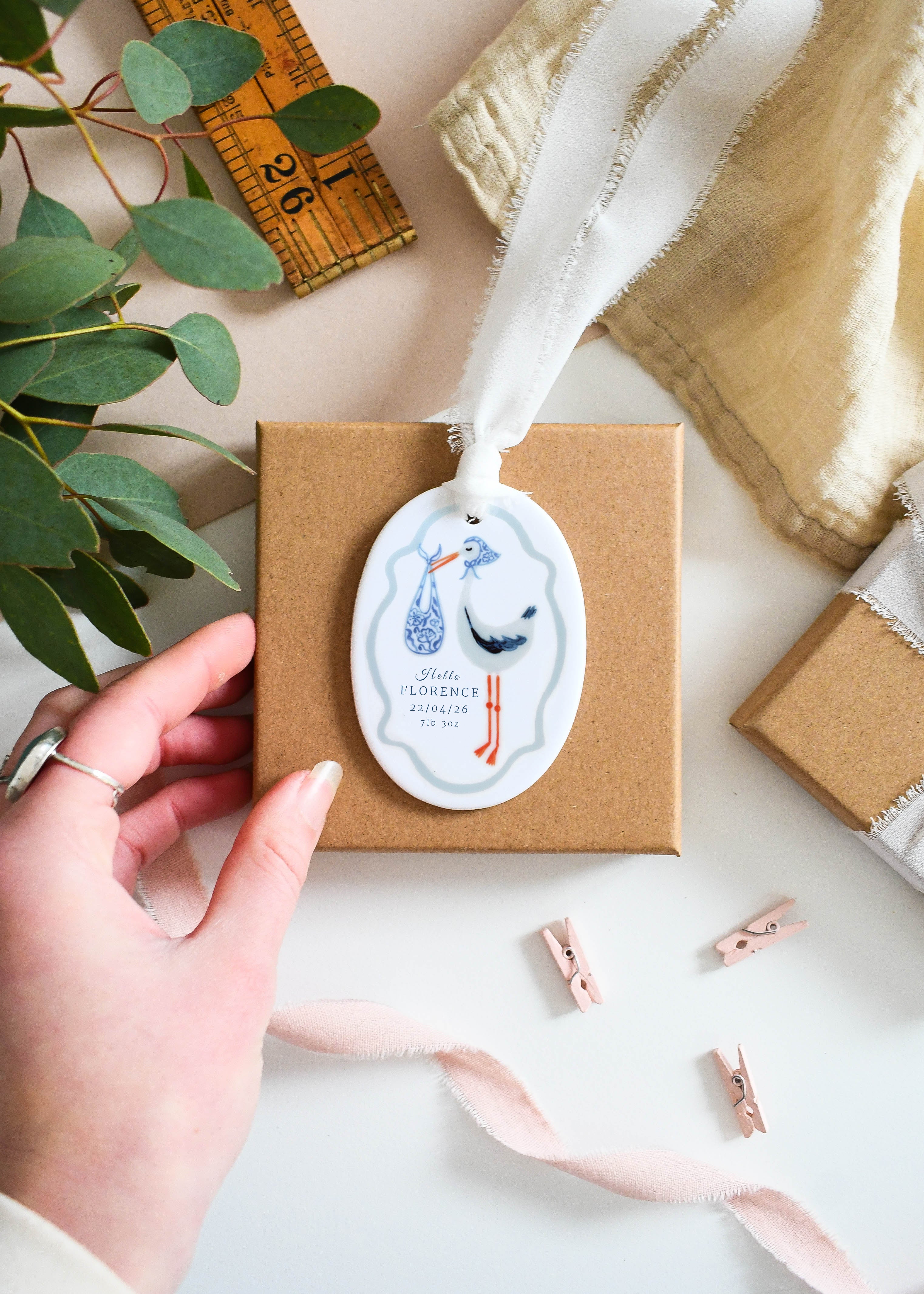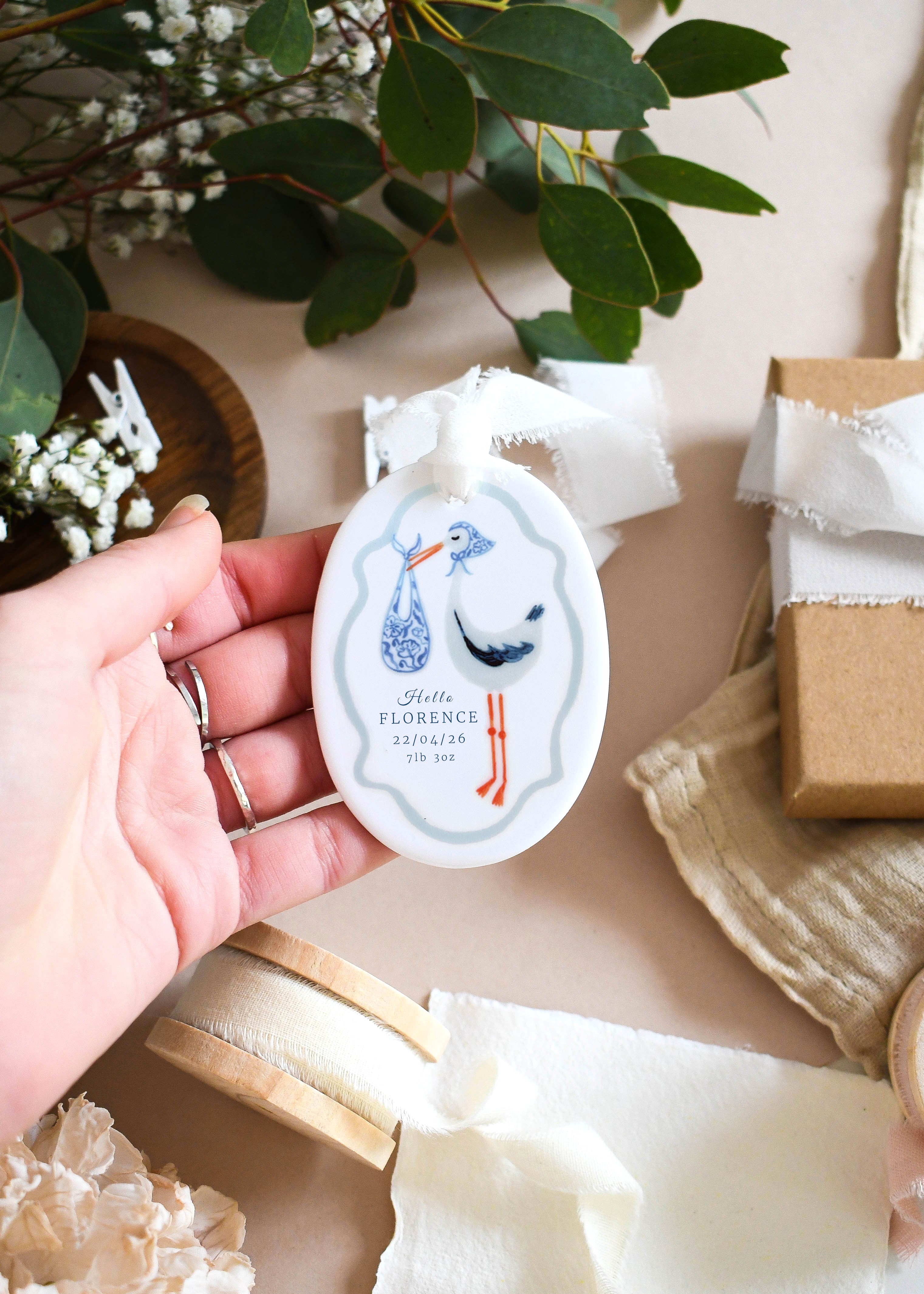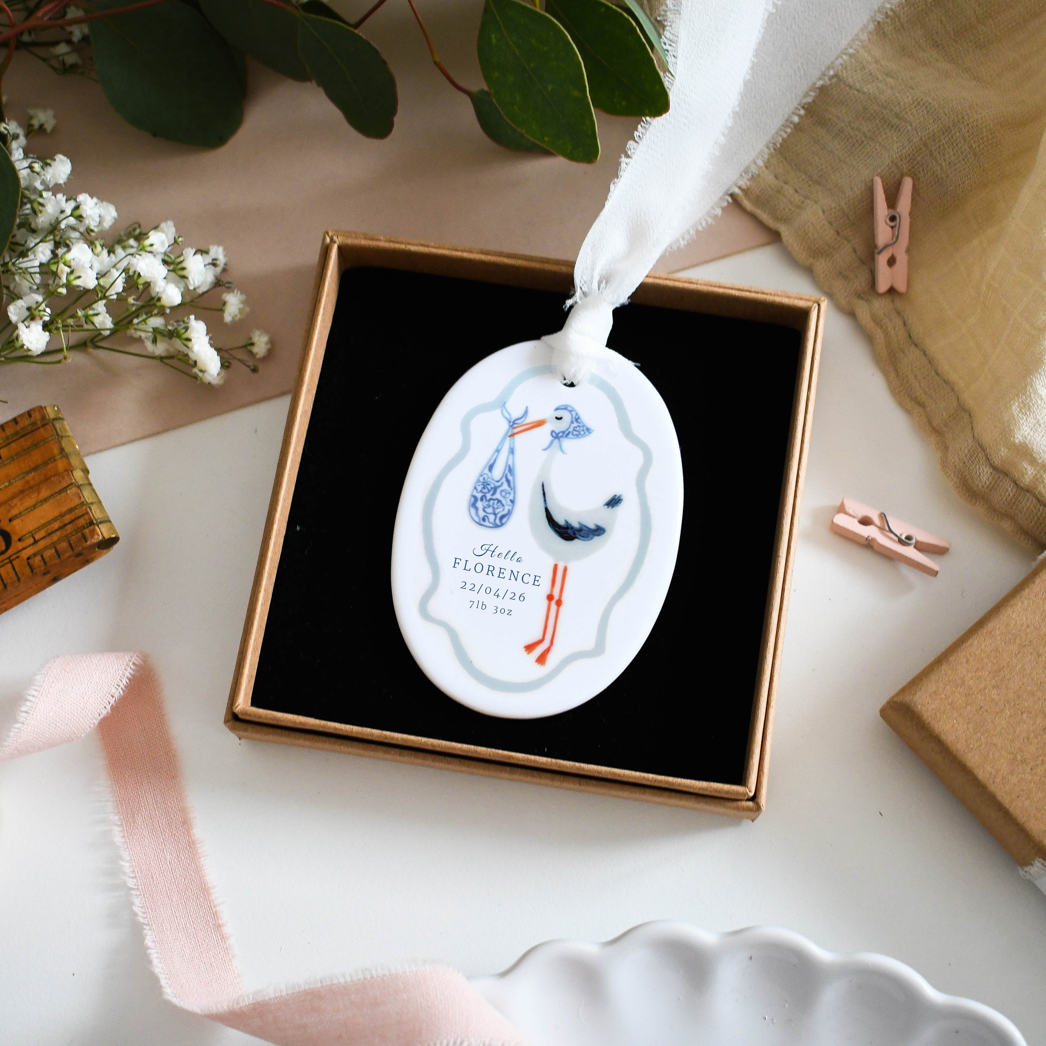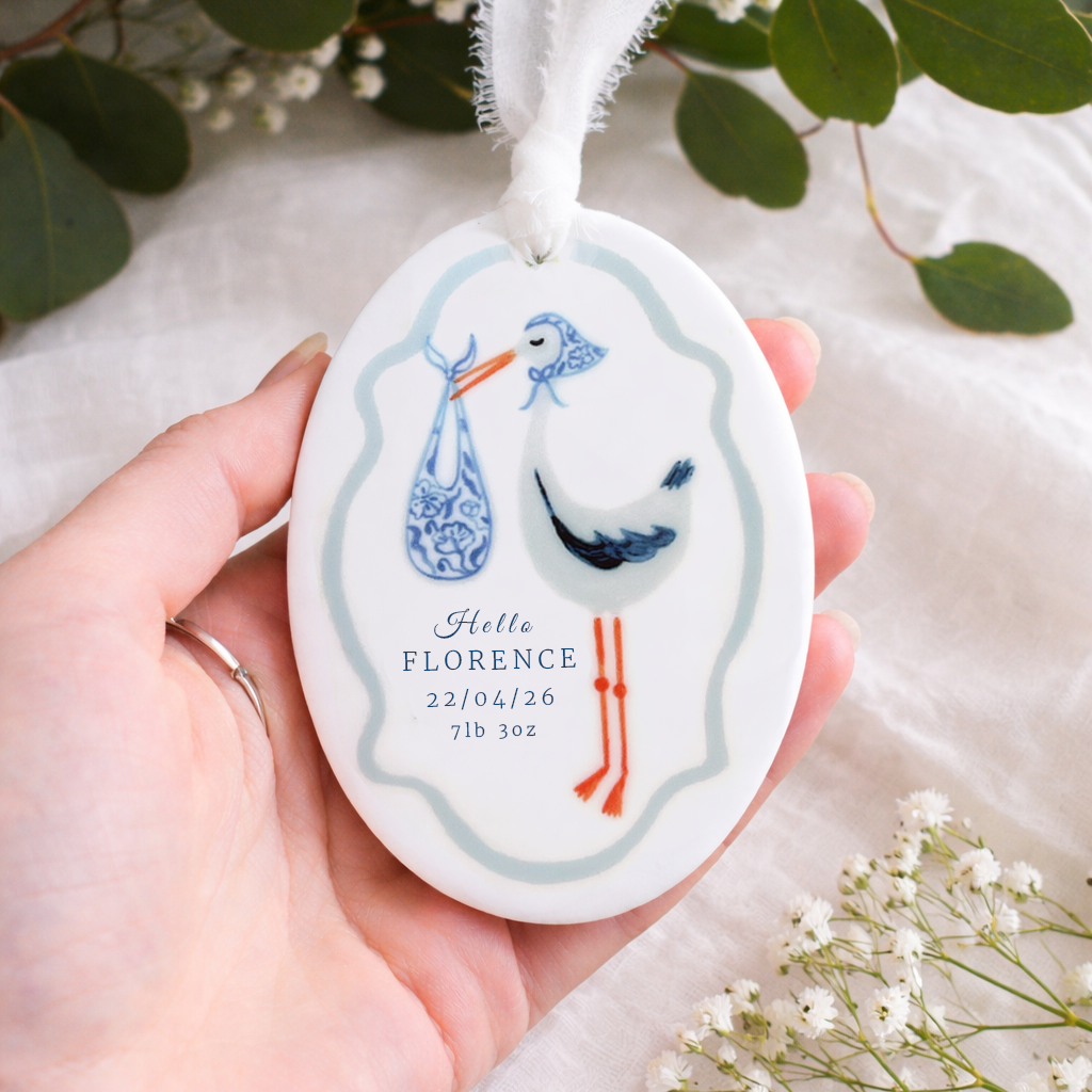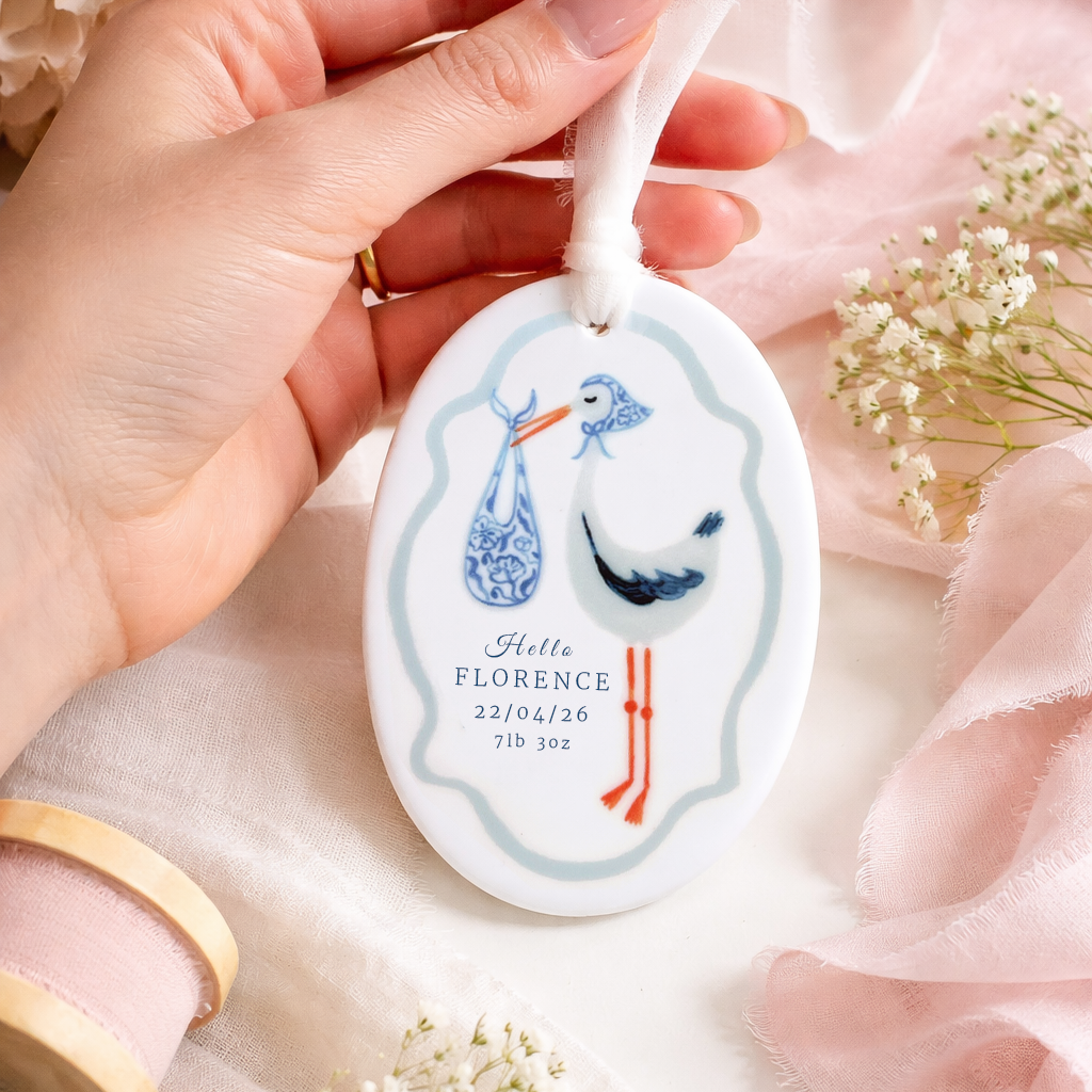 Celebrate the arrival of a precious little one with this beautifully personalised baby ornament. Featuring a charming stork illustration carrying a bundle and framed with a soft scalloped border, each ornament is customised with the baby’s name, birth date and birth weight to create a timeless keepsake. Finished with a soft hanging ribbon, it makes a thoughtful gift for new parents and a lovely way to remember such a special day.