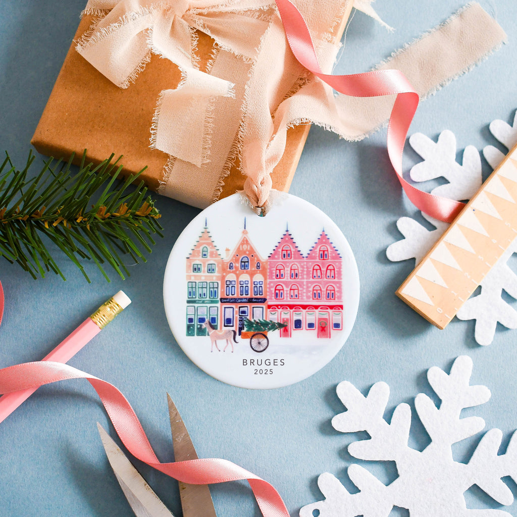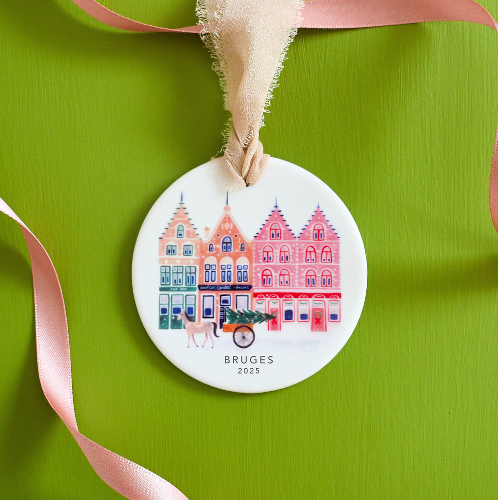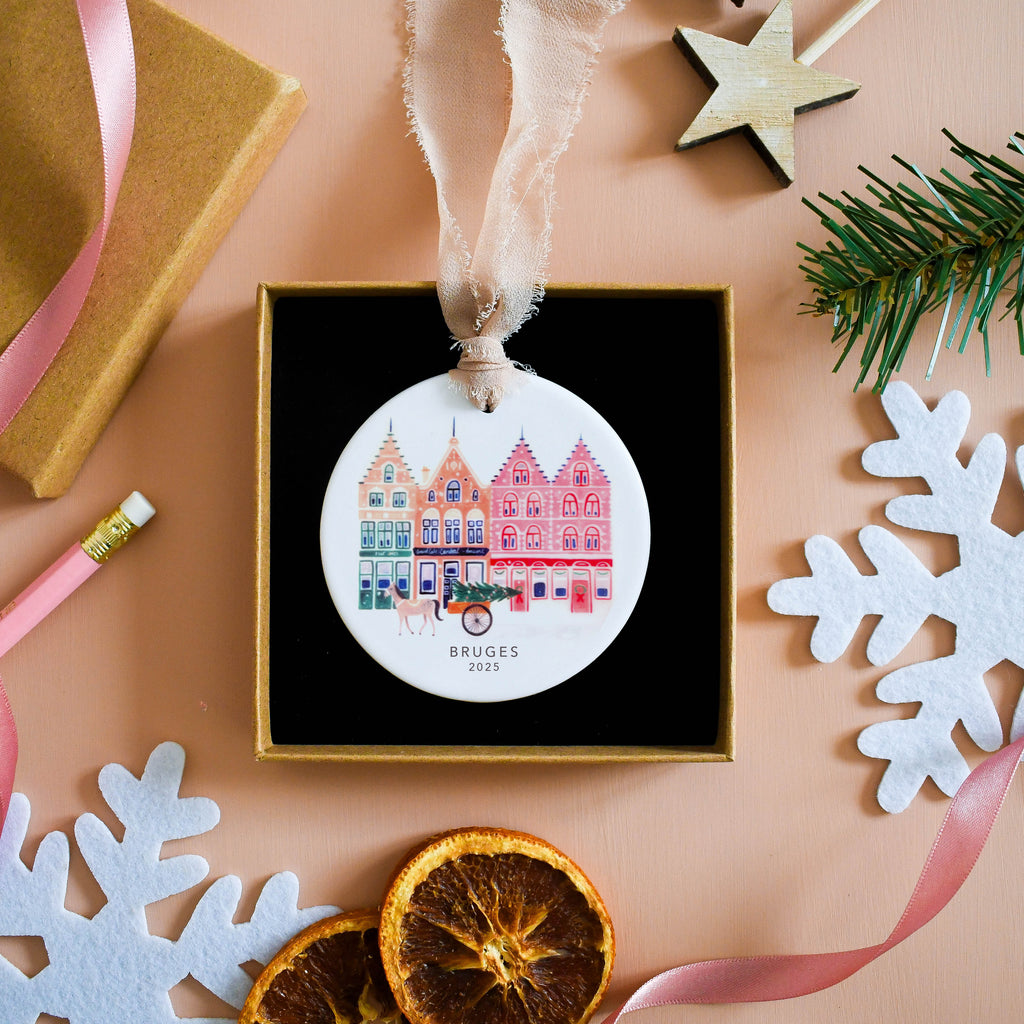 Treat your loved ones to a gift that they will treasure forever with our personalised ceramic ornaments. This delicately illustrated ornament depicts a snowy Bruges scenes featuring its iconic buildings and horse and carts. It makes this perfect keepsake gift which will be cherished for many Christmases to come. Each ornament is designed and handprinted in our studio in the North West of England and can be personalised with a name of your choice.