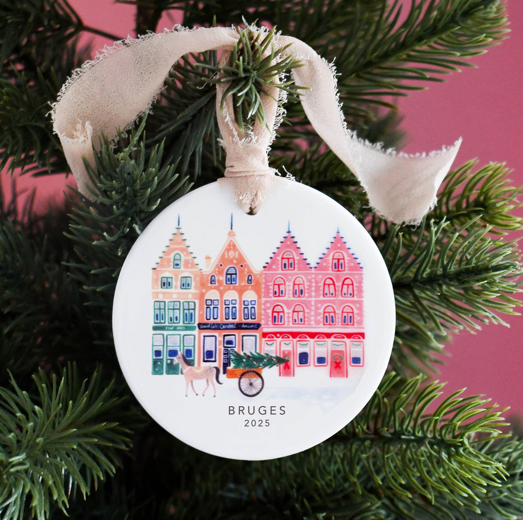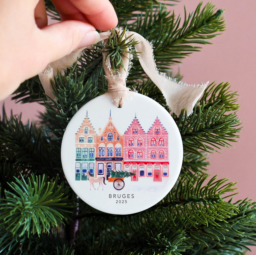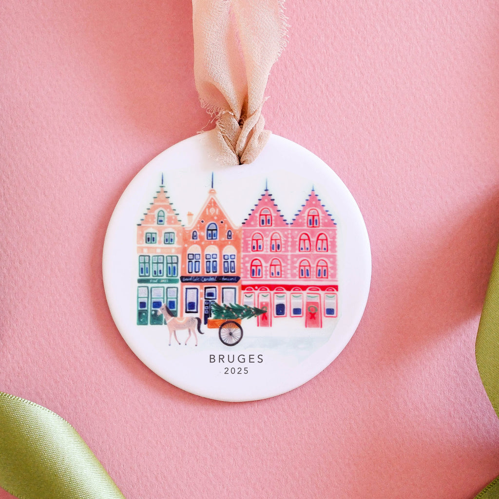 Treat your loved ones to a gift that they will treasure forever with our personalised ceramic ornaments. This delicately illustrated ornament depicts a snowy Bruges scenes featuring its iconic buildings and horse and carts. It makes this perfect keepsake gift which will be cherished for many Christmases to come. Each ornament is designed and handprinted in our studio in the North West of England and can be personalised with a name of your choice.