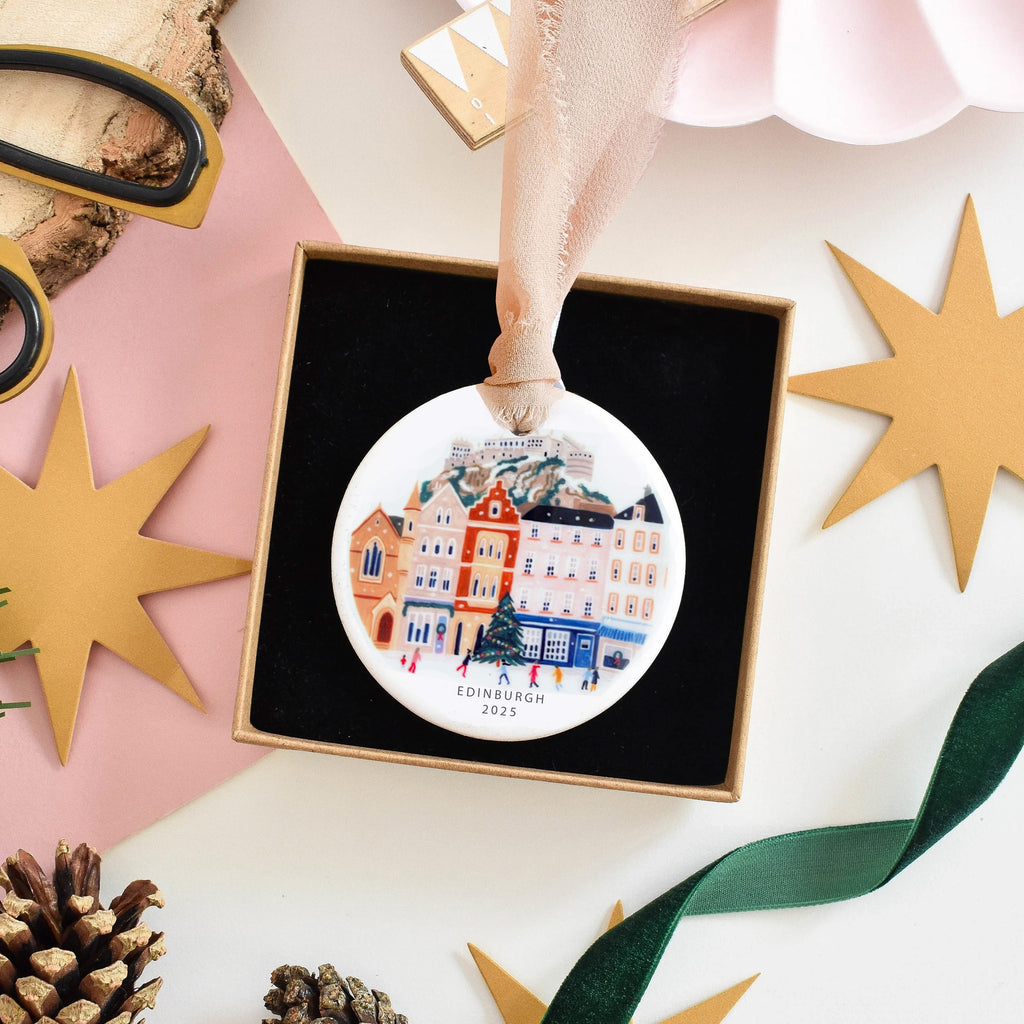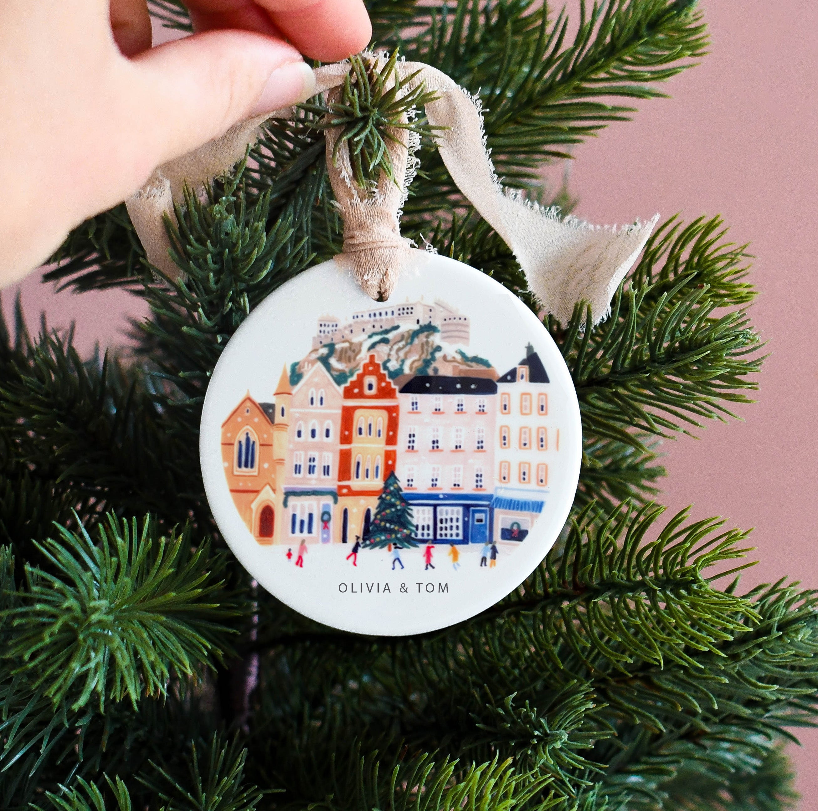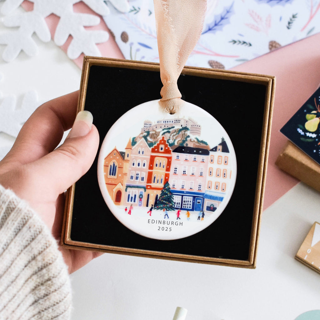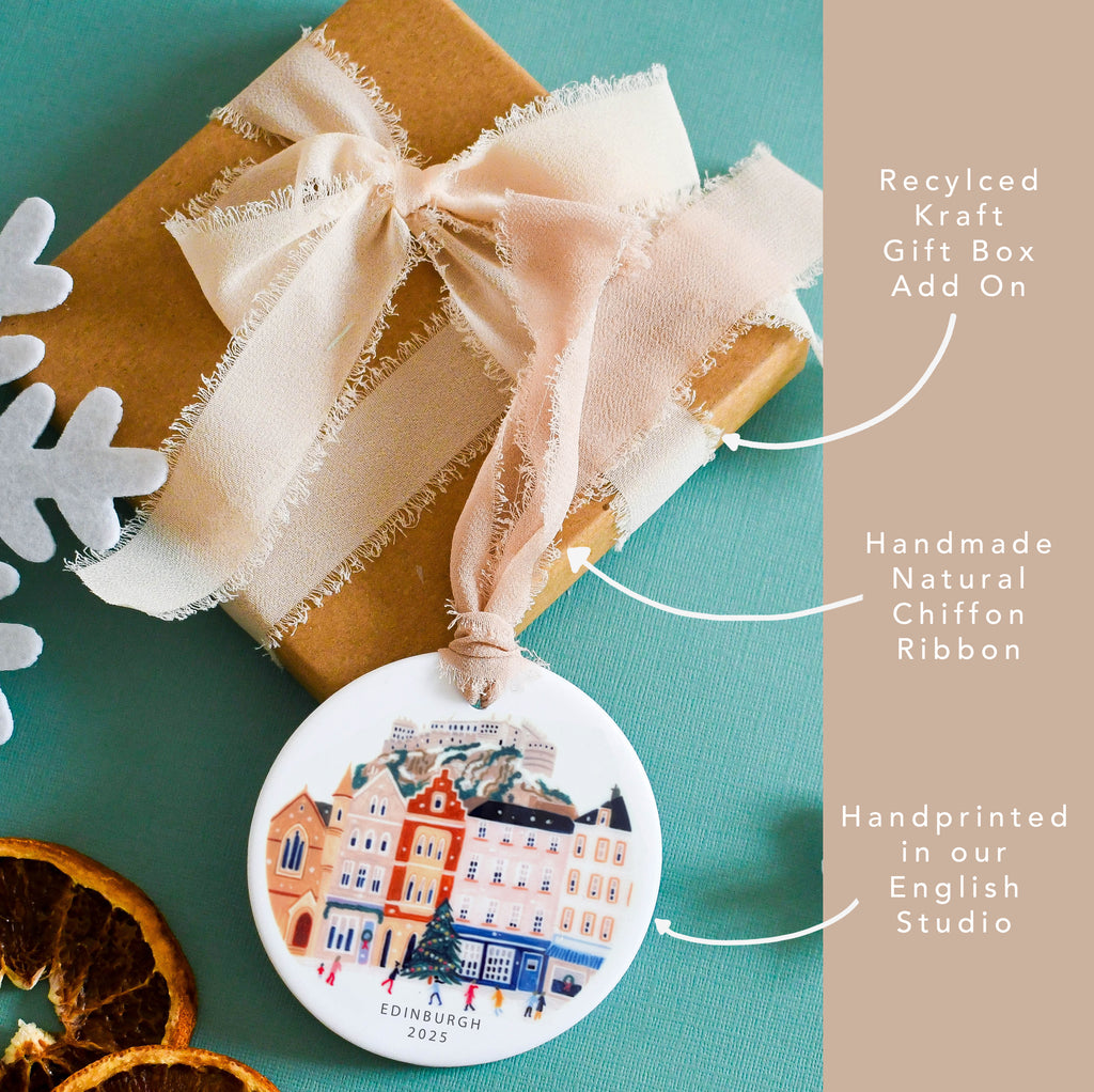 Treat your loved ones to a gift that they will treasure forever with our personalised ceramic ornaments. This delicately illustrated ornament depicts a snowy Edinburgh Scene with the historic castle in the background. It makes this perfect keepsake gift which will be cherished for many Christmases to come. Each ornament is designed and handprinted in our studio in the North West of England and can be personalised with a name of your choice.
