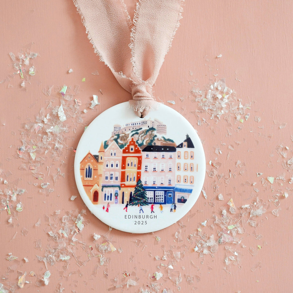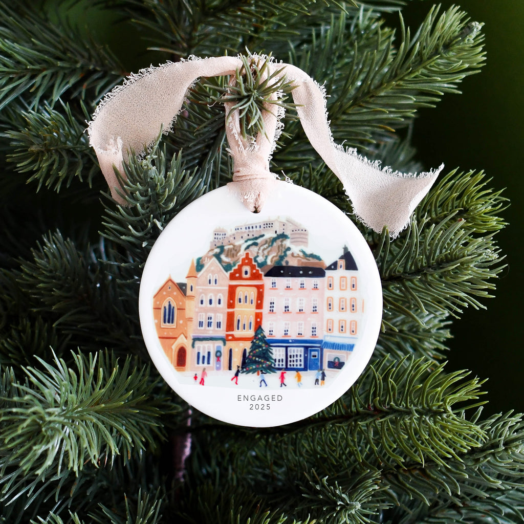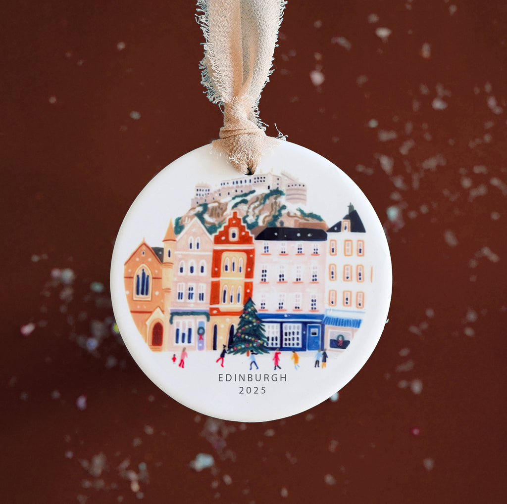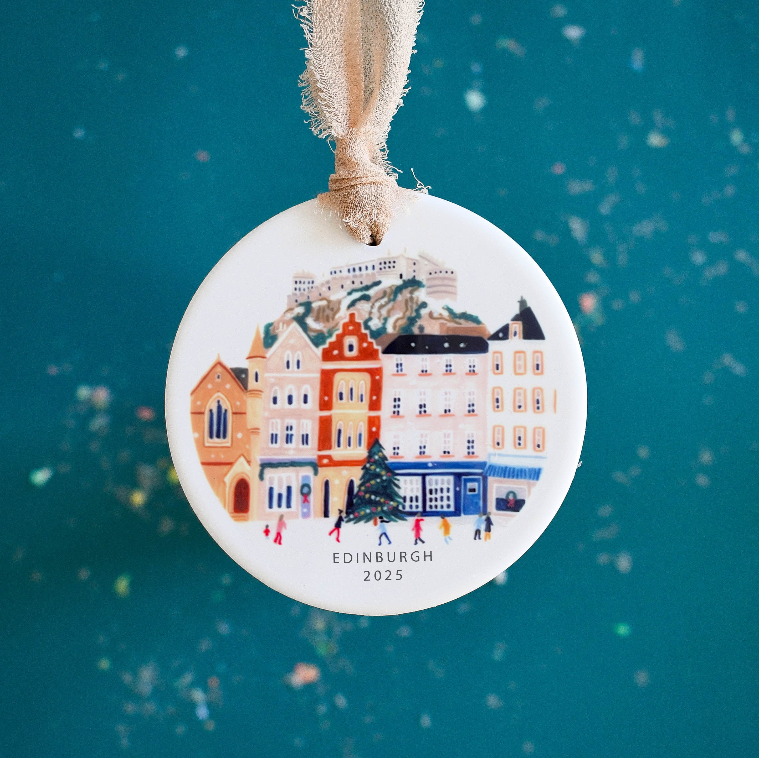 Treat your loved ones to a gift that they will treasure forever with our personalised ceramic ornaments. This delicately illustrated ornament depicts a snowy Edinburgh Scene with the historic castle in the background. It makes this perfect keepsake gift which will be cherished for many Christmases to come. Each ornament is designed and handprinted in our studio in the North West of England and can be personalised with a name of your choice.