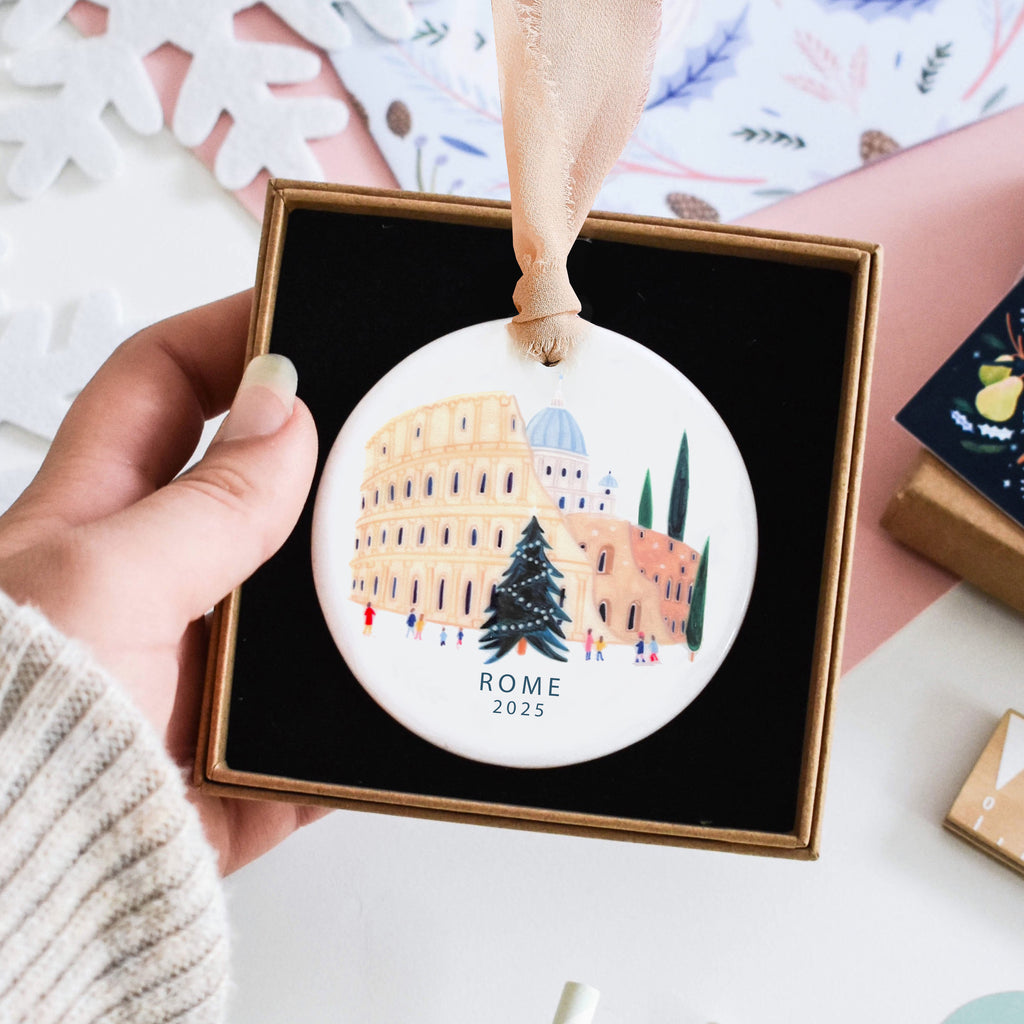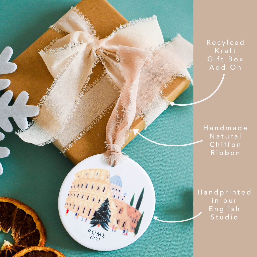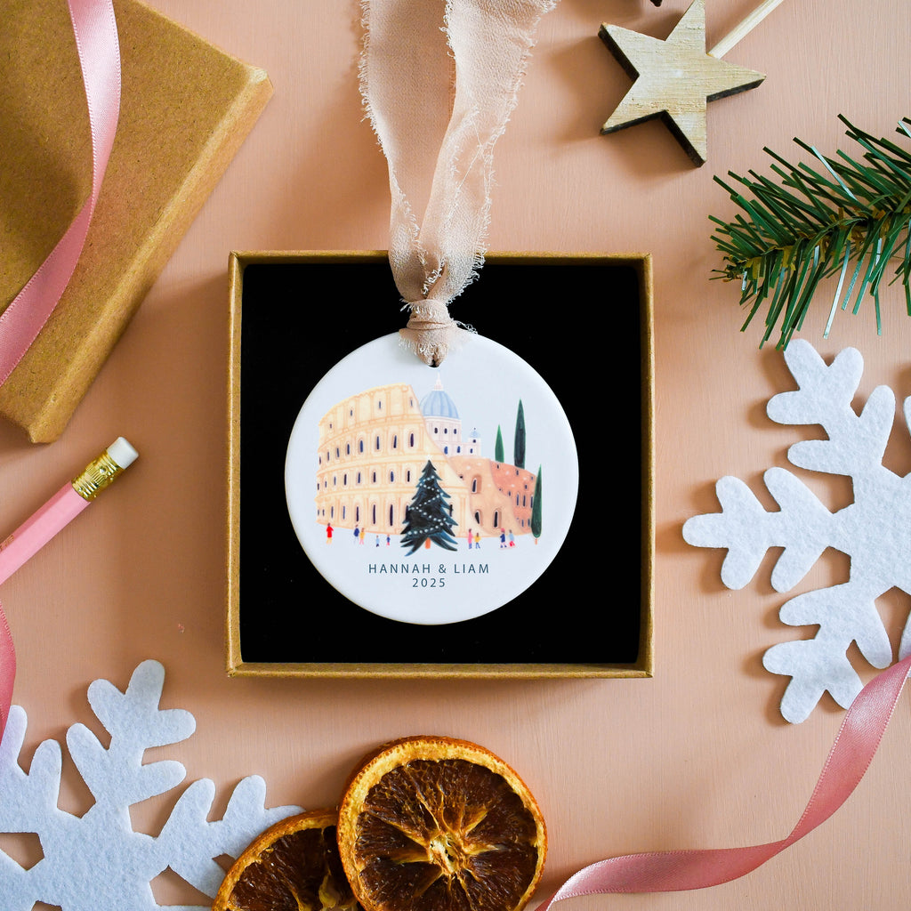 Treat your loved ones to a gift that they will treasure forever with our personalised ceramic ornaments. This delicately illustrated ornament depicts Rome's famous colosseum after a sprinkling of snow. It makes this perfect keepsake gift which will be cherished for many Christmases to come. Each ornament is designed and handprinted in our studio in the North West of England and can be personalised with a name of your choice.