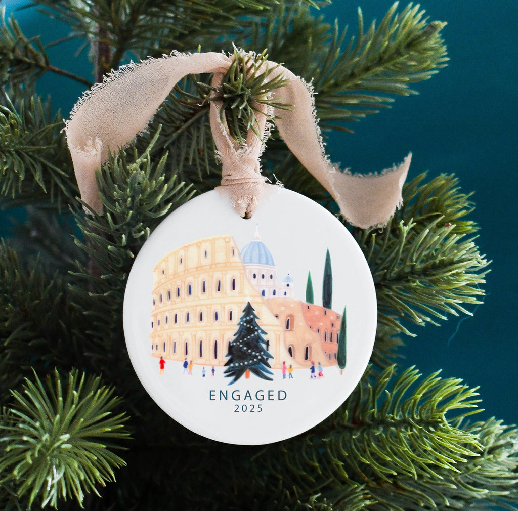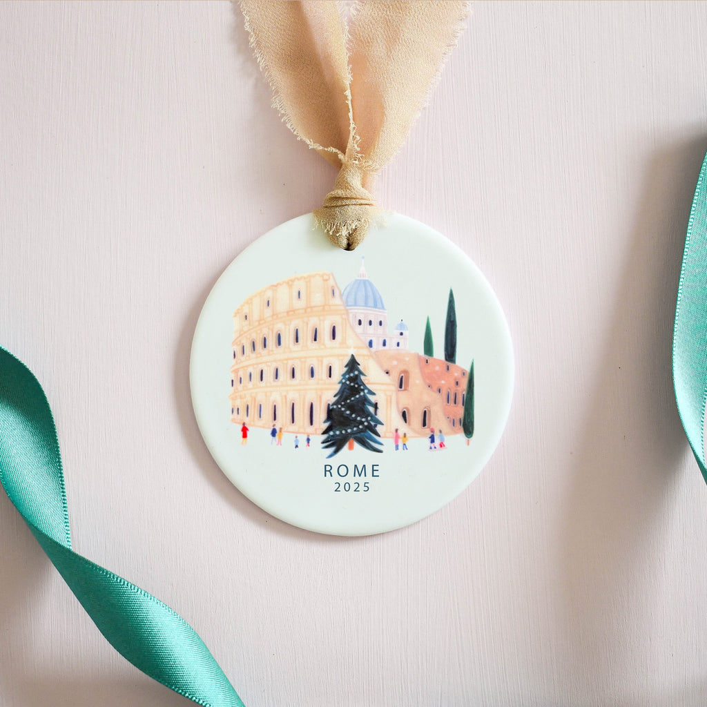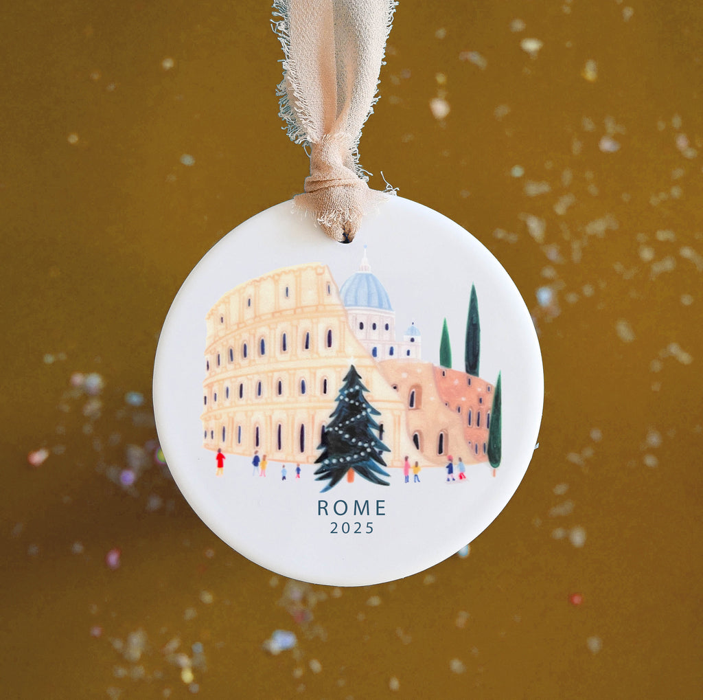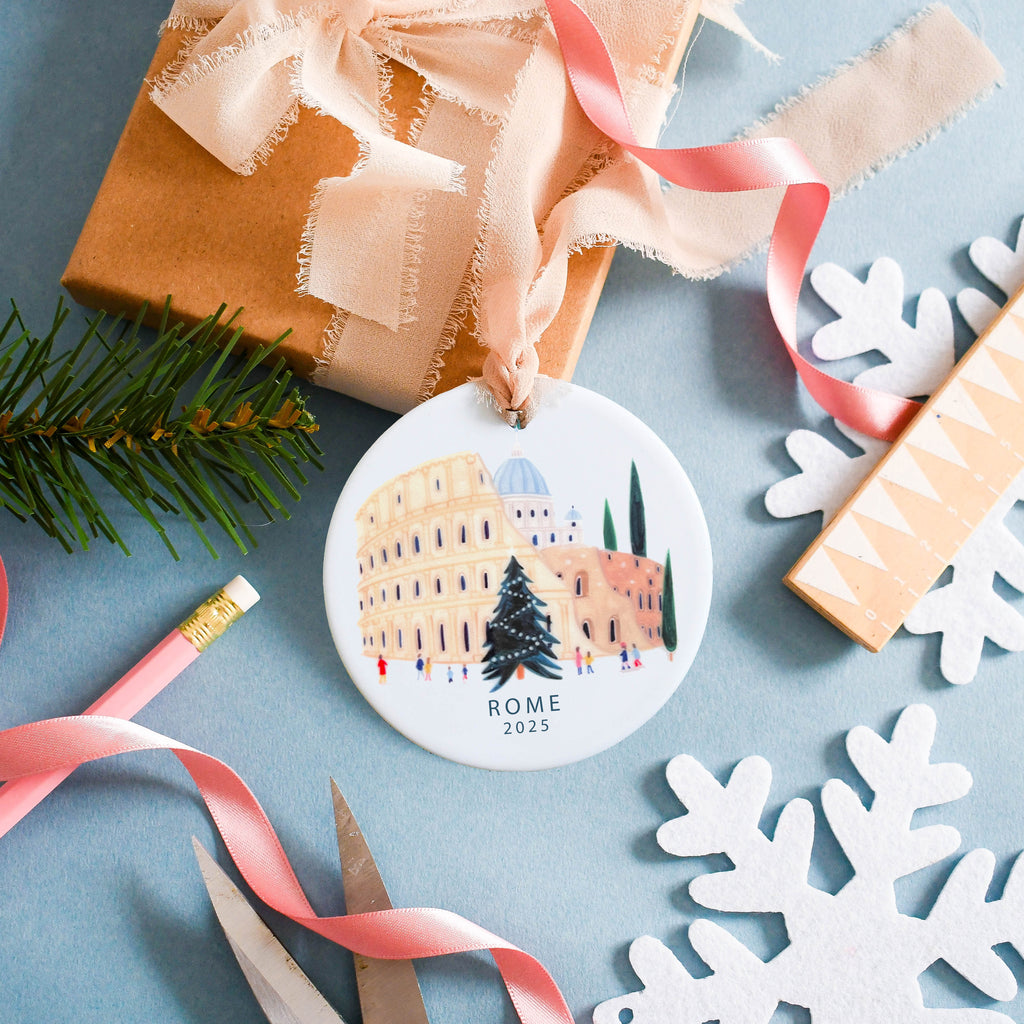 Treat your loved ones to a gift that they will treasure forever with our personalised ceramic ornaments. This delicately illustrated ornament depicts Rome's famous colosseum after a sprinkling of snow. It makes this perfect keepsake gift which will be cherished for many Christmases to come. Each ornament is designed and handprinted in our studio in the North West of England and can be personalised with a name of your choice.