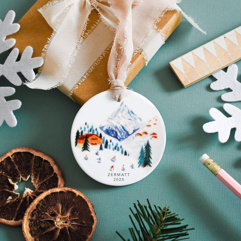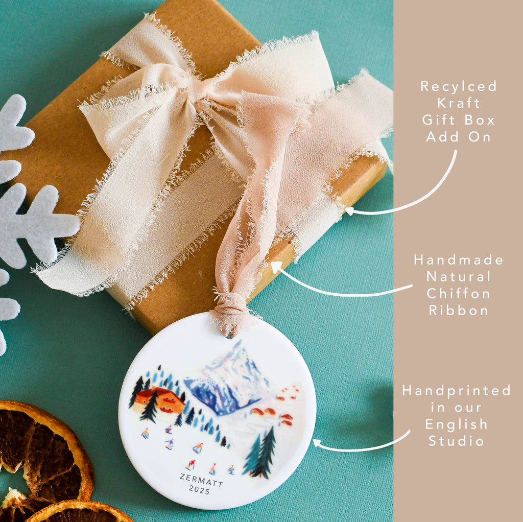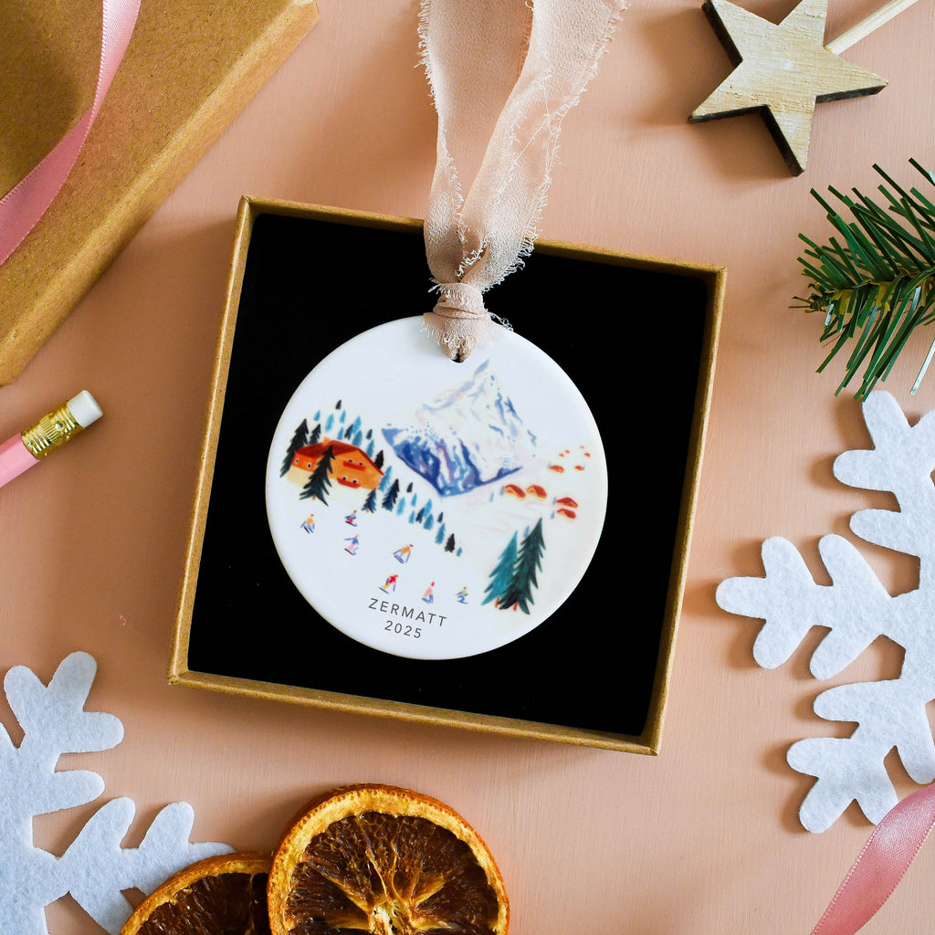 Treat your loved ones to a gift that they will treasure forever with our personalised ceramic ornaments. This delicately illustrated ornament depicts a snowy Zermatt in Ski Season. It makes this perfect keepsake gift which will be cherished for many Christmases to come. Each ornament is designed and handprinted in our studio in the North West of England and can be personalised with a name of your choice.