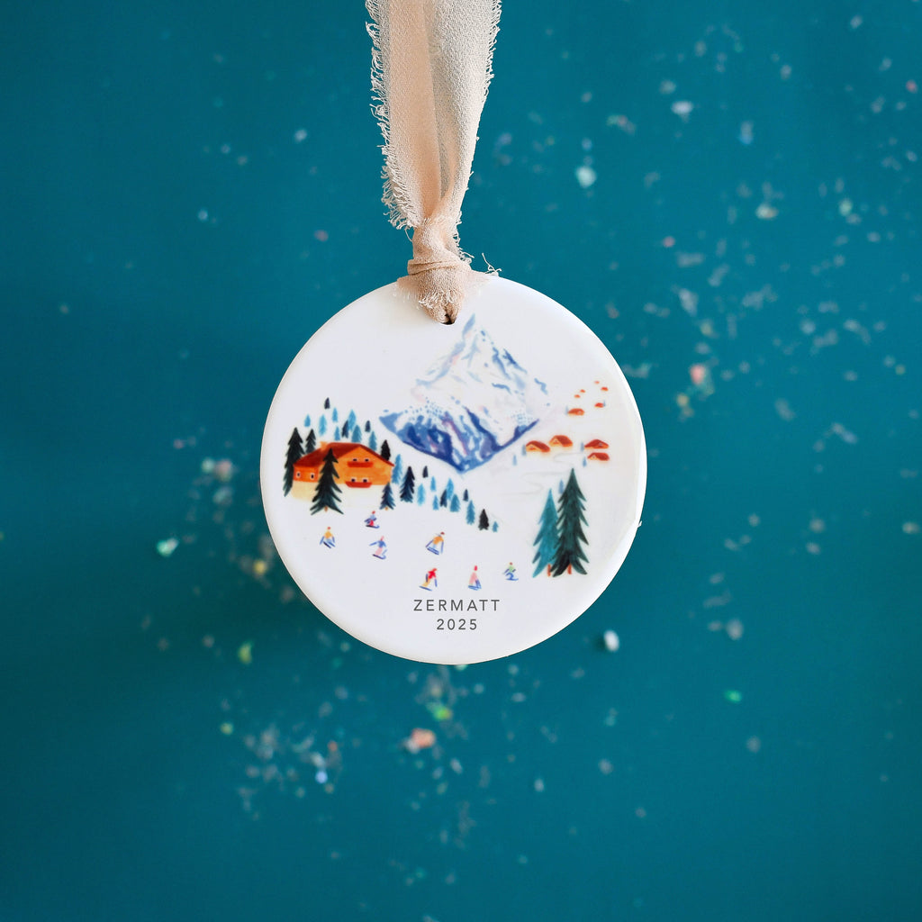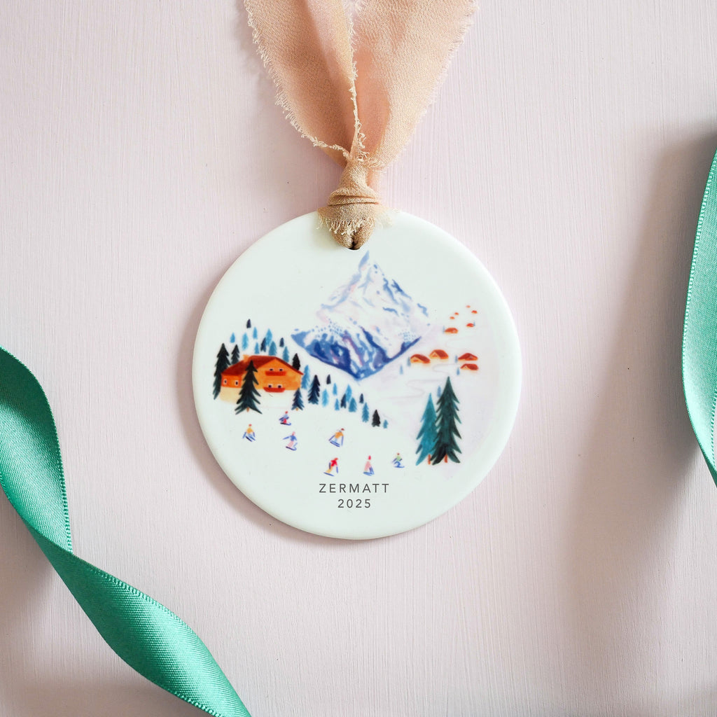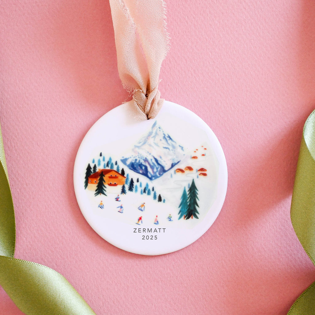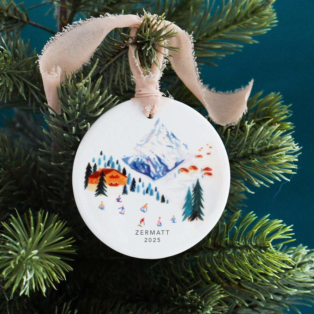 Treat your loved ones to a gift that they will treasure forever with our personalised ceramic ornaments. This delicately illustrated ornament depicts a snowy Zermatt in Ski Season. It makes this perfect keepsake gift which will be cherished for many Christmases to come. Each ornament is designed and handprinted in our studio in the North West of England and can be personalised with a name of your choice.