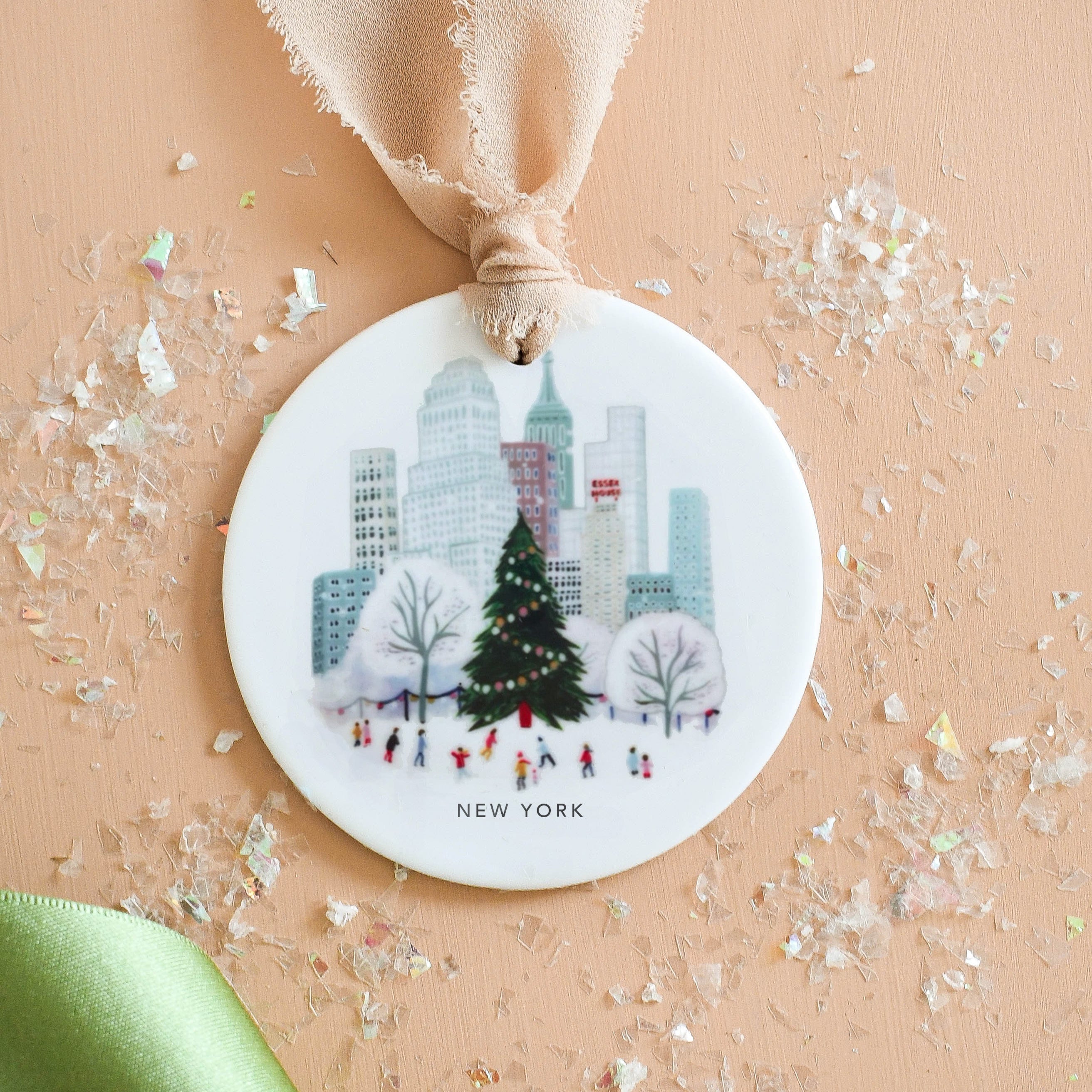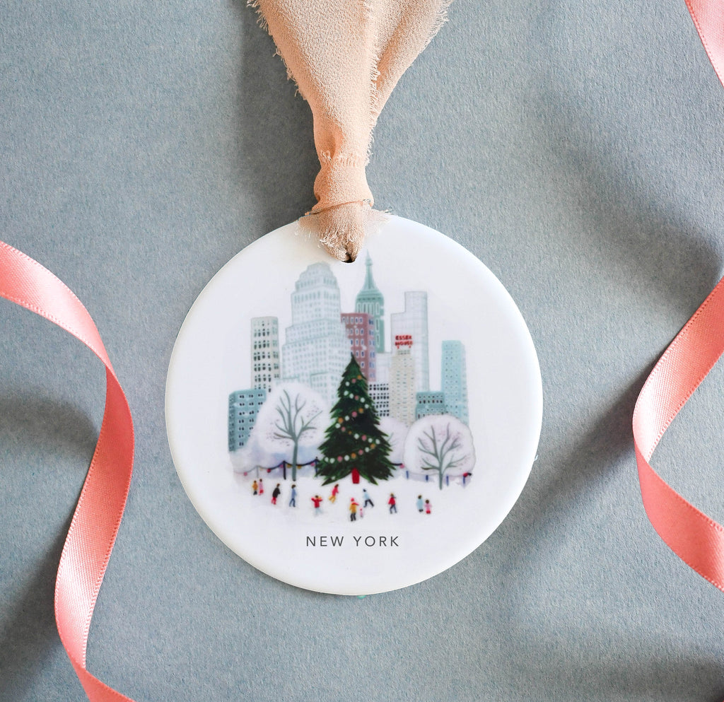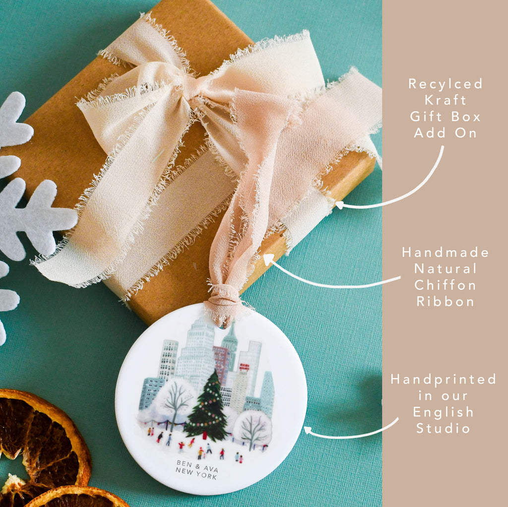 Treat your loved ones to a gift that they will treasure forever with our personalised ceramic ornaments. This delicately illustrated ornament features New York at Christmas. The design depicts a snowy Central Park with its winter ice skating rink and iconic skyline. It makes this perfect keepsake gift which will be cherished for many Christmases to come. Each ornament is designed and handprinted in our studio in the North West of England and can be personalised with a name of your choice.