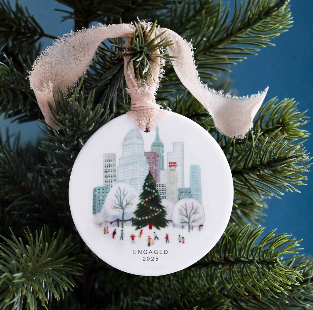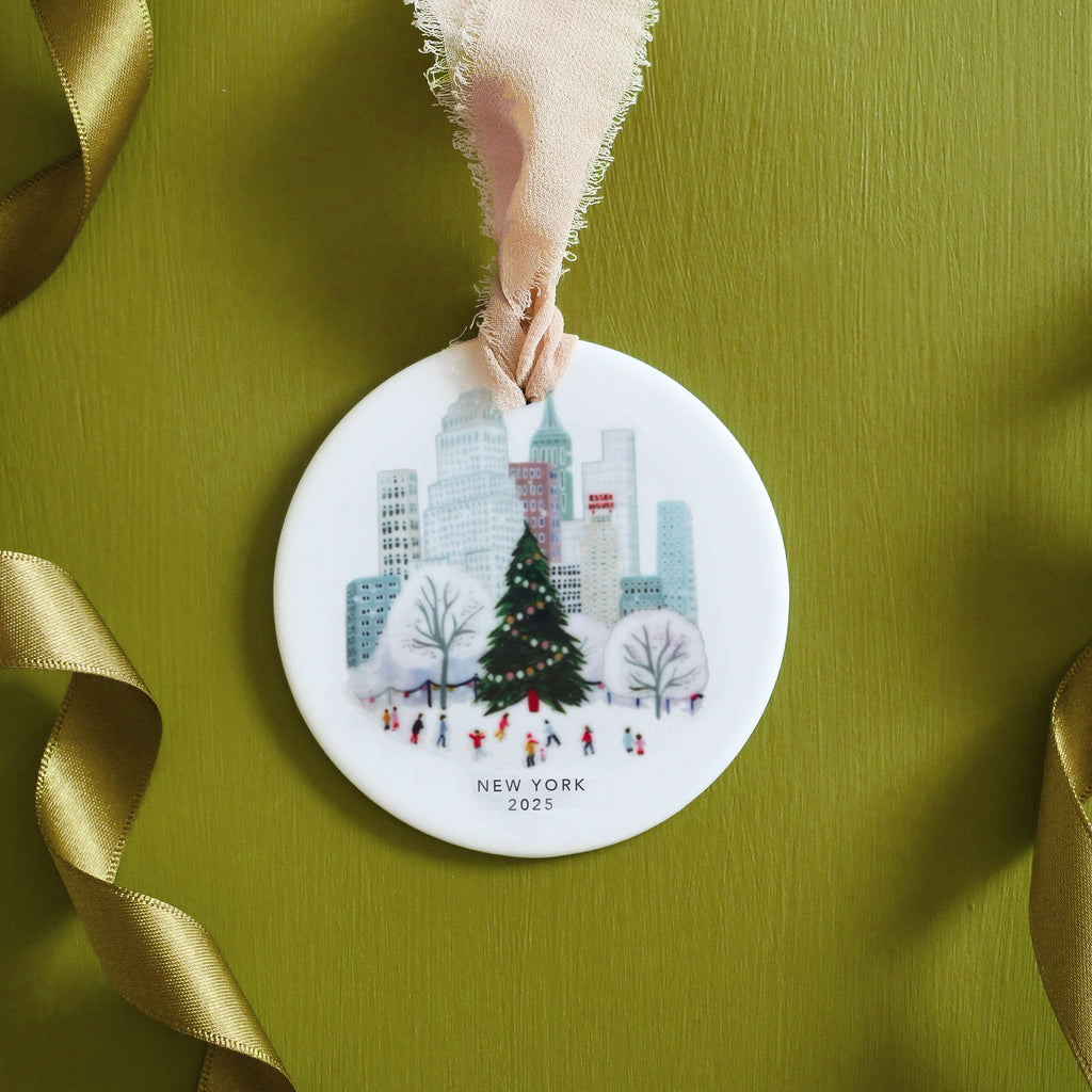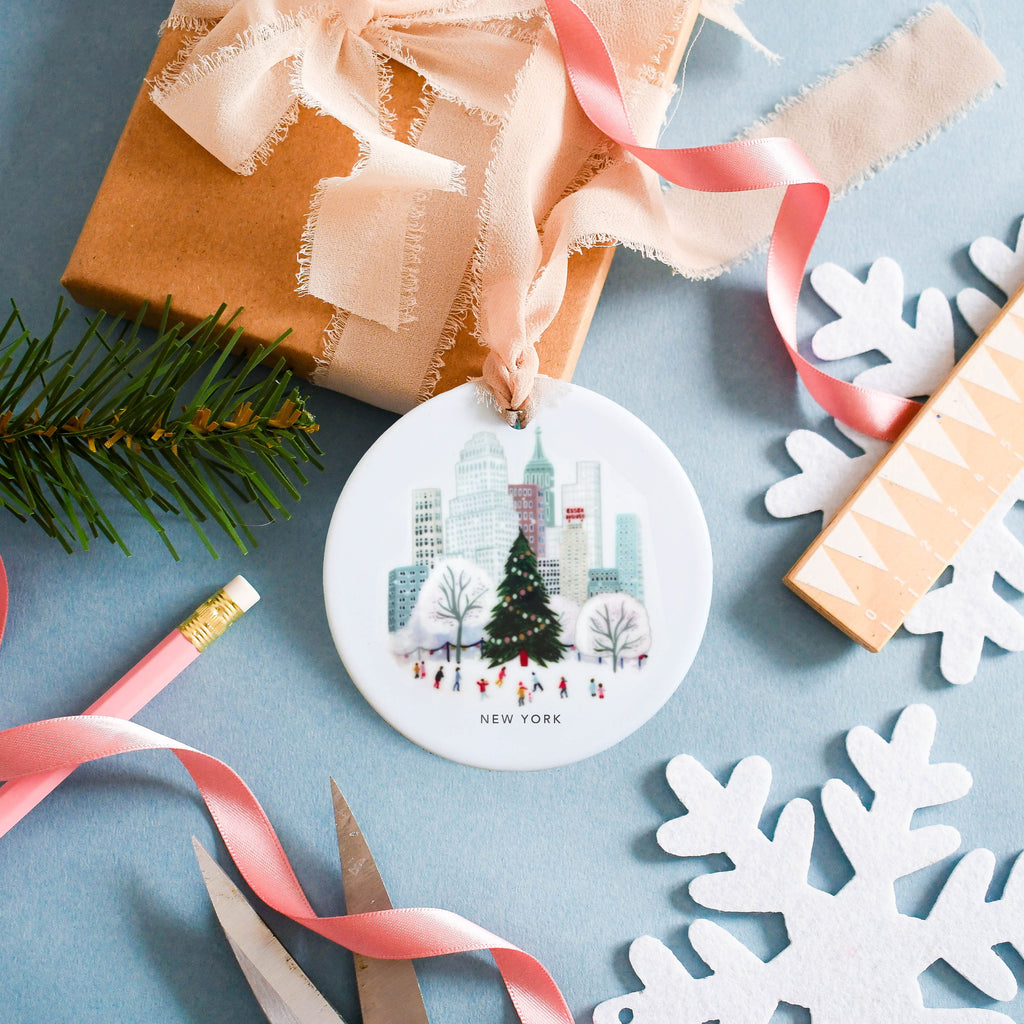 Treat your loved ones to a gift that they will treasure forever with our personalised ceramic ornaments. This delicately illustrated ornament features New York at Christmas. The design depicts a snowy Central Park with its winter ice skating rink and iconic skyline. It makes this perfect keepsake gift which will be cherished for many Christmases to come. Each ornament is designed and handprinted in our studio in the North West of England and can be personalised with a name of your choice.