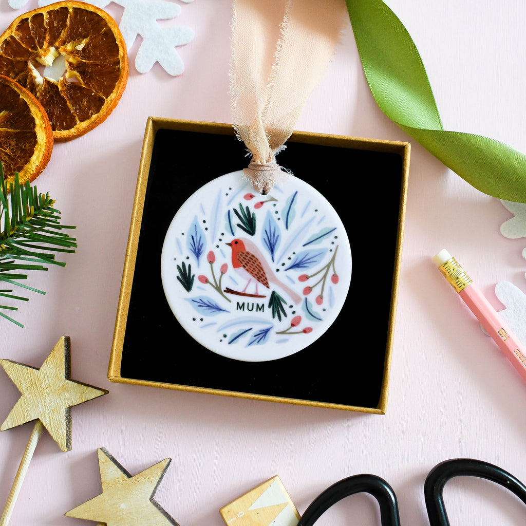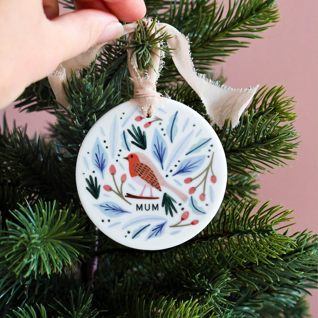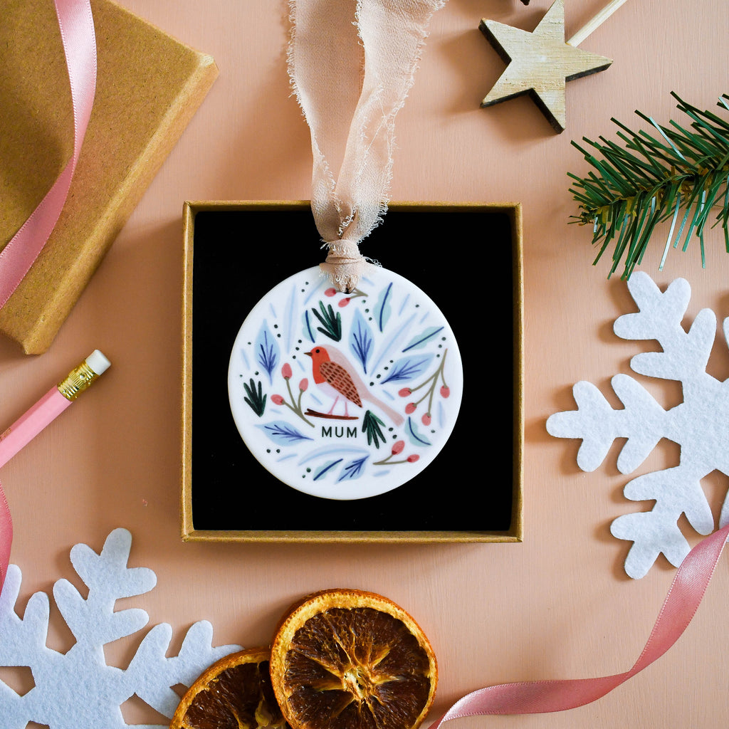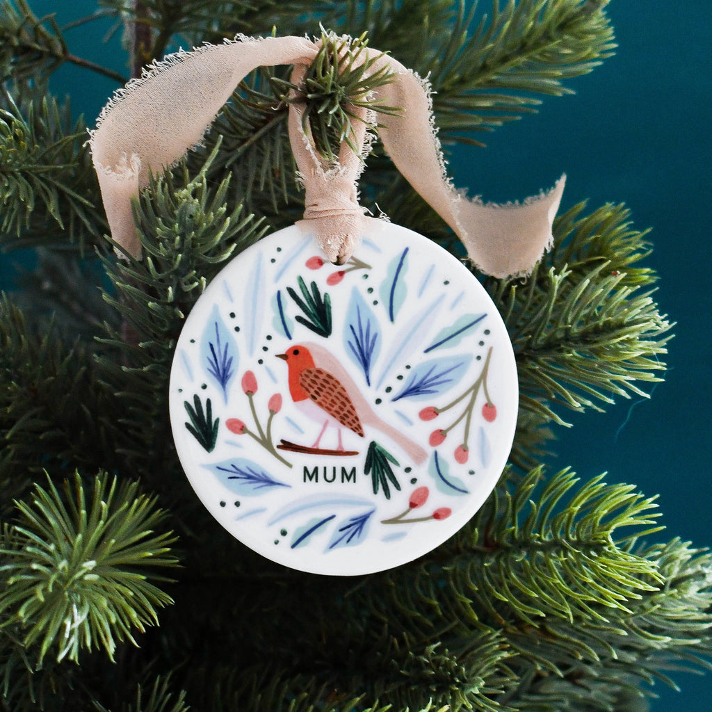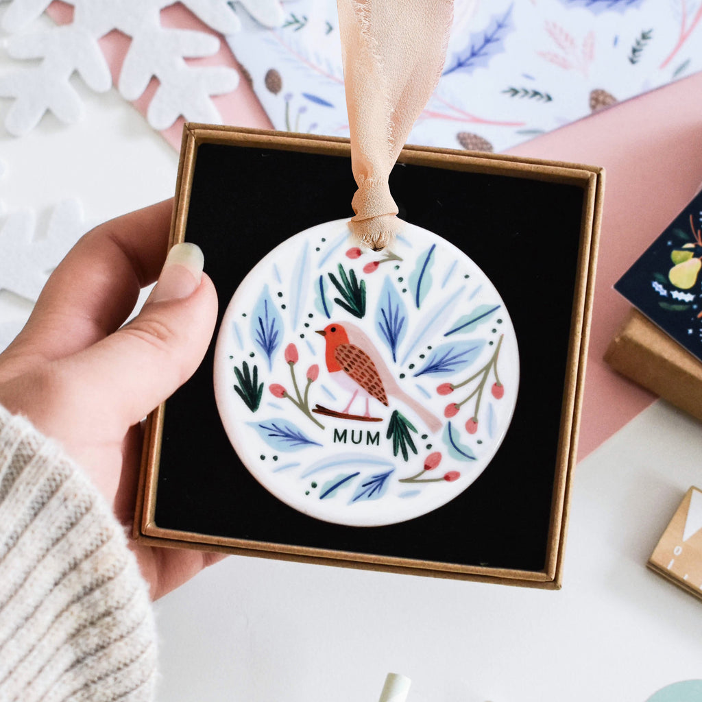 Treat your loved ones to a gift that they will treasure forever with our personalised ceramic ornaments. This delicately illustrated design features a beautiful robin perched amongst winter foliage. It makes this perfect keepsake gift which will be cherished for many Christmases to come. Each ornament is designed and handprinted in our studio in the North West of England and can be personalised with a name of your choice.