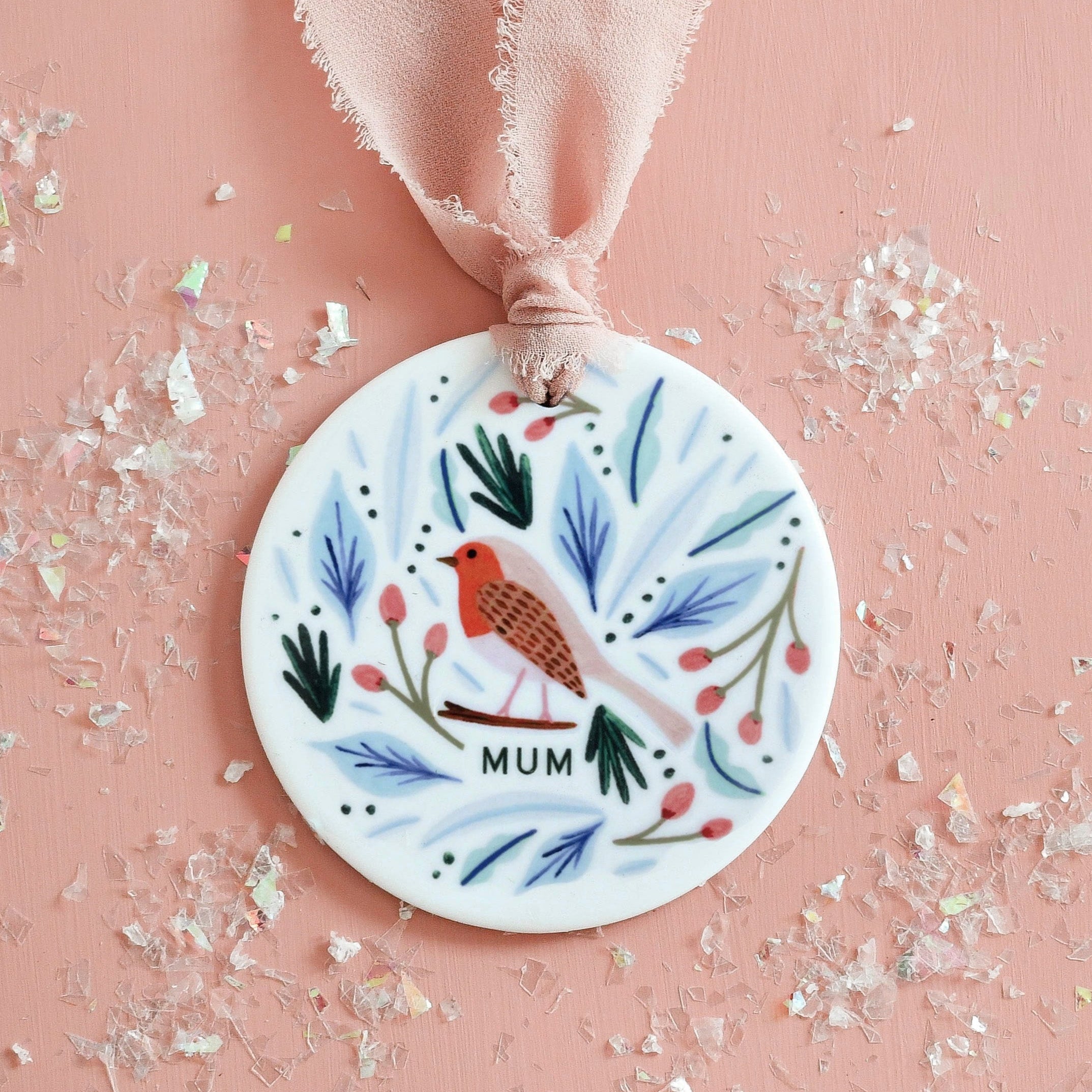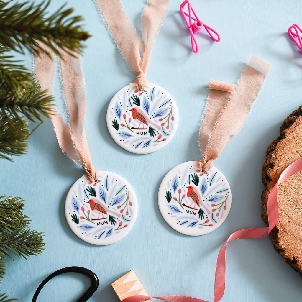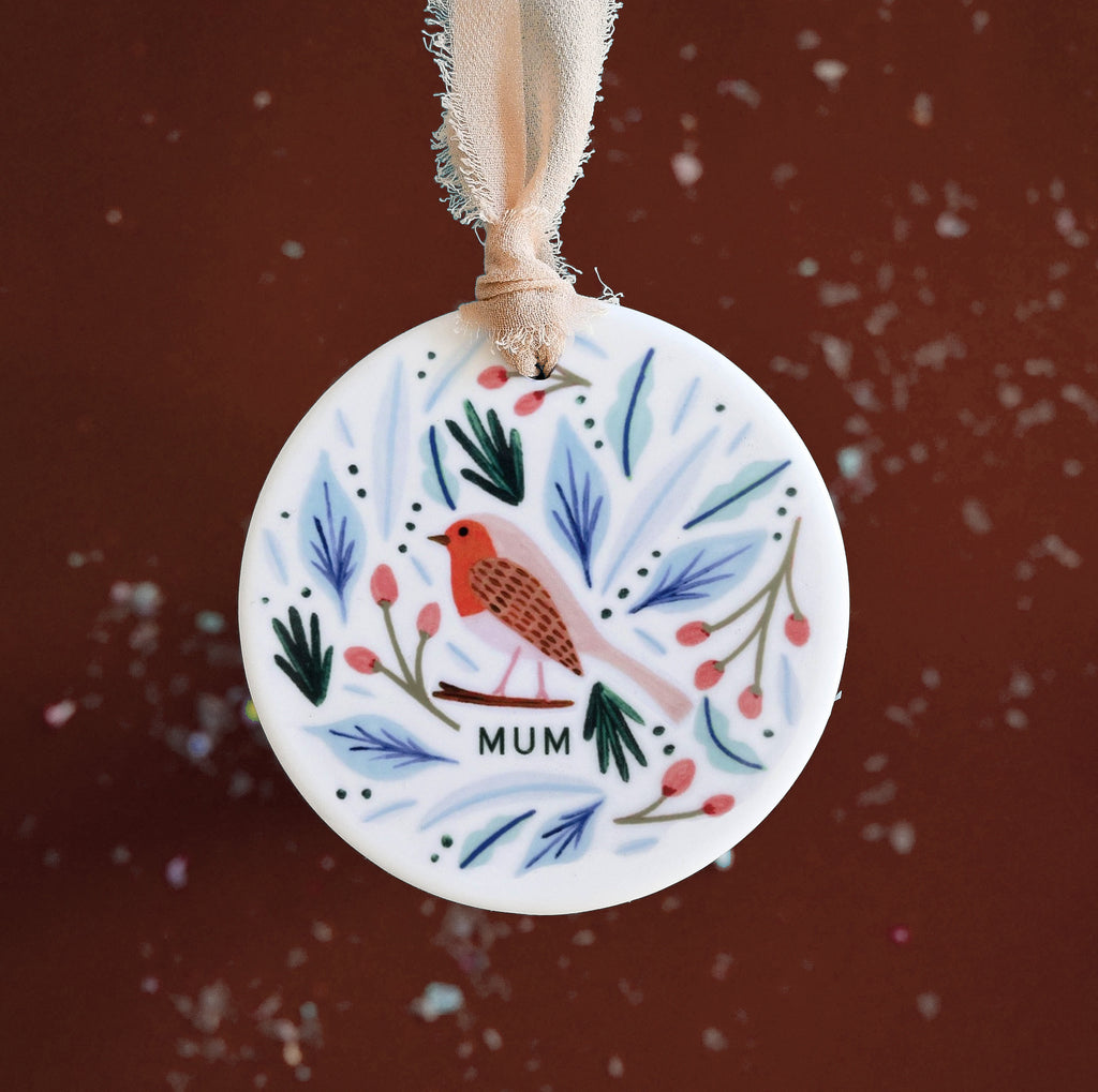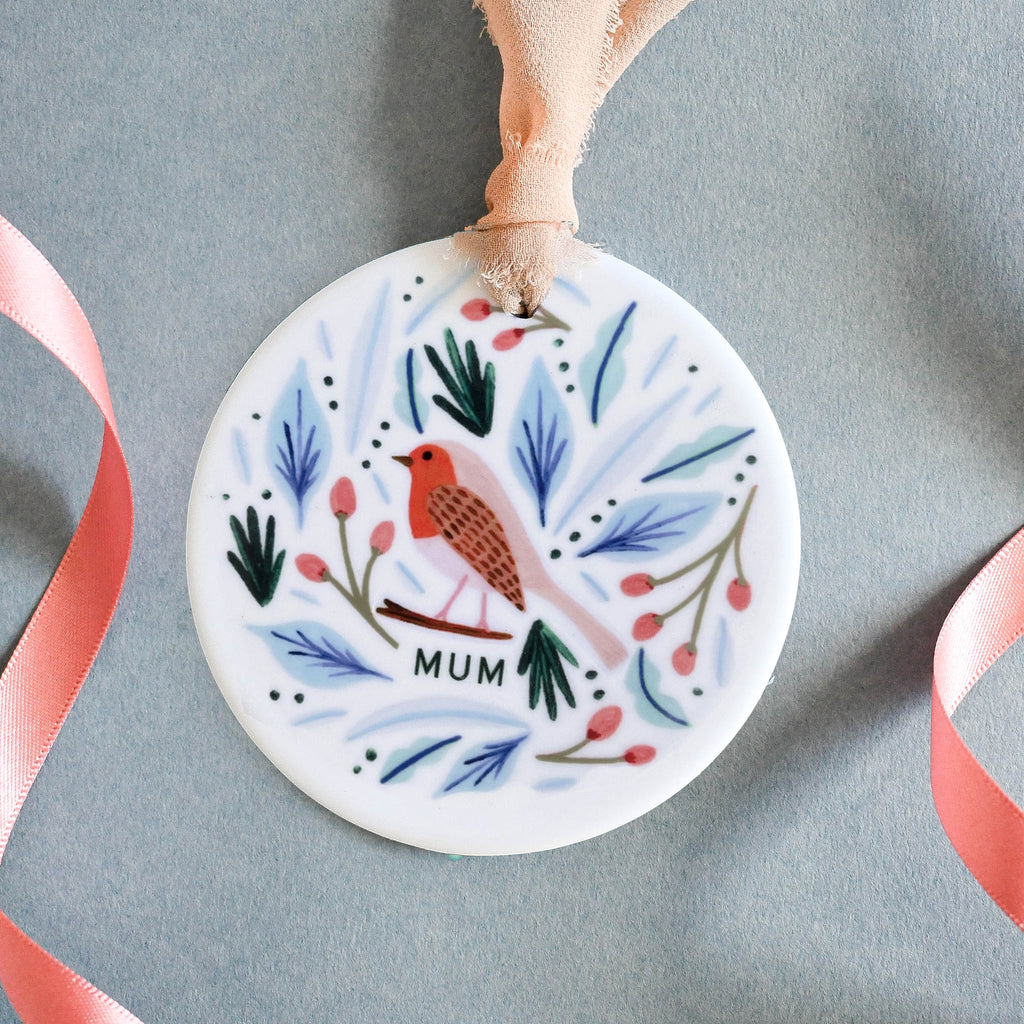 Treat your loved ones to a gift that they will treasure forever with our personalised ceramic ornaments. This delicately illustrated design features a beautiful robin perched amongst winter foliage. It makes this perfect keepsake gift which will be cherished for many Christmases to come. Each ornament is designed and handprinted in our studio in the North West of England and can be personalised with a name of your choice.