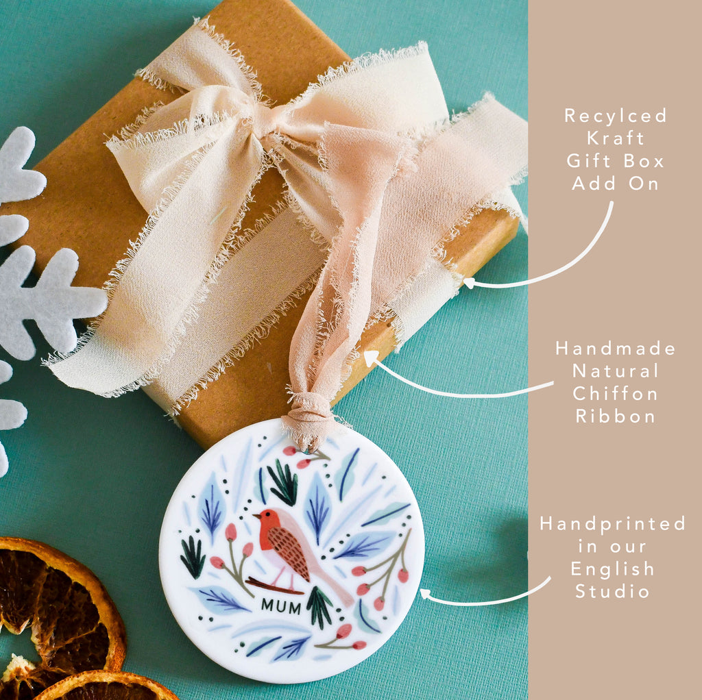 Add an extra touch of Christmas magic by selecting our luxury gift box add on. Your ornament will be placed in a kraft gift box, wrapped in a Natural Chiffon Ribbon and will be finished with an illustrated gift tag with a message of your choice.