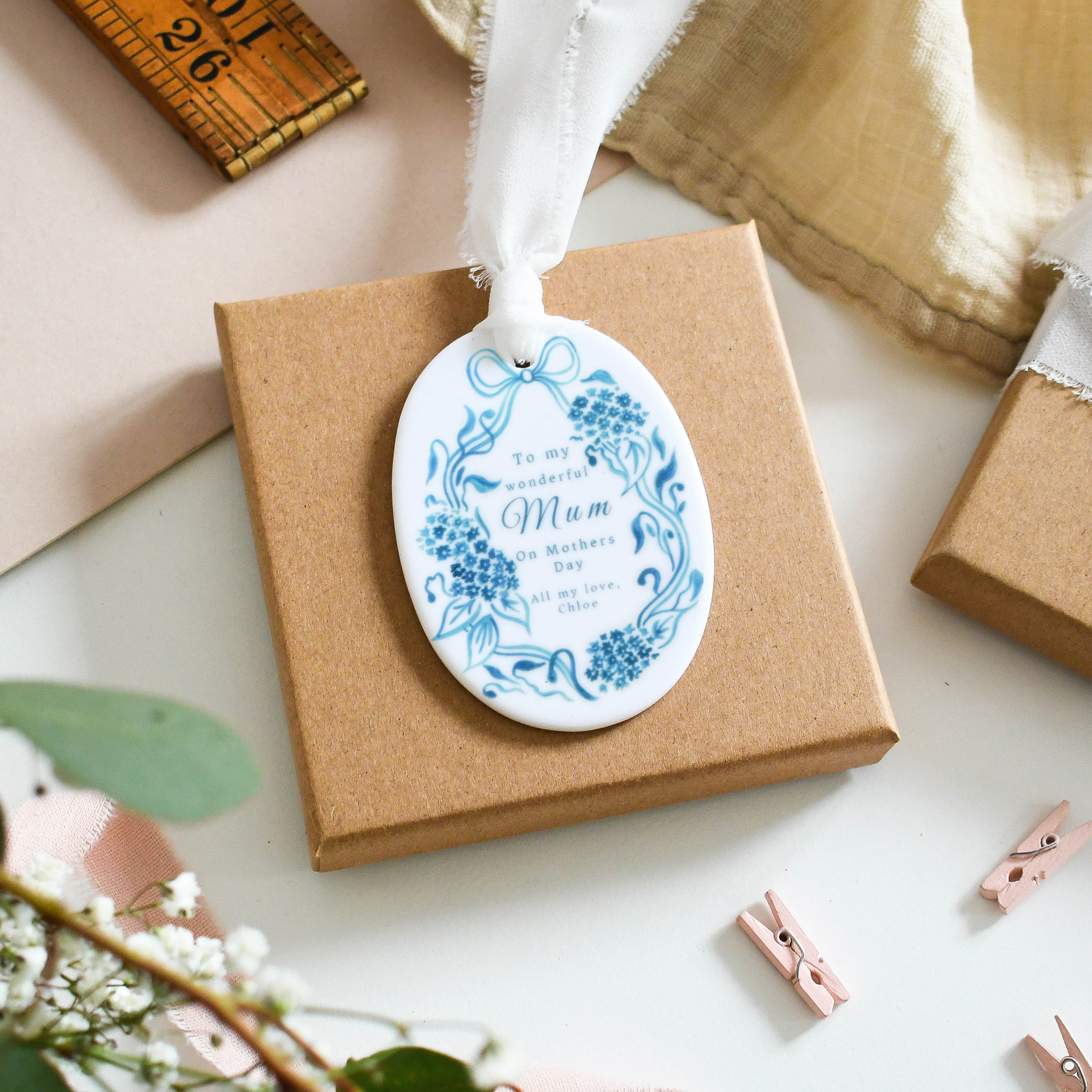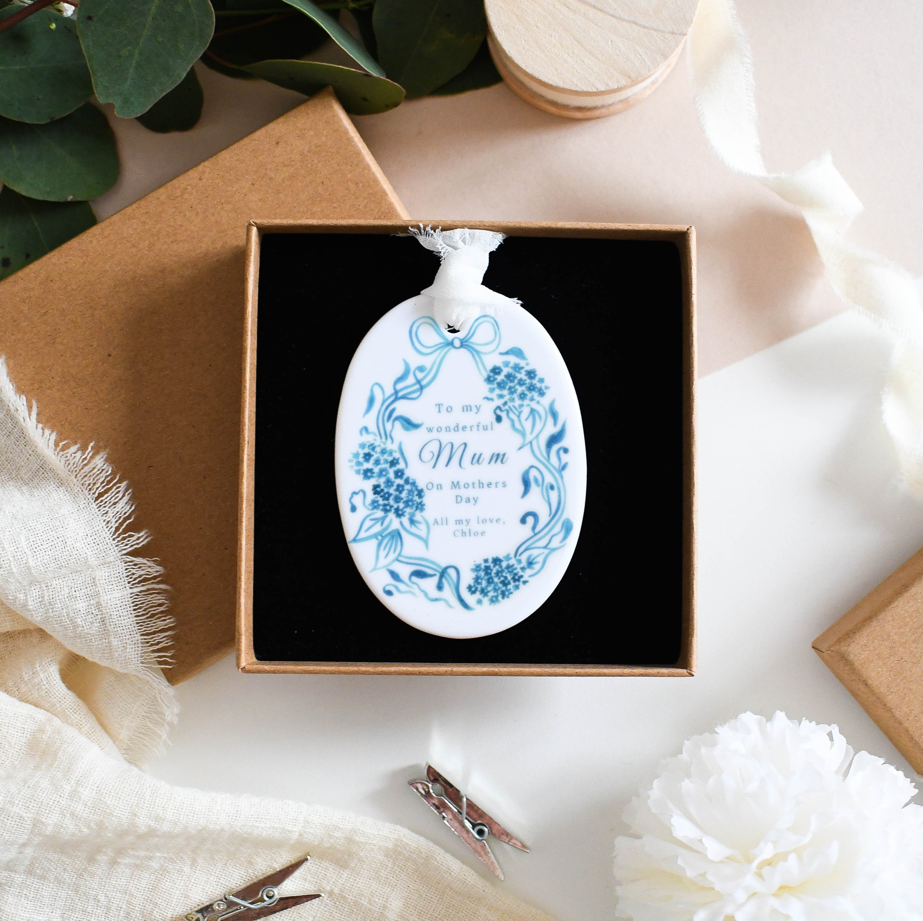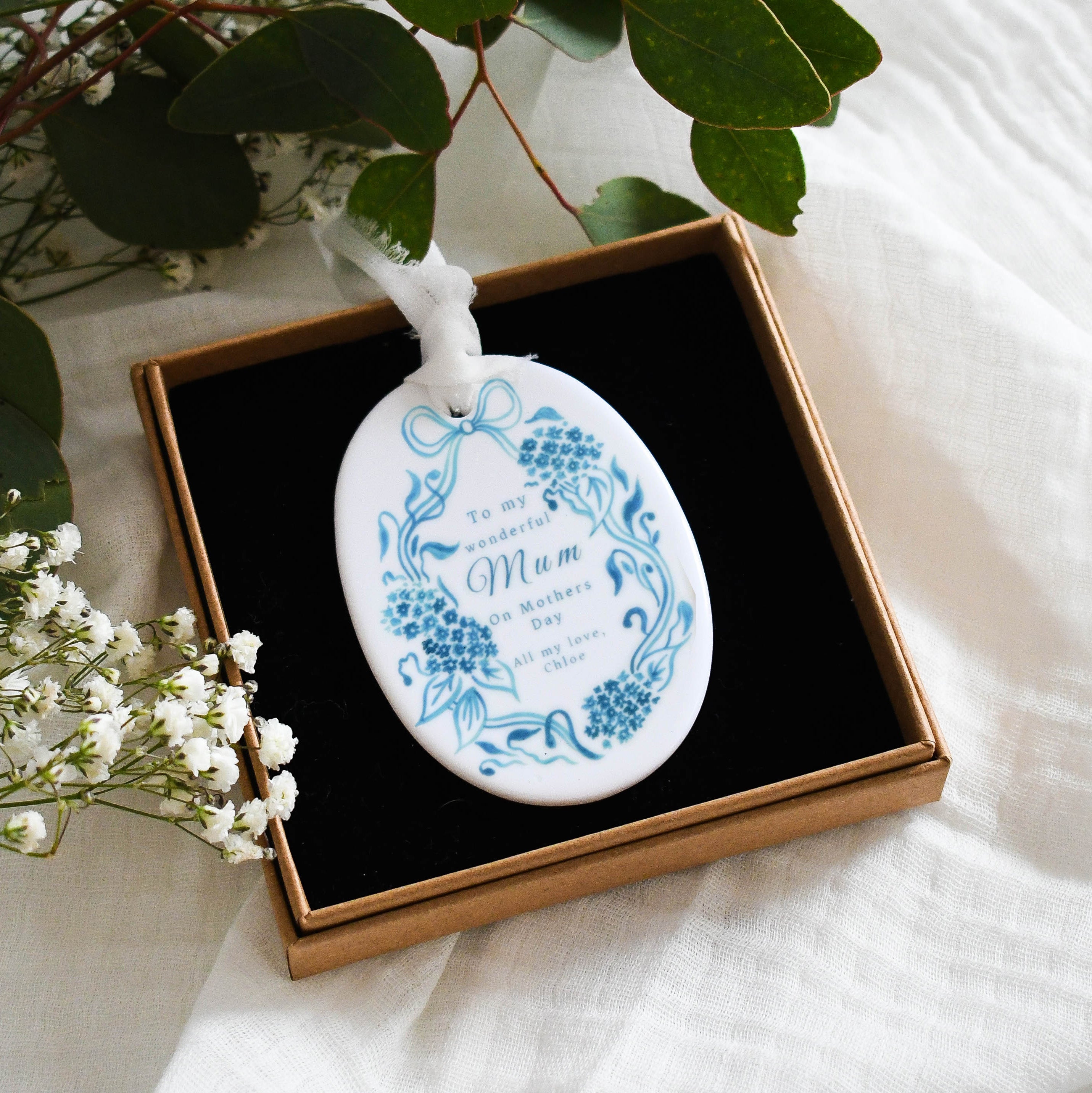 Celebrate your wonderful mum with this personalised ceramic ornament, featuring a delicate blue floral design and your own heartfelt message. A beautiful keepsake for Mother’s Day, it’s a lovely way to show your appreciation and make her feel truly special.