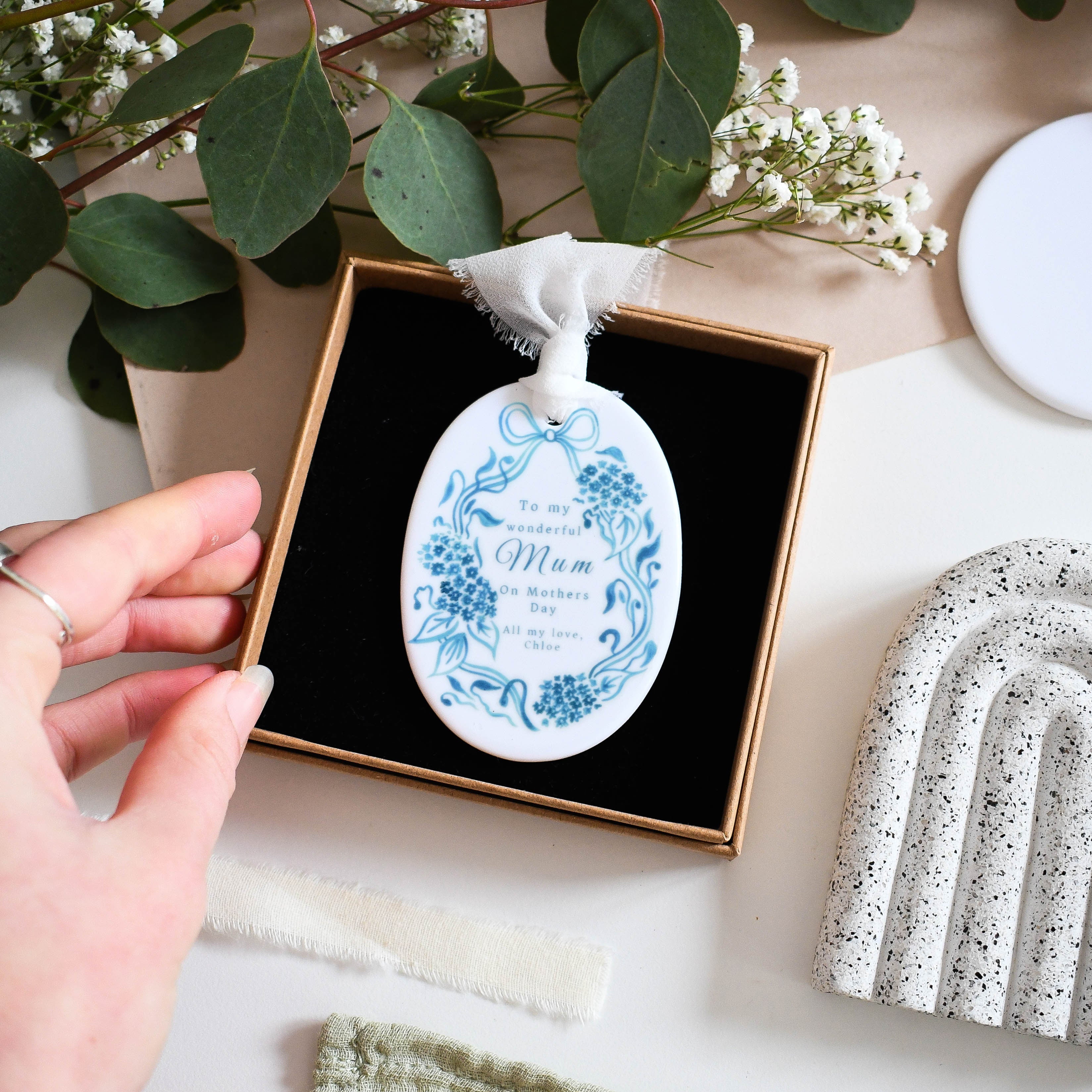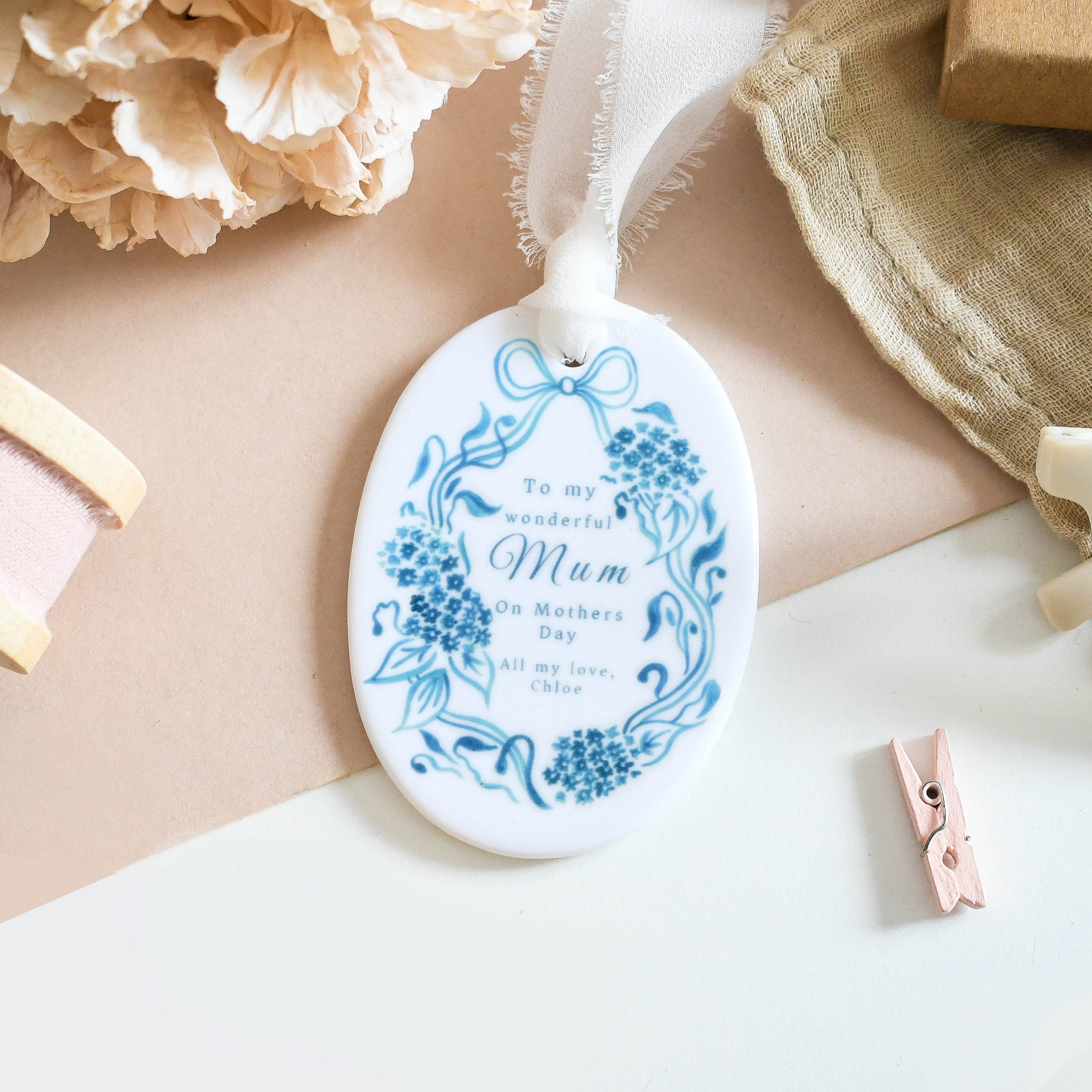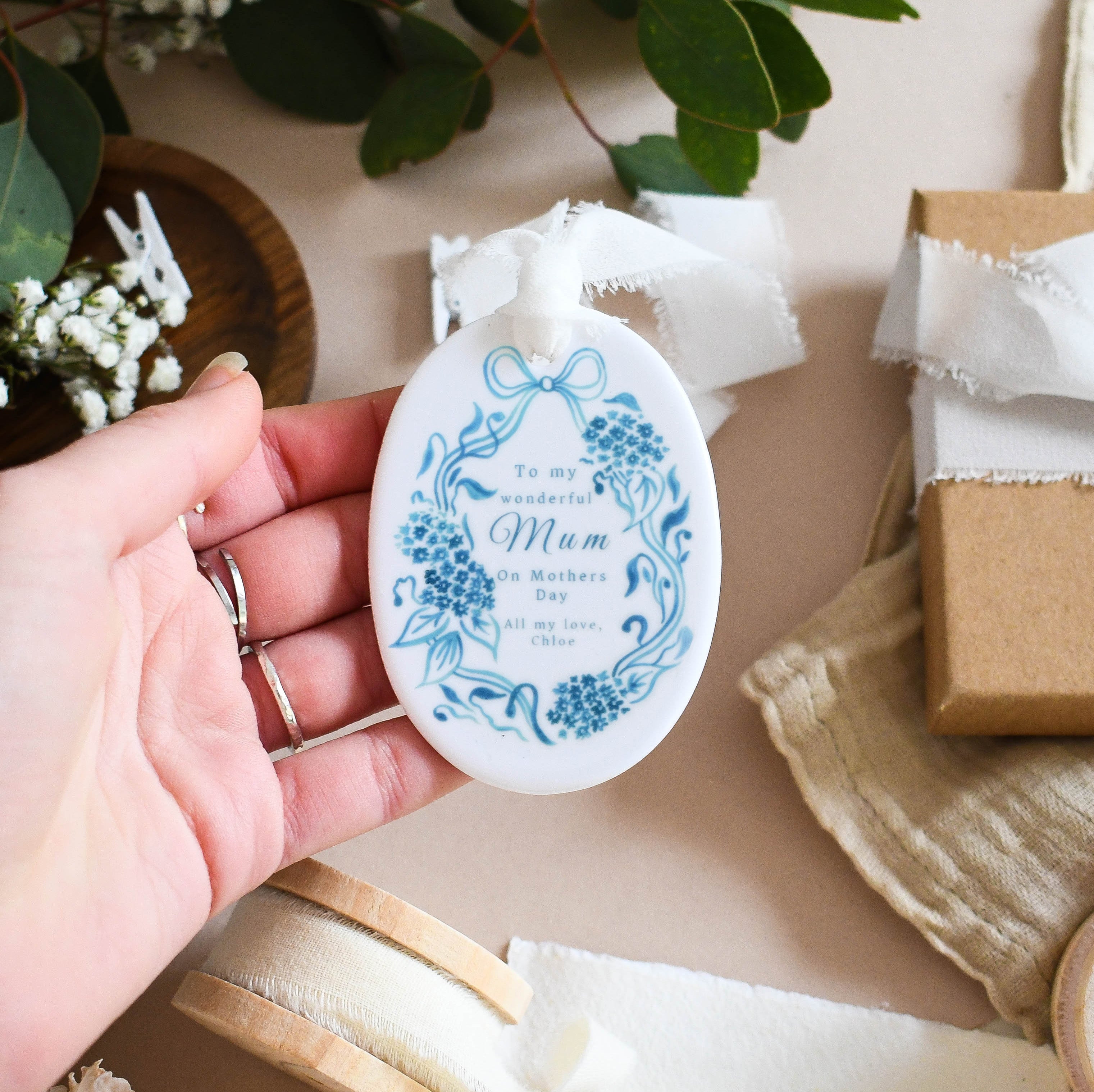 Celebrate your wonderful mum with this personalised ceramic ornament, featuring a delicate blue floral design and your own heartfelt message. A beautiful keepsake for Mother’s Day, it’s a lovely way to show your appreciation and make her feel truly special.