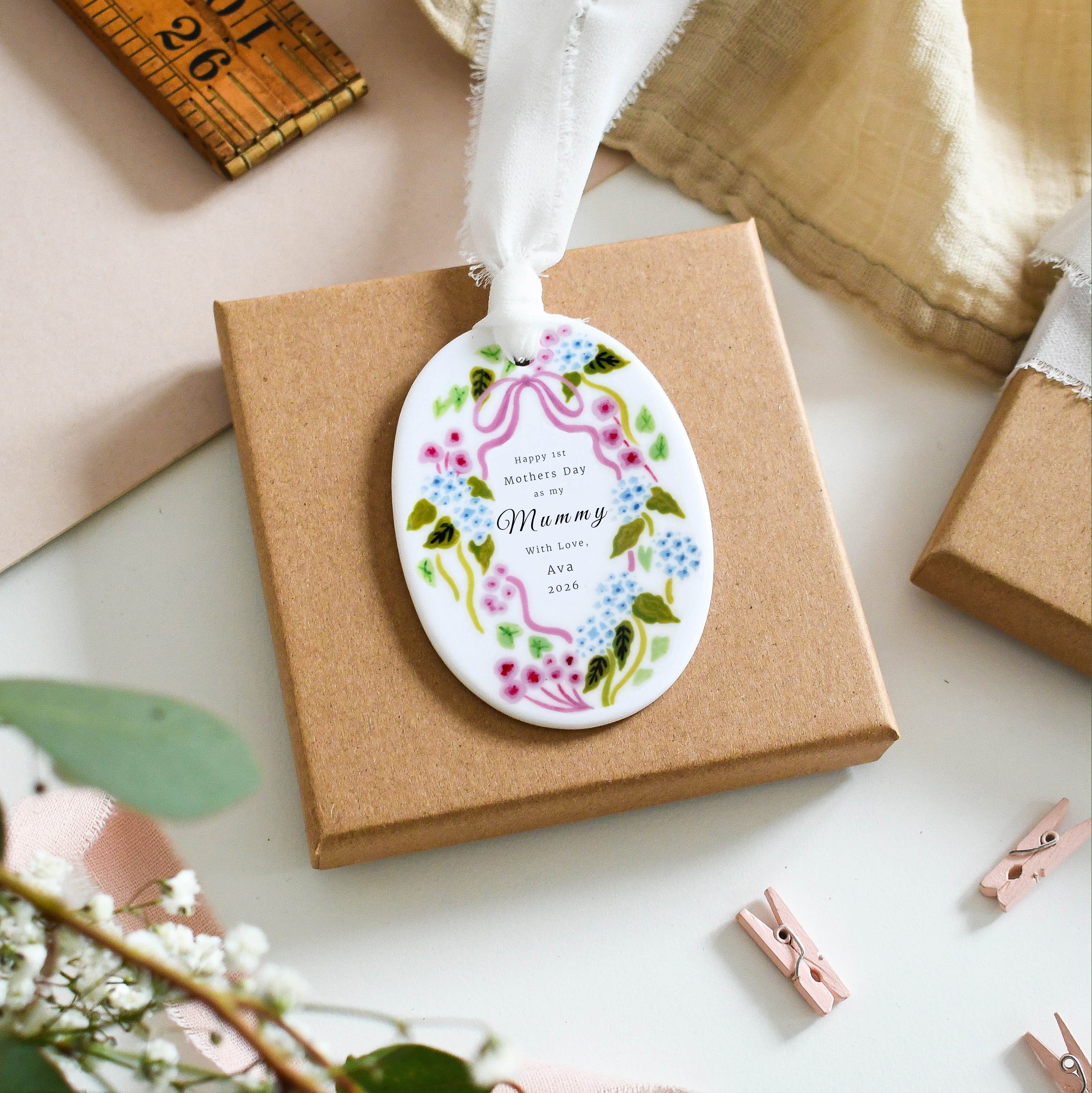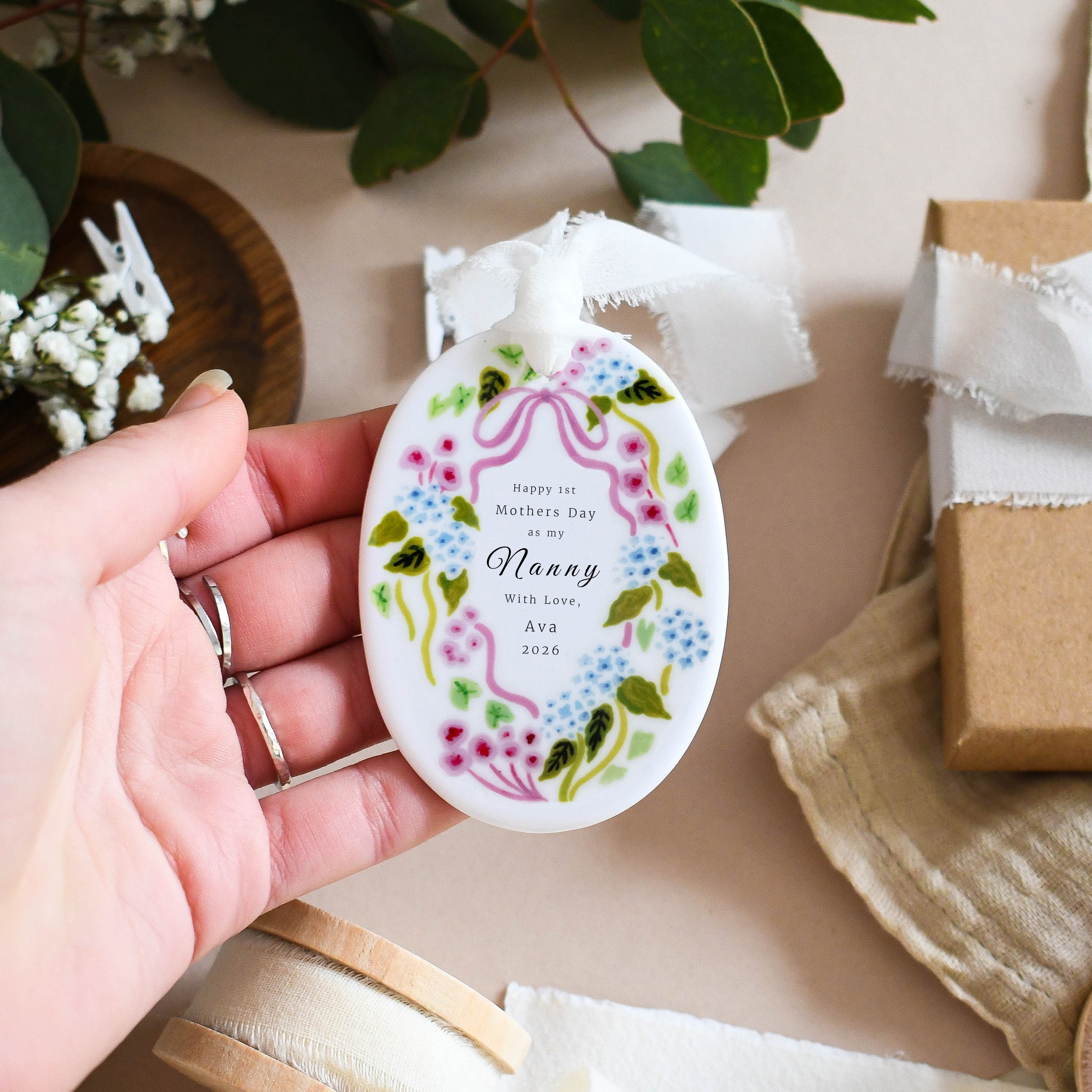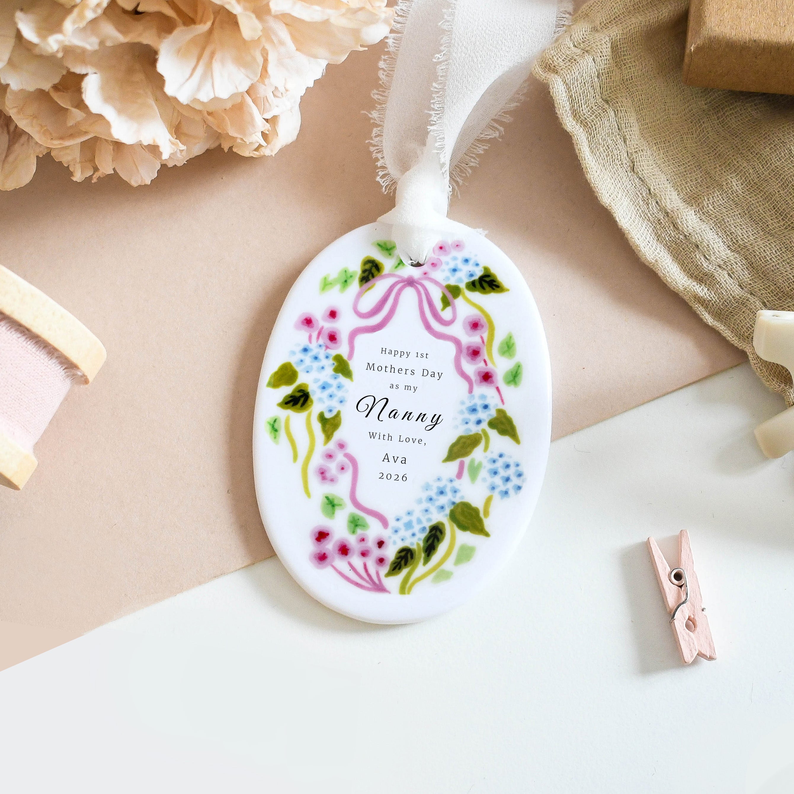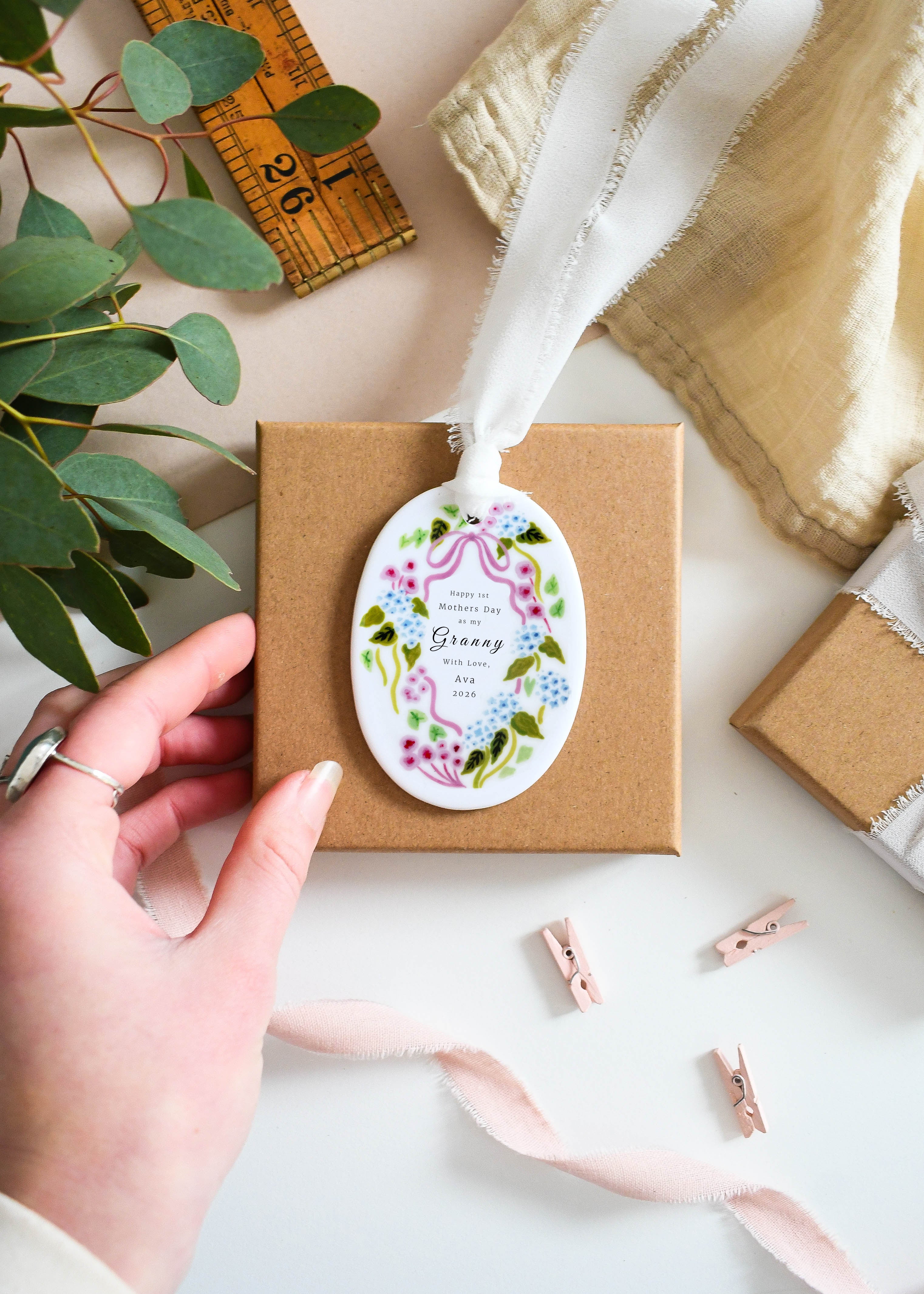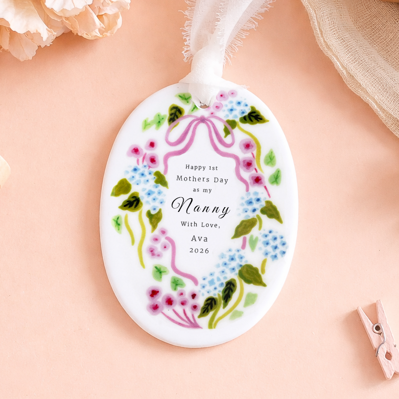 Make Nanny’s first Mother’s Day one to treasure with this personalised ceramic ornament, featuring my hand-drawn floral design. Finished with soft pastel details and custom wording, it’s a lovely keepsake she can display year after year.