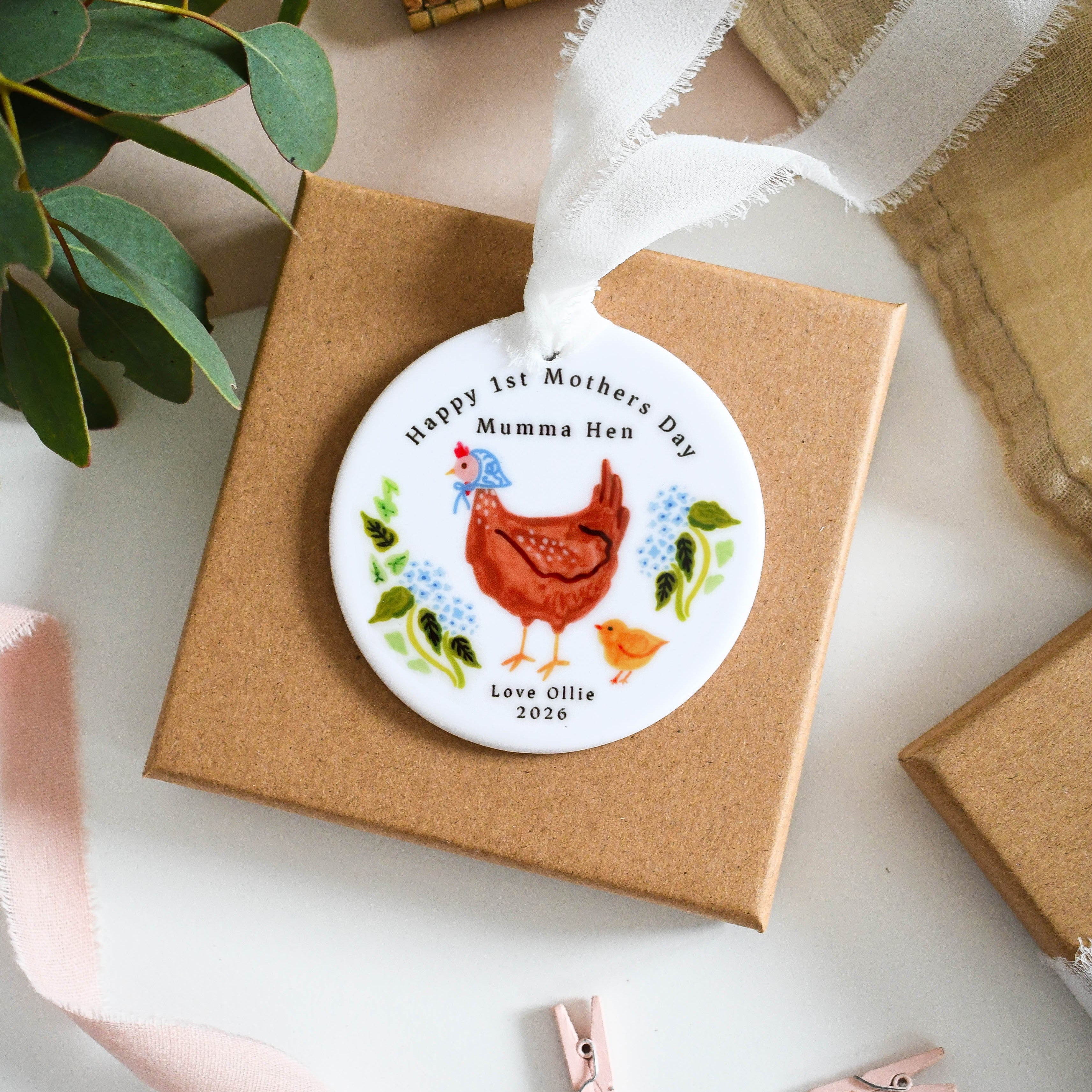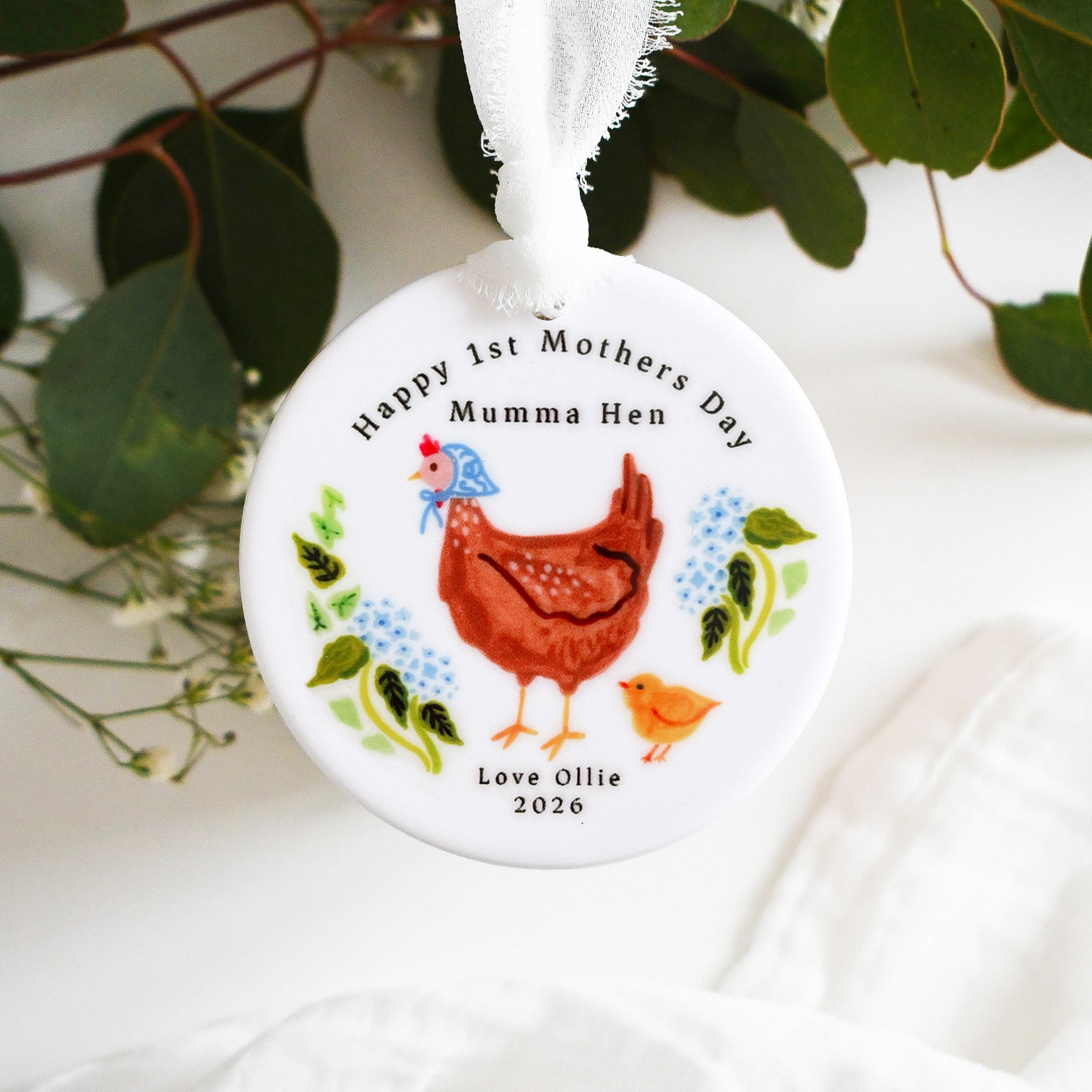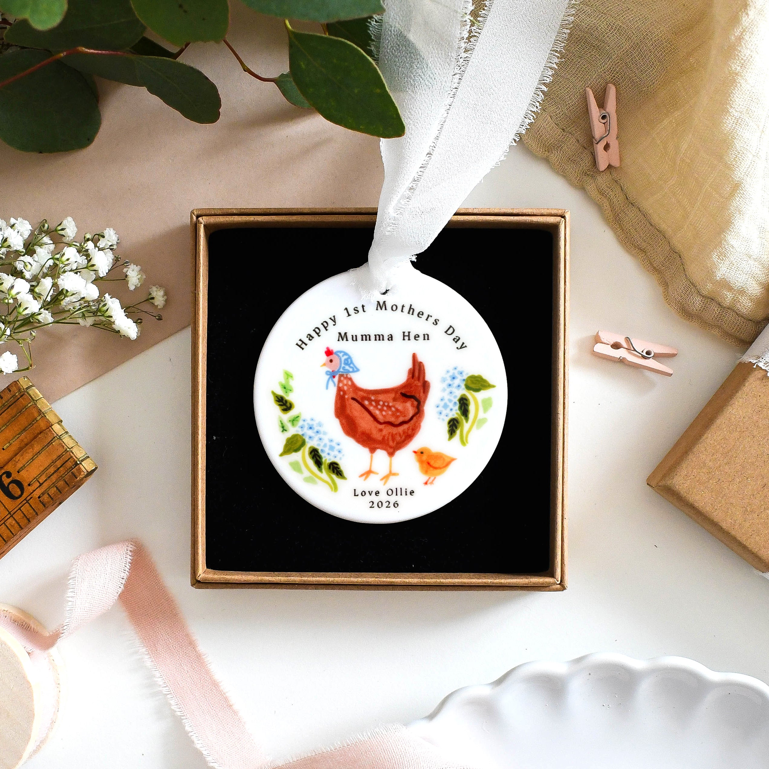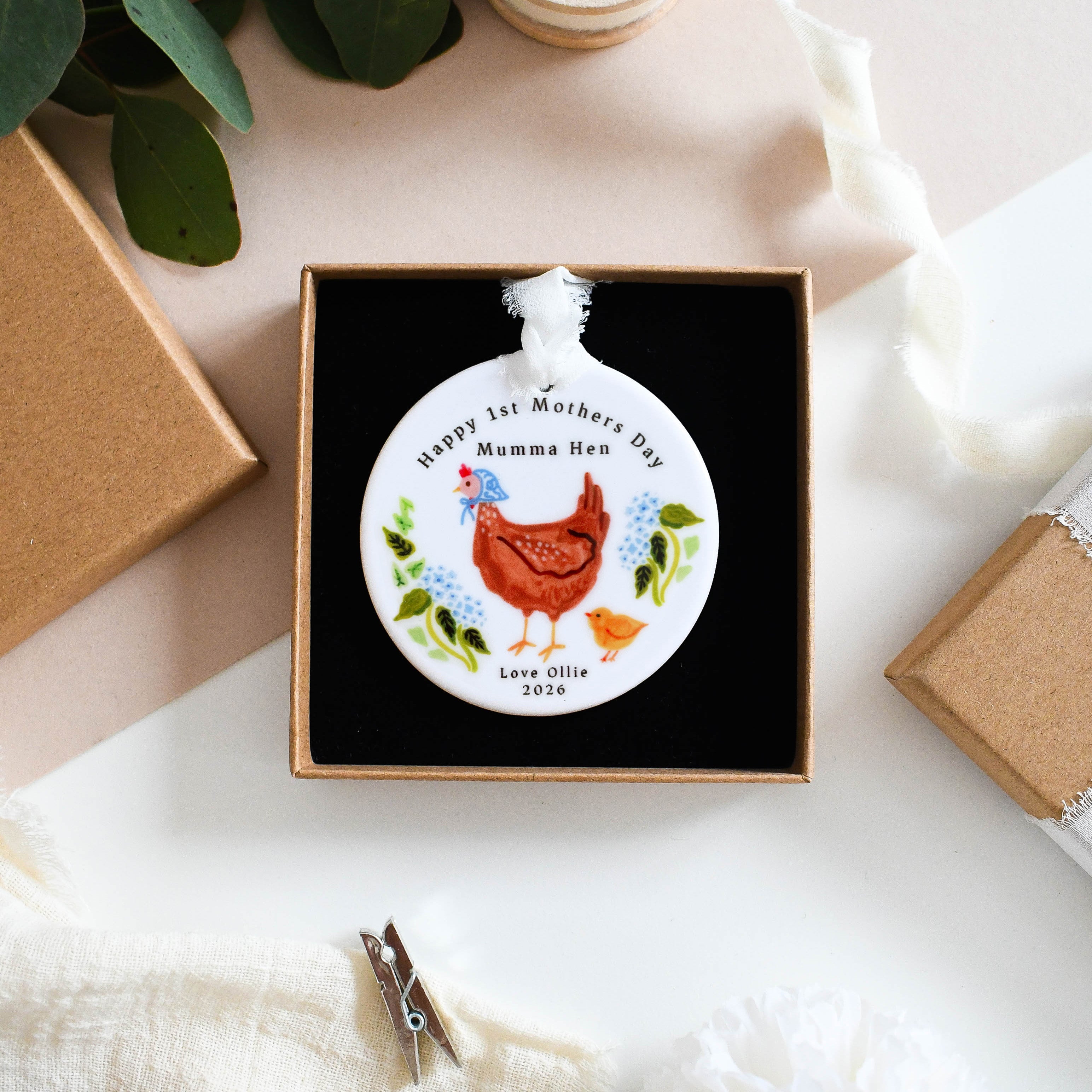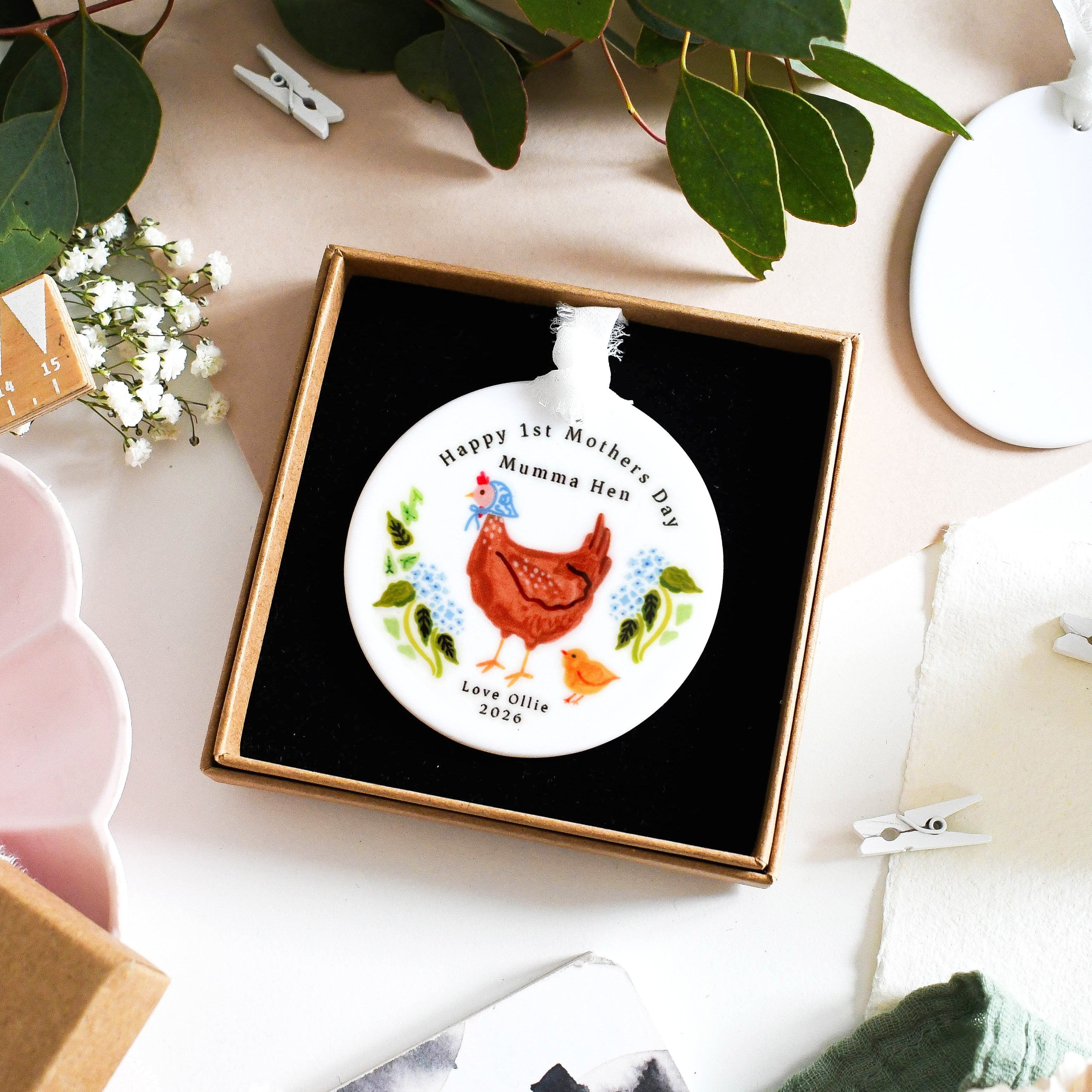 Celebrate Mum with this personalised Mother Hen ceramic ornament – a sweet keepsake inspired by the love between a mum and her little one. Featuring a hand-illustrated mother hen and chick, this custom decoration can be personalised with names, a message, and a special year, making it a meaningful gift for Mother’s Day, new mums, or simply to show appreciation.