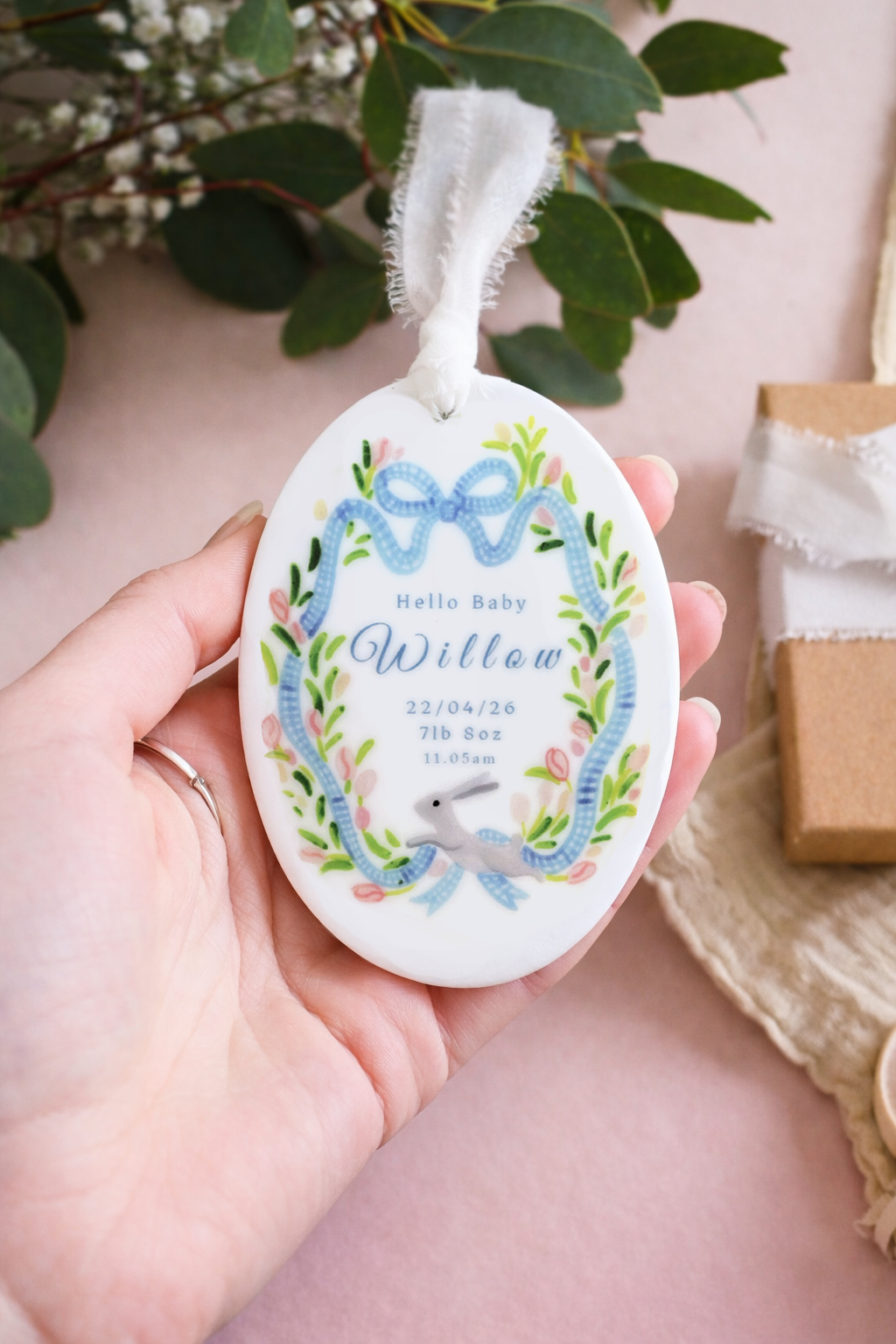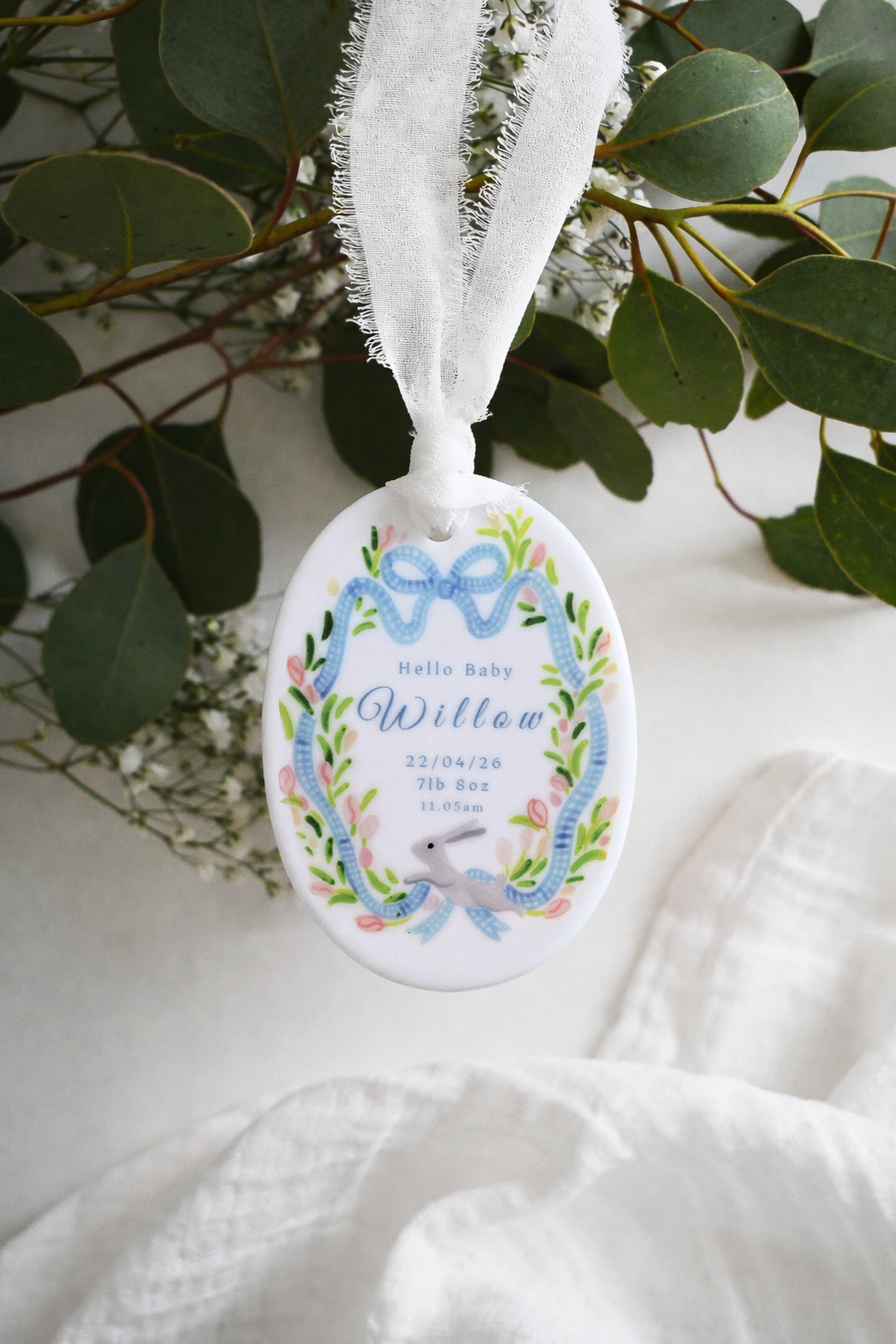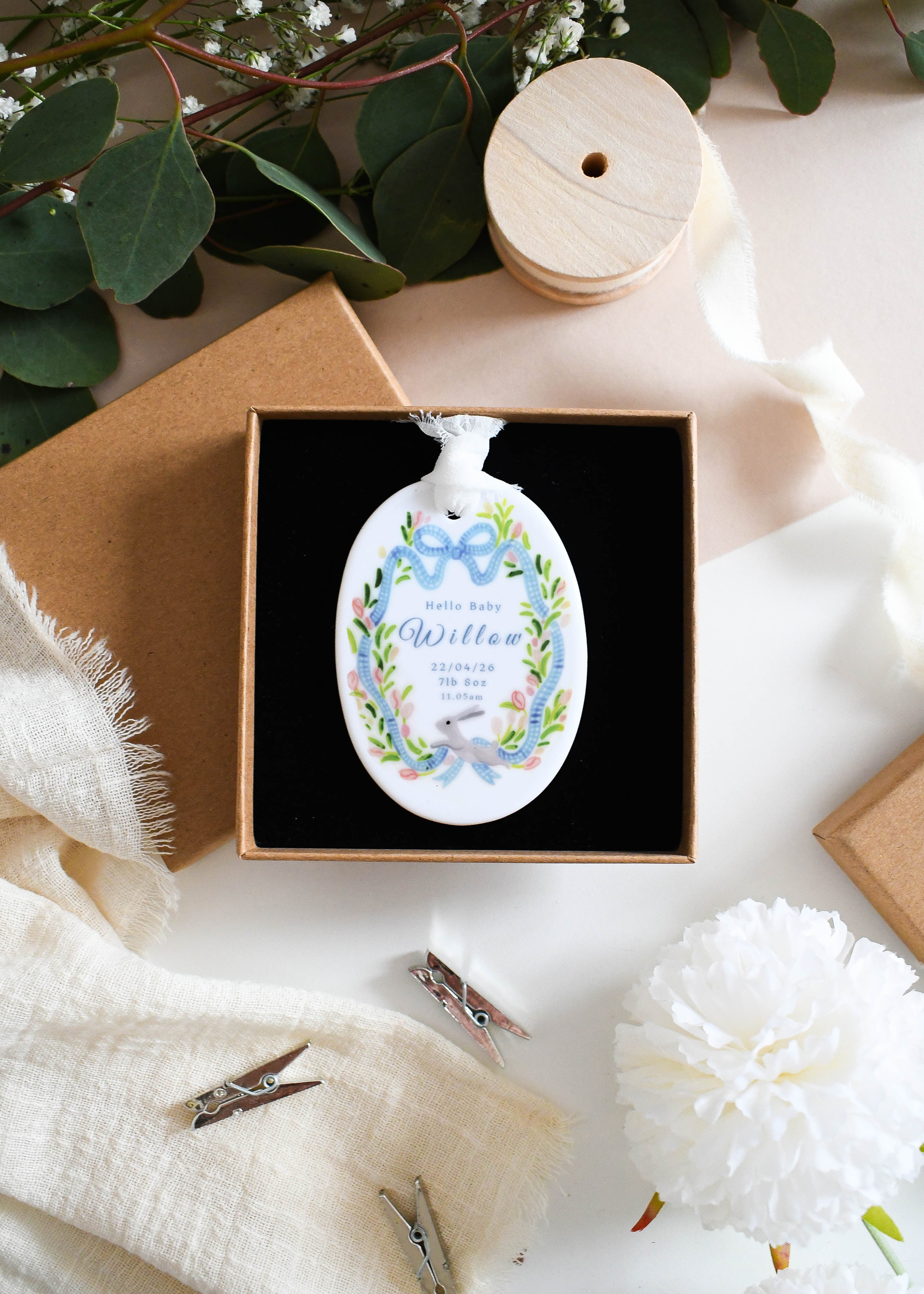 Welcome a precious new arrival with this beautifully personalised baby ornament. Featuring a delicate blue ribbon frame and a sweet little bunny illustration, each ornament is customised with the baby’s name, birth date and birth weight to create a meaningful keepsake of their special day. Finished with a soft hanging ribbon, it’s a thoughtful gift for new parents and a lovely way to celebrate and remember those first precious moments.