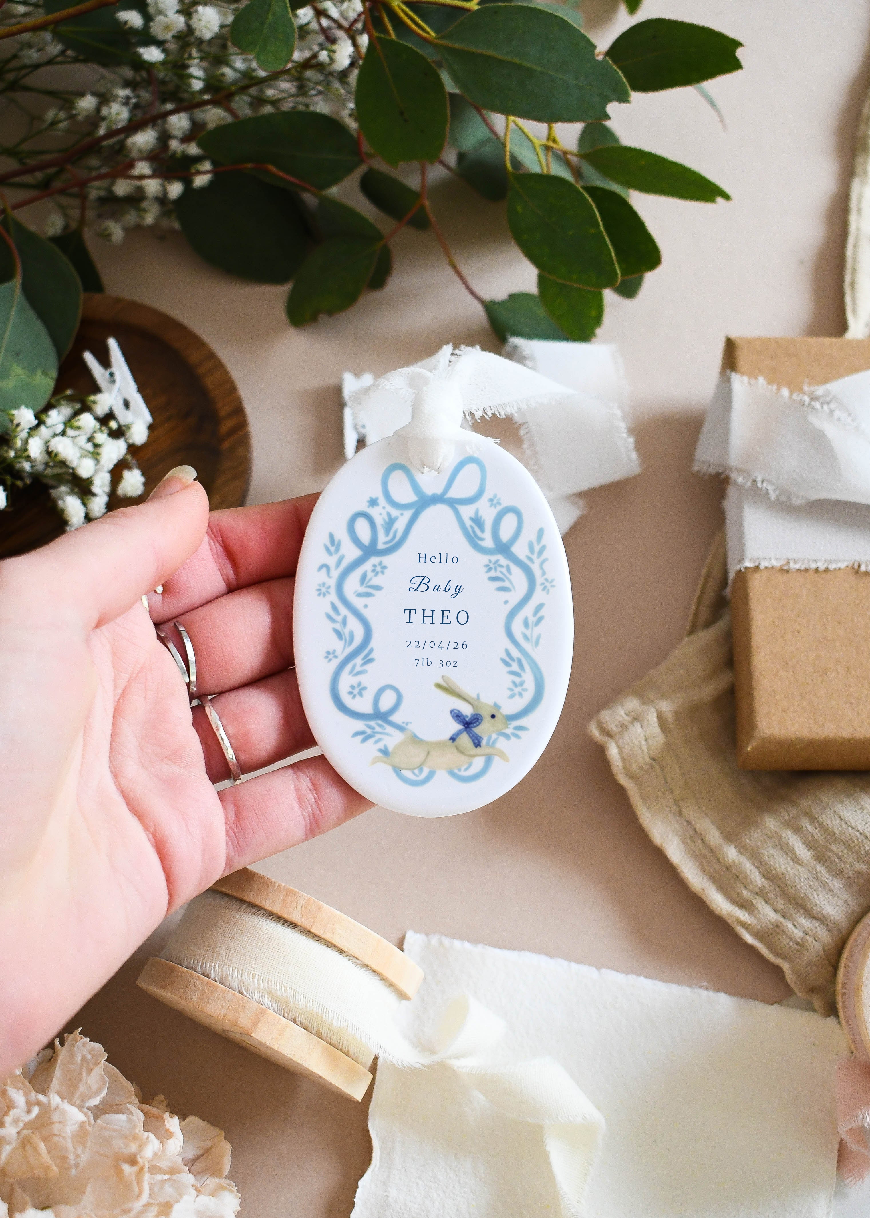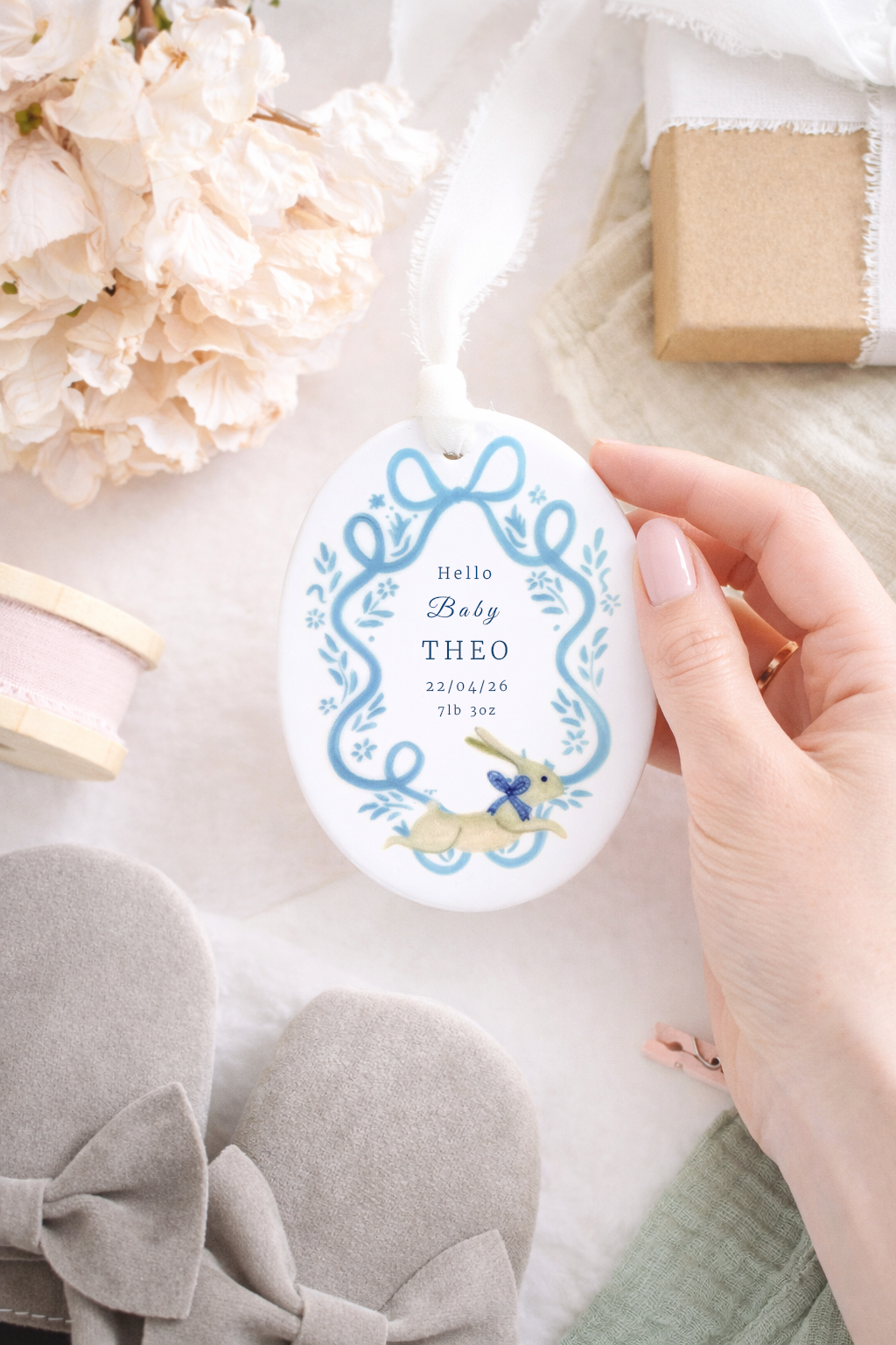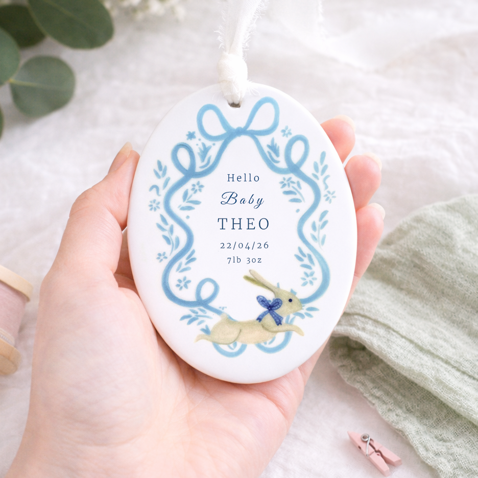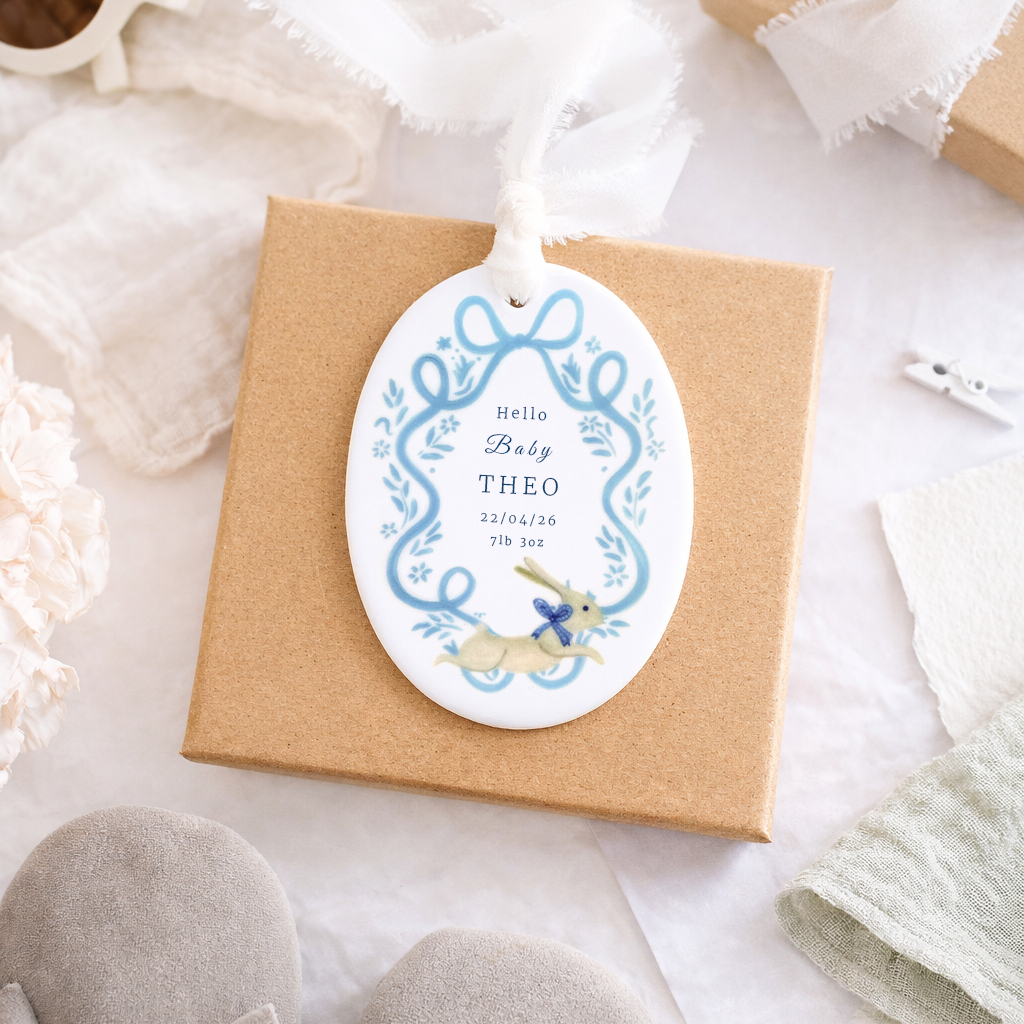 Celebrate the arrival of a precious little one with this beautifully personalised baby ornament. Featuring a delicate blue ribbon frame surrounded by soft floral details and a sweet little bunny illustration, each ornament is customised with the baby’s name, birth date, birth weight and time of birth to create a truly special keepsake. Finished with a soft hanging ribbon, it makes a thoughtful gift for new parents and a lovely way to treasure those first precious moments.