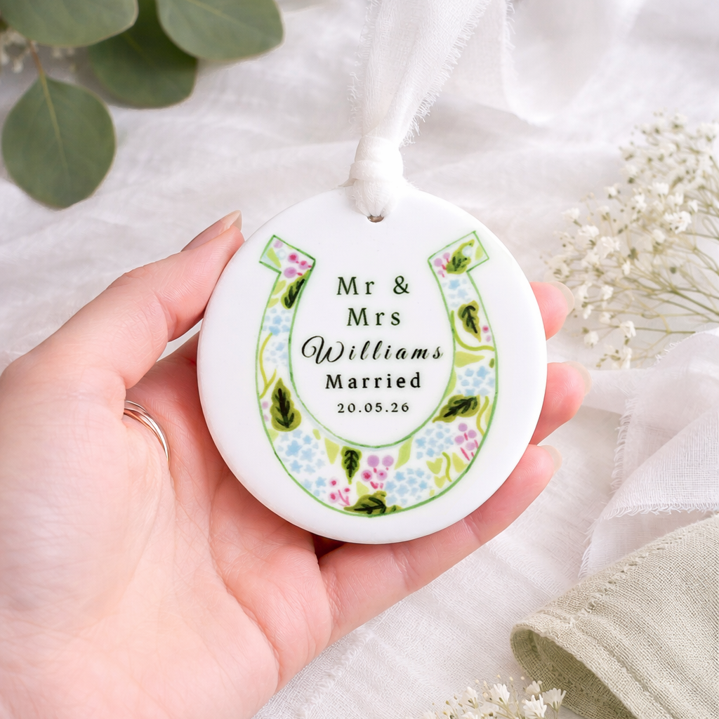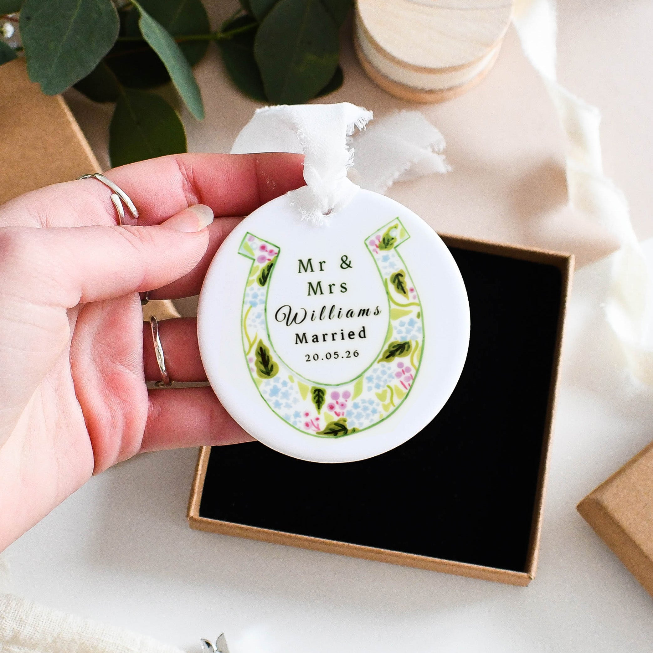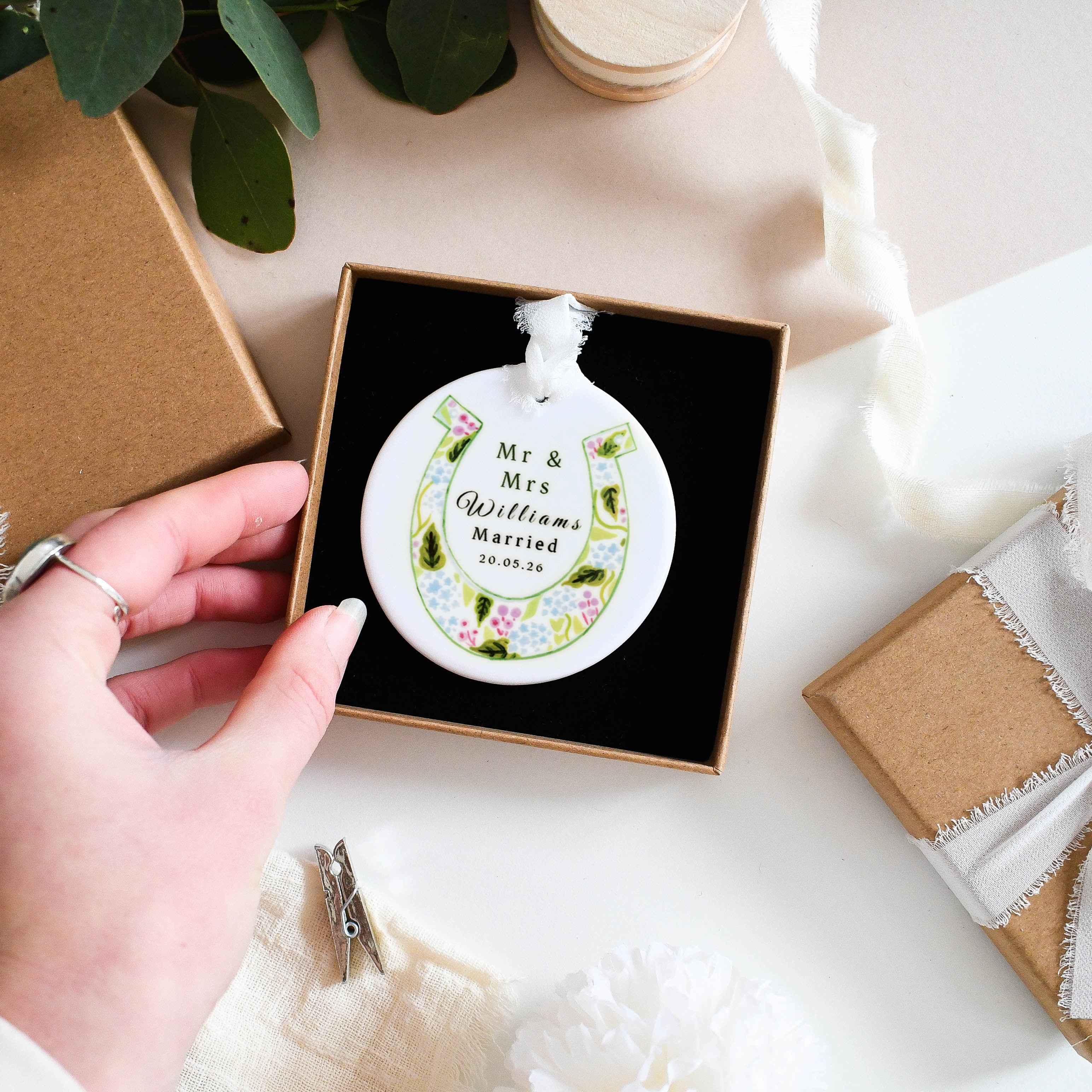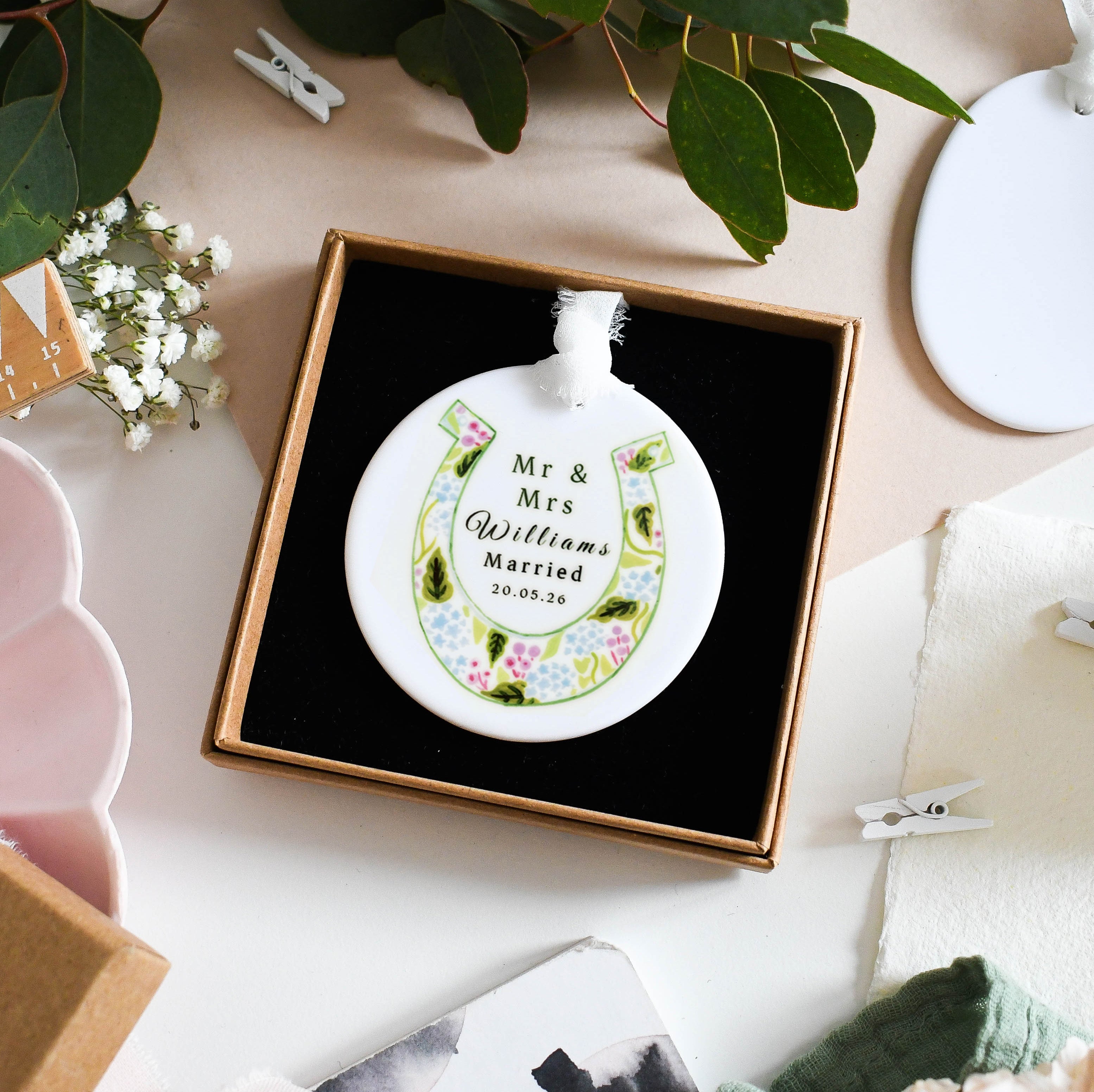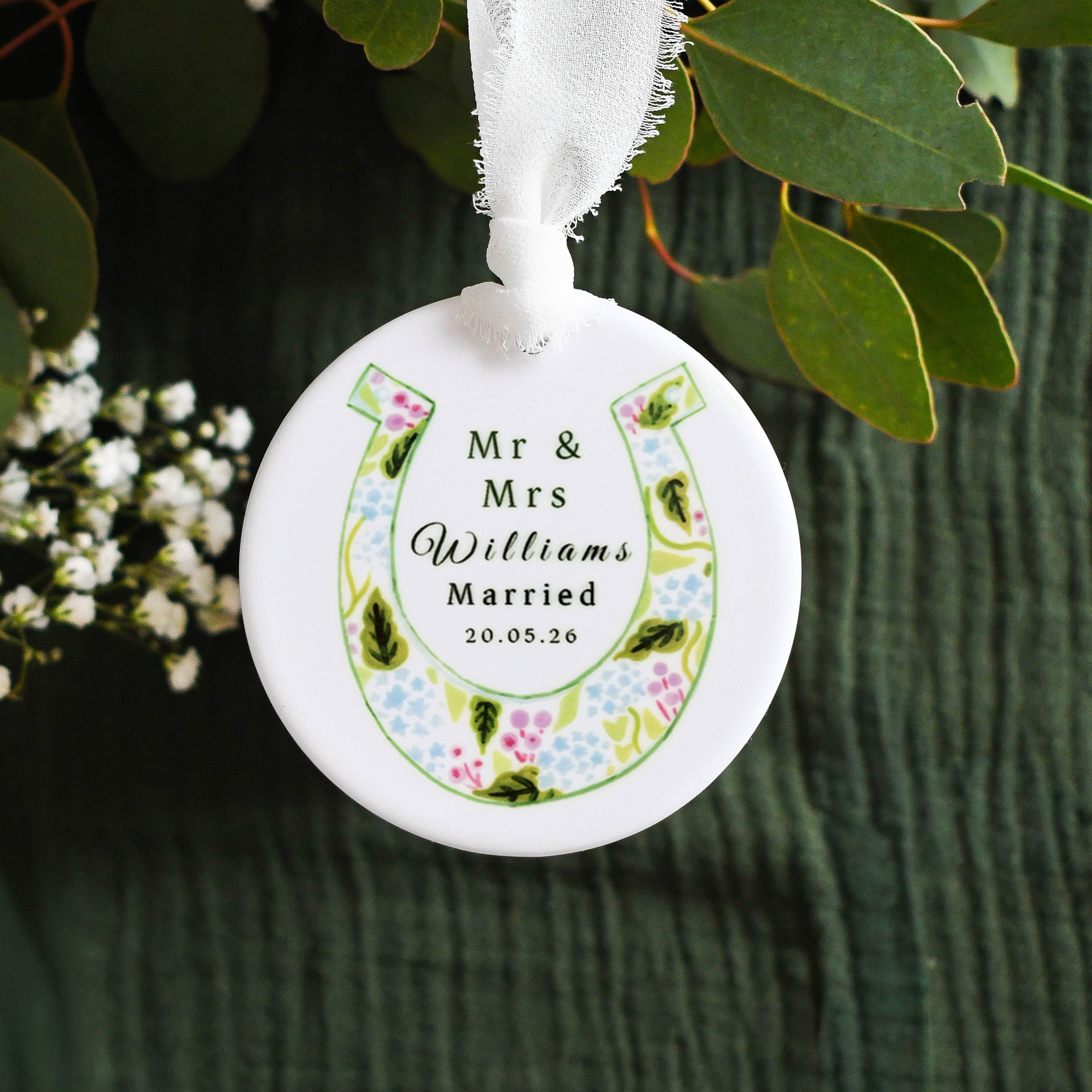 This personalised wedding ornament is a meaningful keepsake to celebrate a couple’s special day. Featuring a beautifully illustrated horseshoe filled with delicate floral details, a traditional symbol of love and good luck, each ornament is customised with the couple’s names and wedding date to create a lasting memento of their marriage. Finished with a soft ribbon for hanging, it makes a thoughtful gift for newlyweds and a lovely decoration to treasure for years to come.