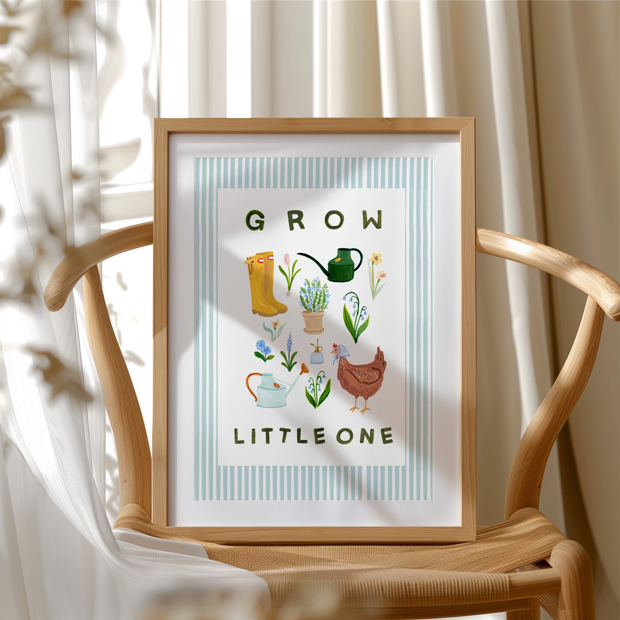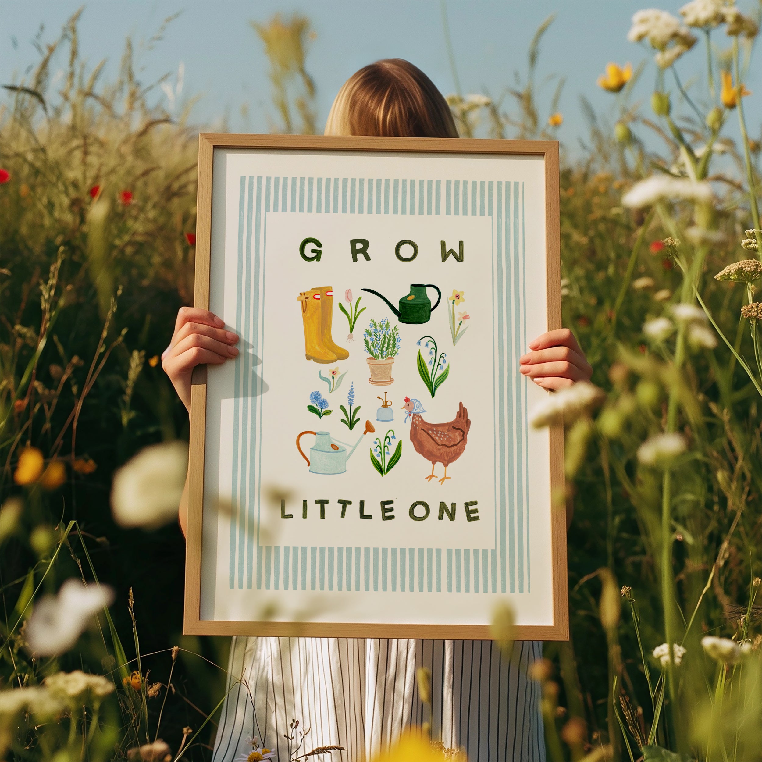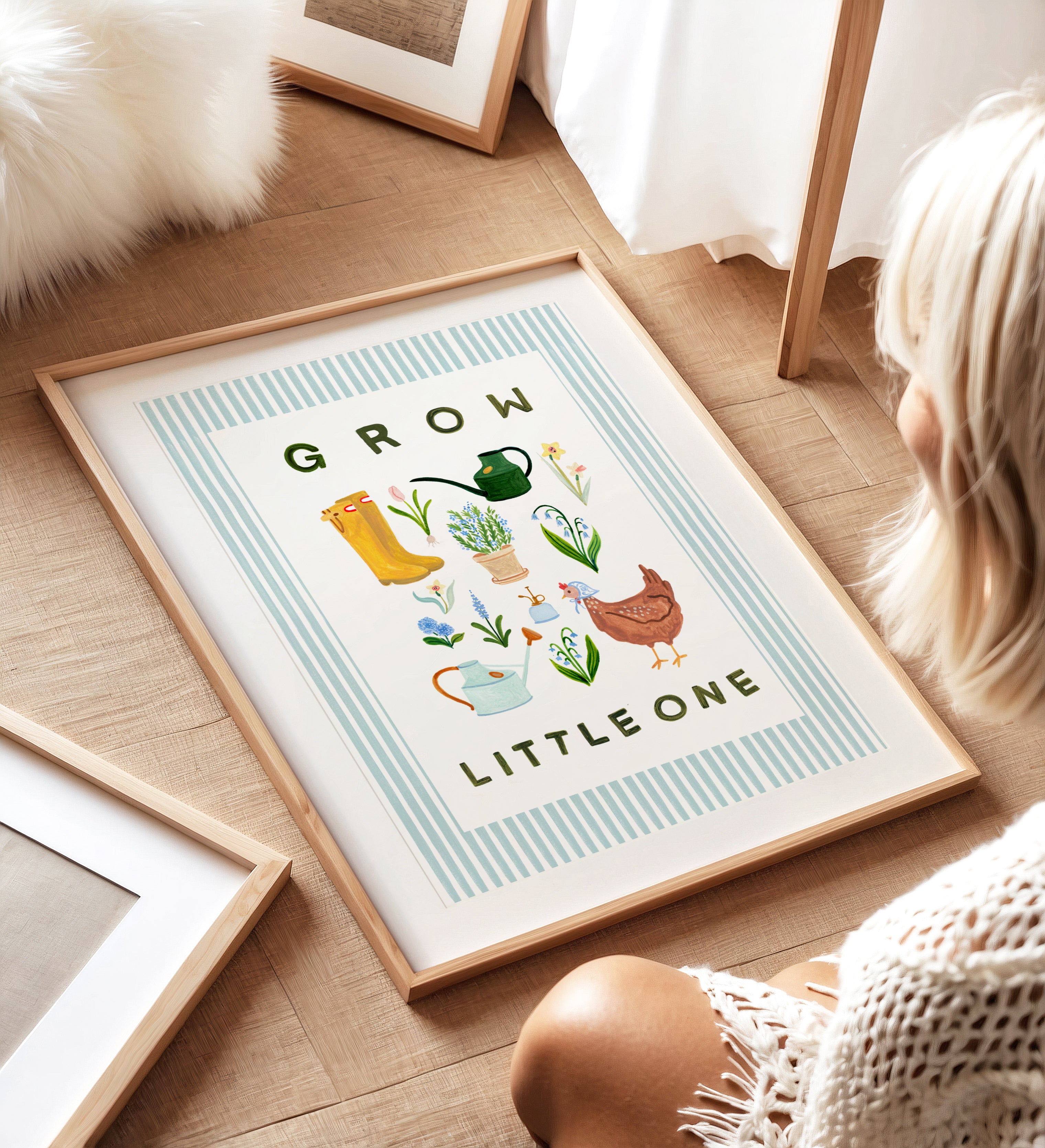 “Grow Little One” kids wall art print featuring a soft, whimsical design with colourful details- perfect for nursery decor, toddler bedrooms, and cottagecore-inspired playroom styling.