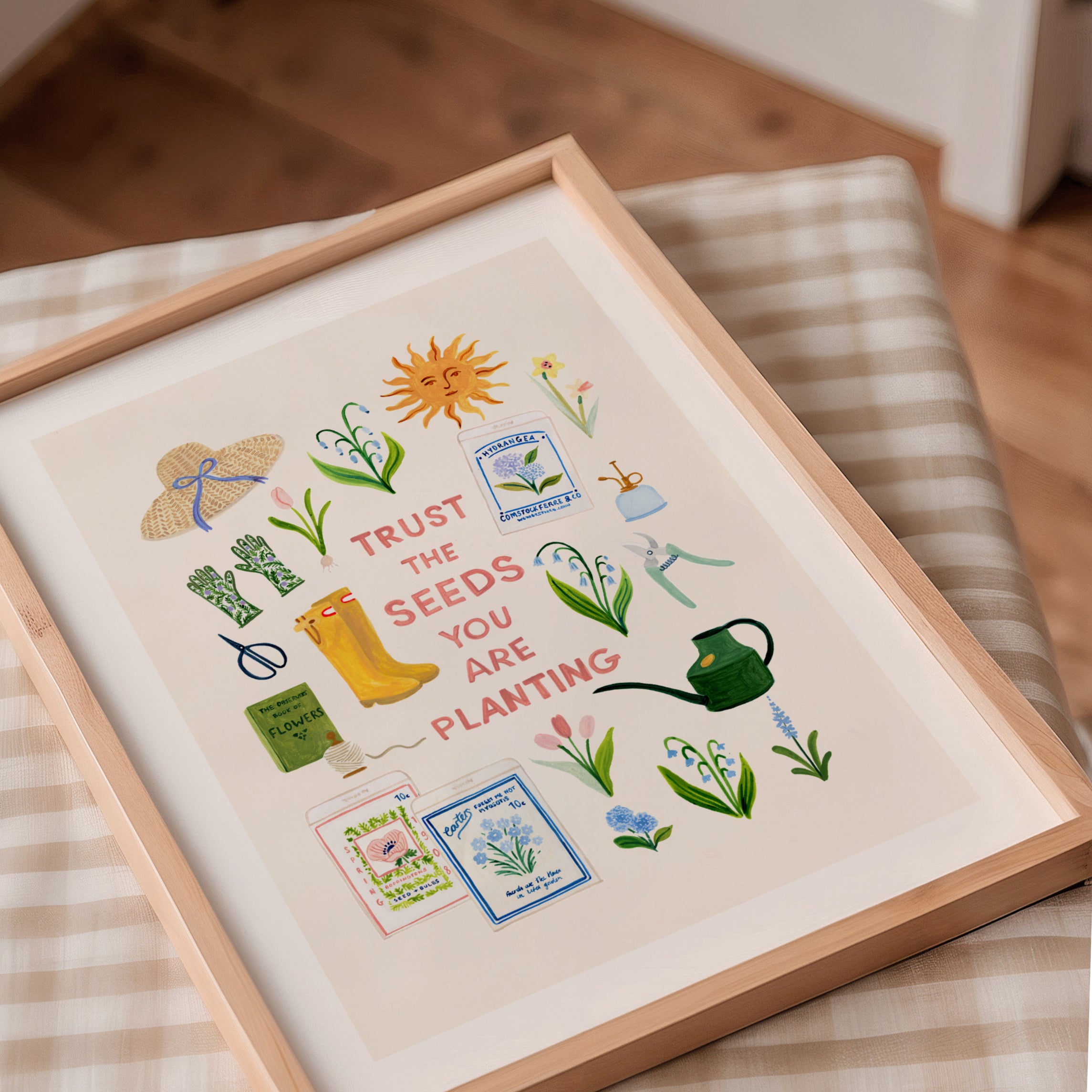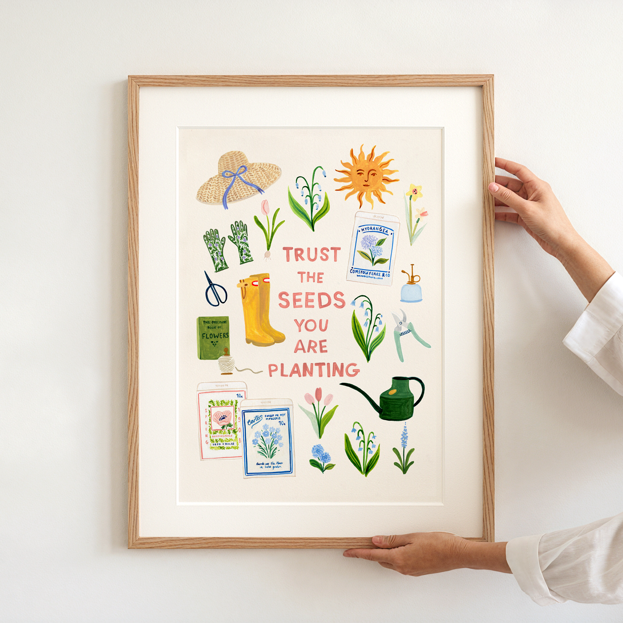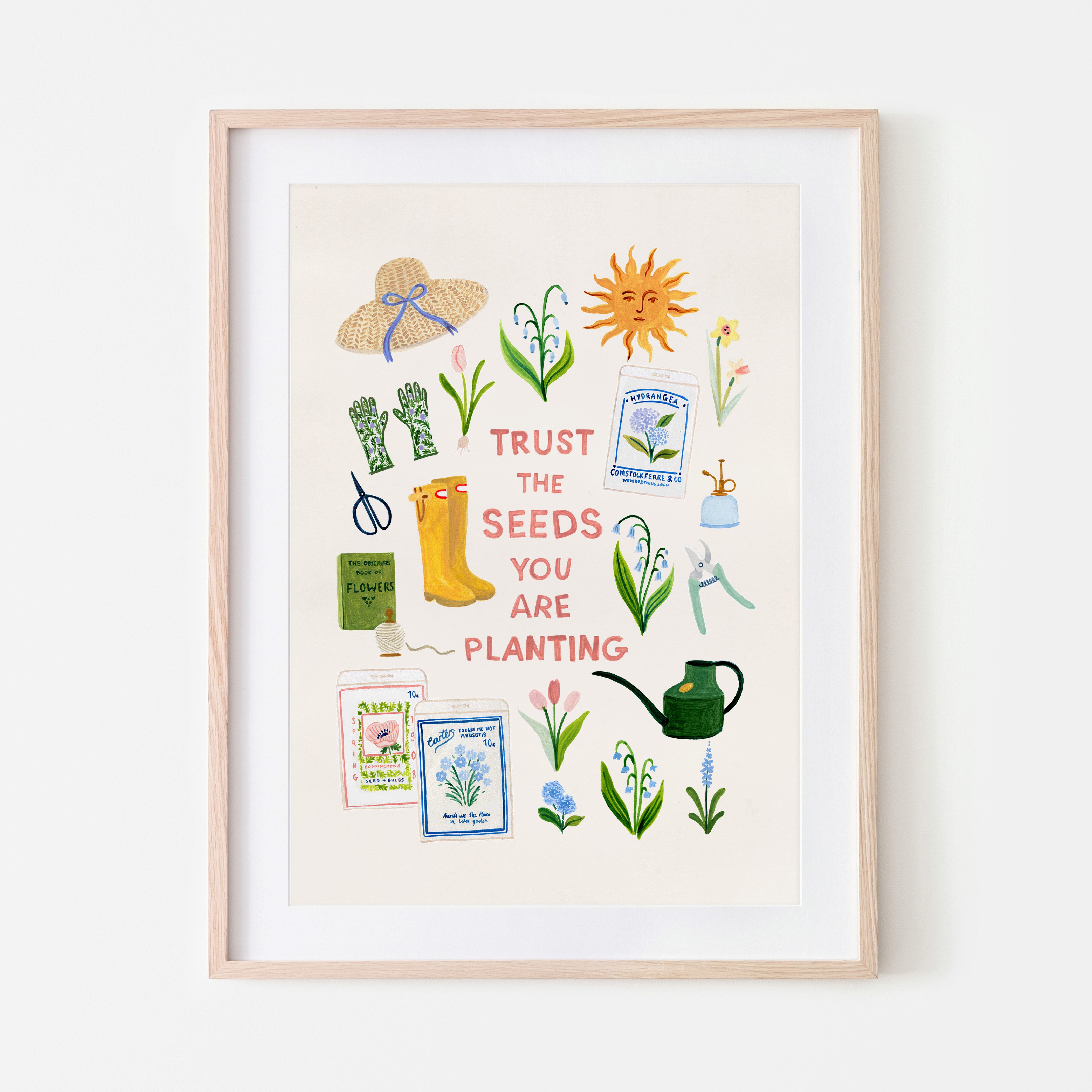 A gentle celebration of springtime in the garden, this illustrated print brings together blooming flowers, seed packets, and well-loved gardening tools around the hopeful phrase “Trust the seeds you are planting.”