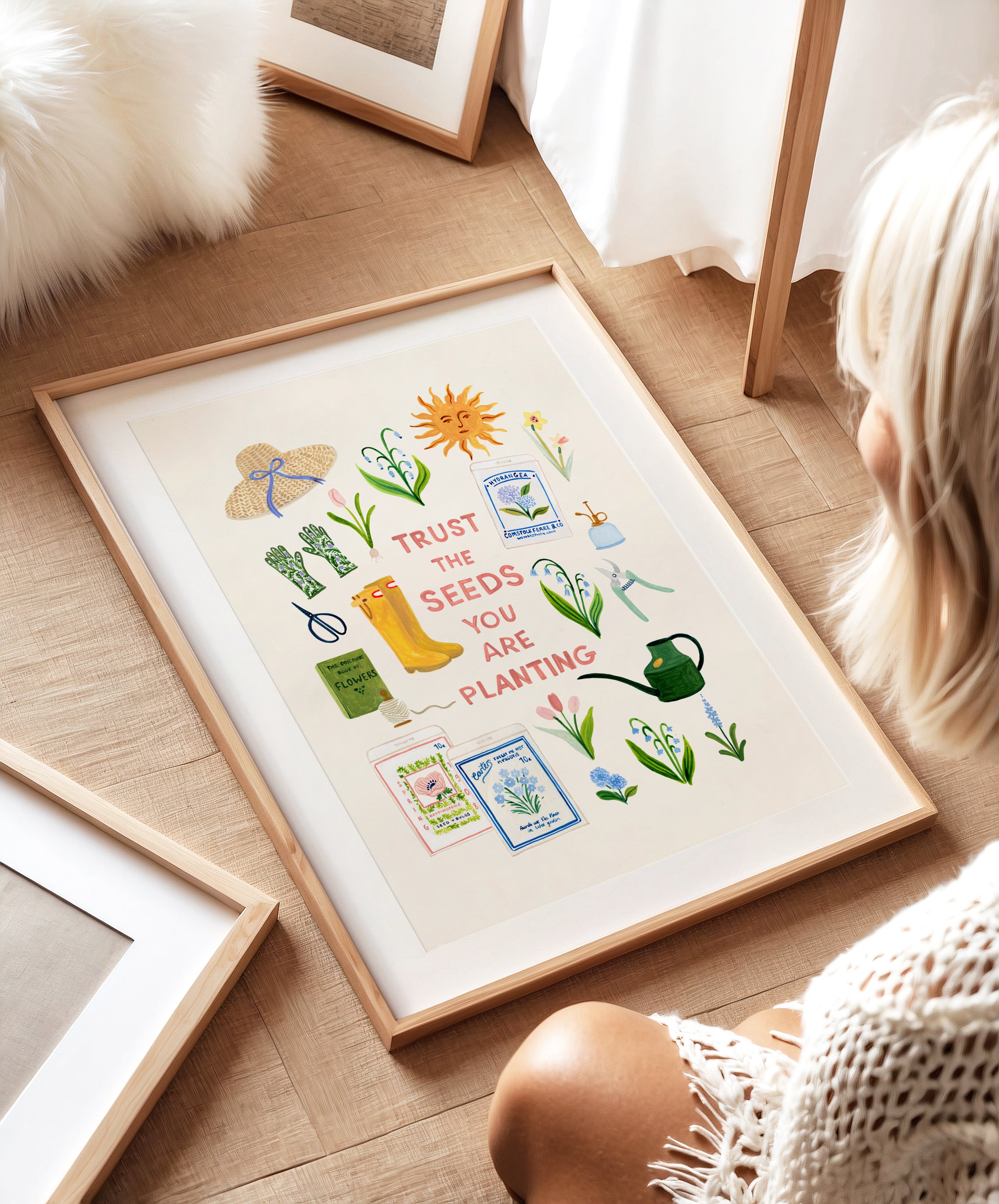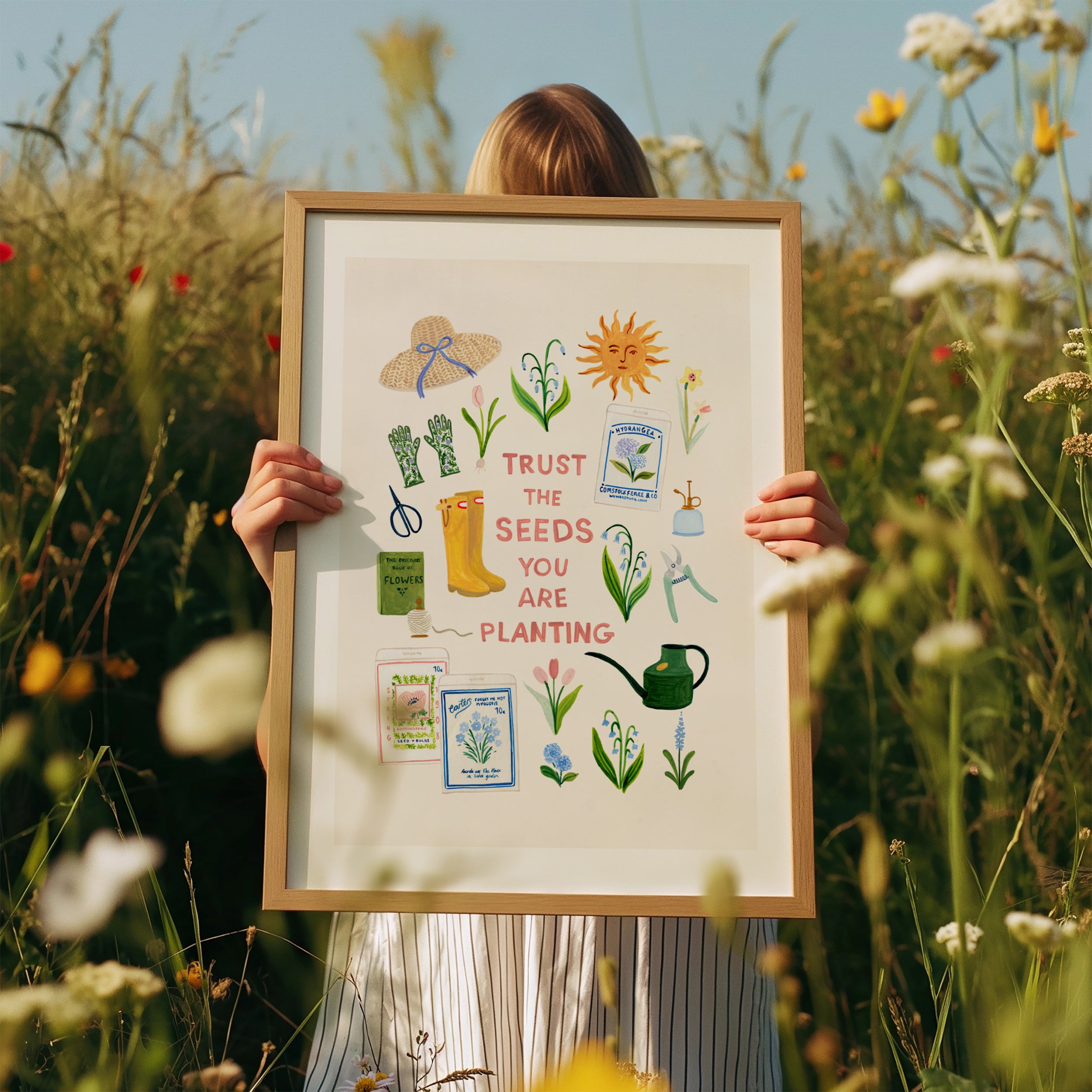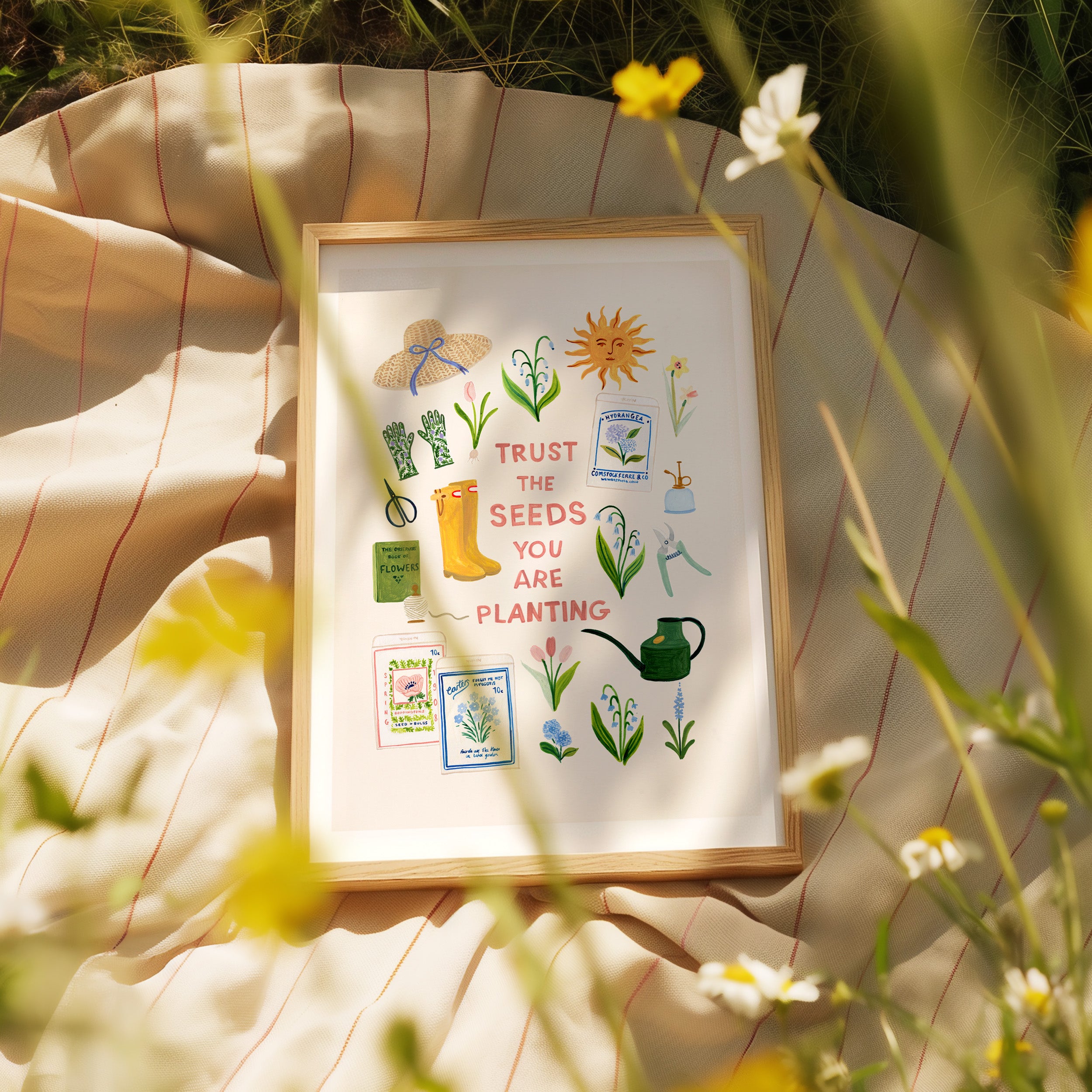 A gentle celebration of springtime in the garden, this illustrated print brings together blooming flowers, seed packets, and well-loved gardening tools around the hopeful phrase “Trust the seeds you are planting.”